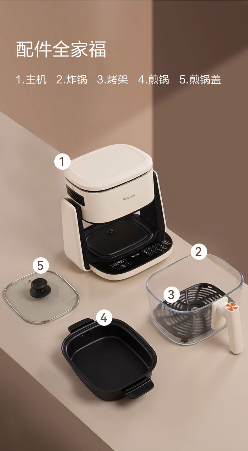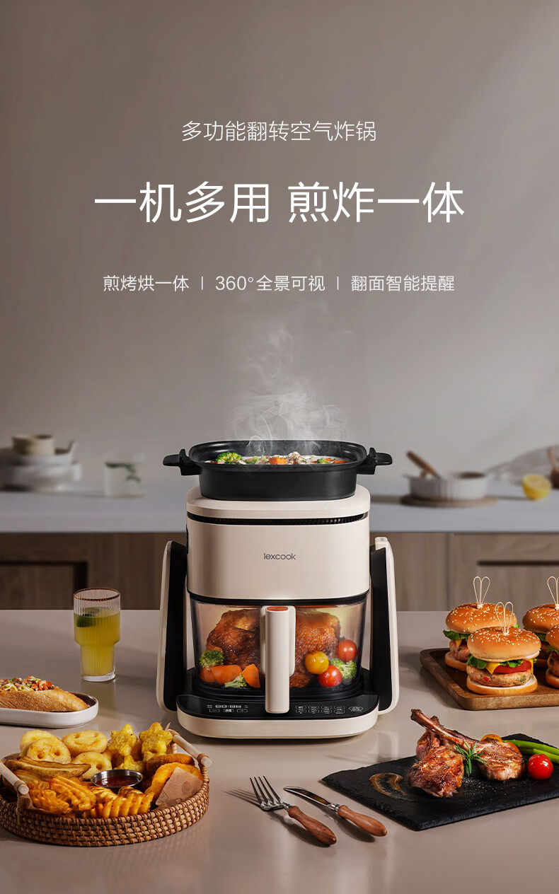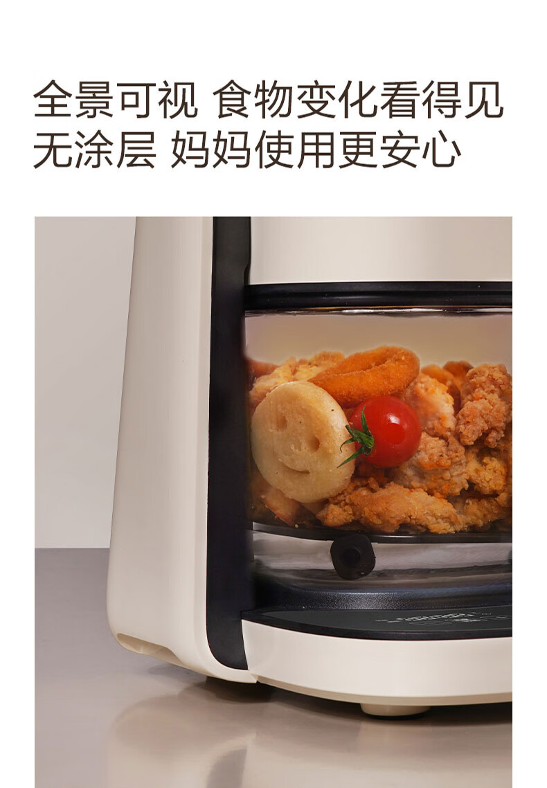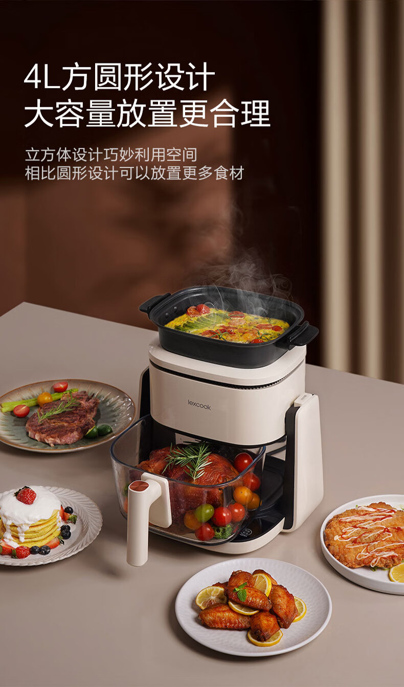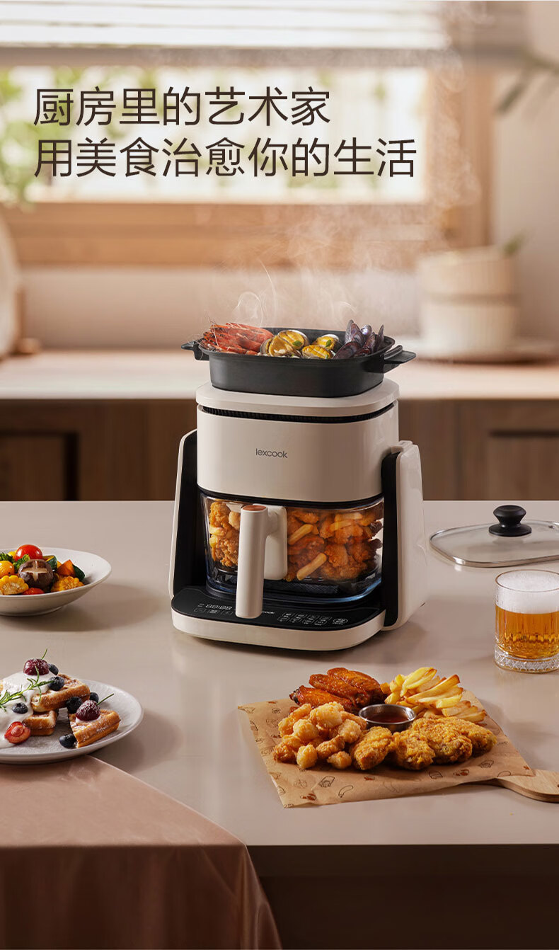 Lexcook空气炸锅家用全自动4L大容量无油低脂电炸锅煎烤一体可翻转透明可视玻璃大功率炸锅 奶白色 4L