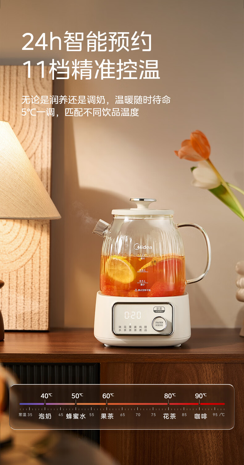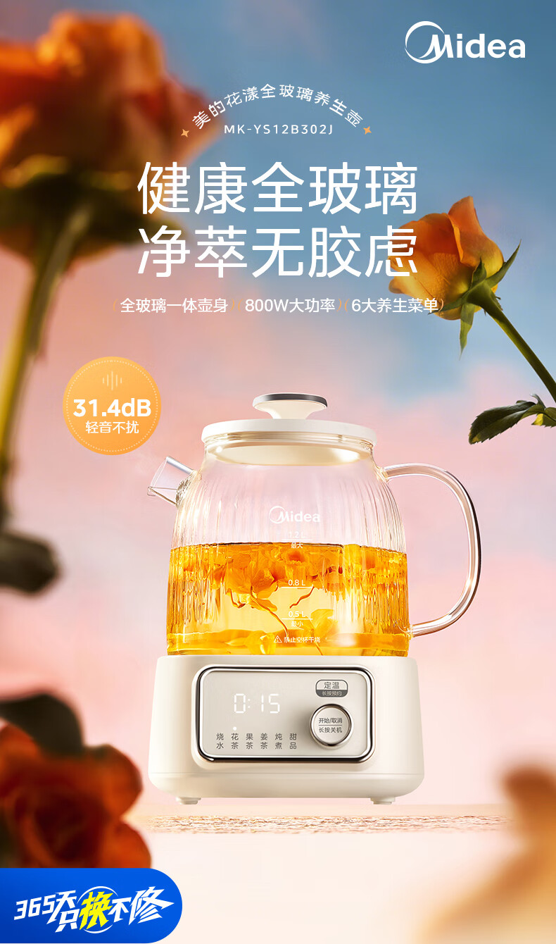 美的(Midea)0胶水全玻璃全自动养生壶 1.2L大容量办公室多功能茶漏煮茶壶 烧水壶24h恒温可煮小米 1.2L 0胶水全玻璃带滤网MK-YS12B102
