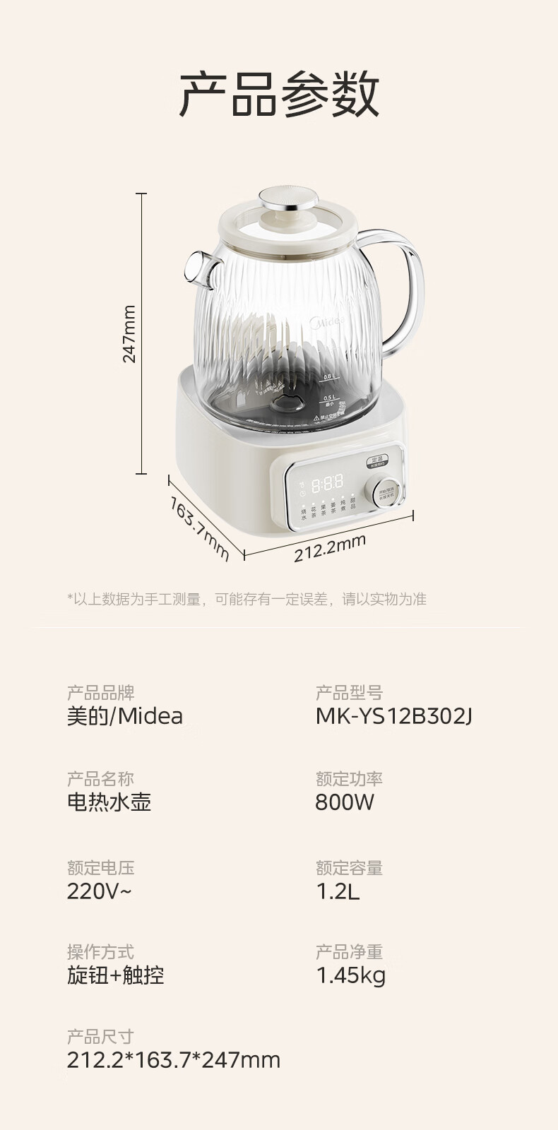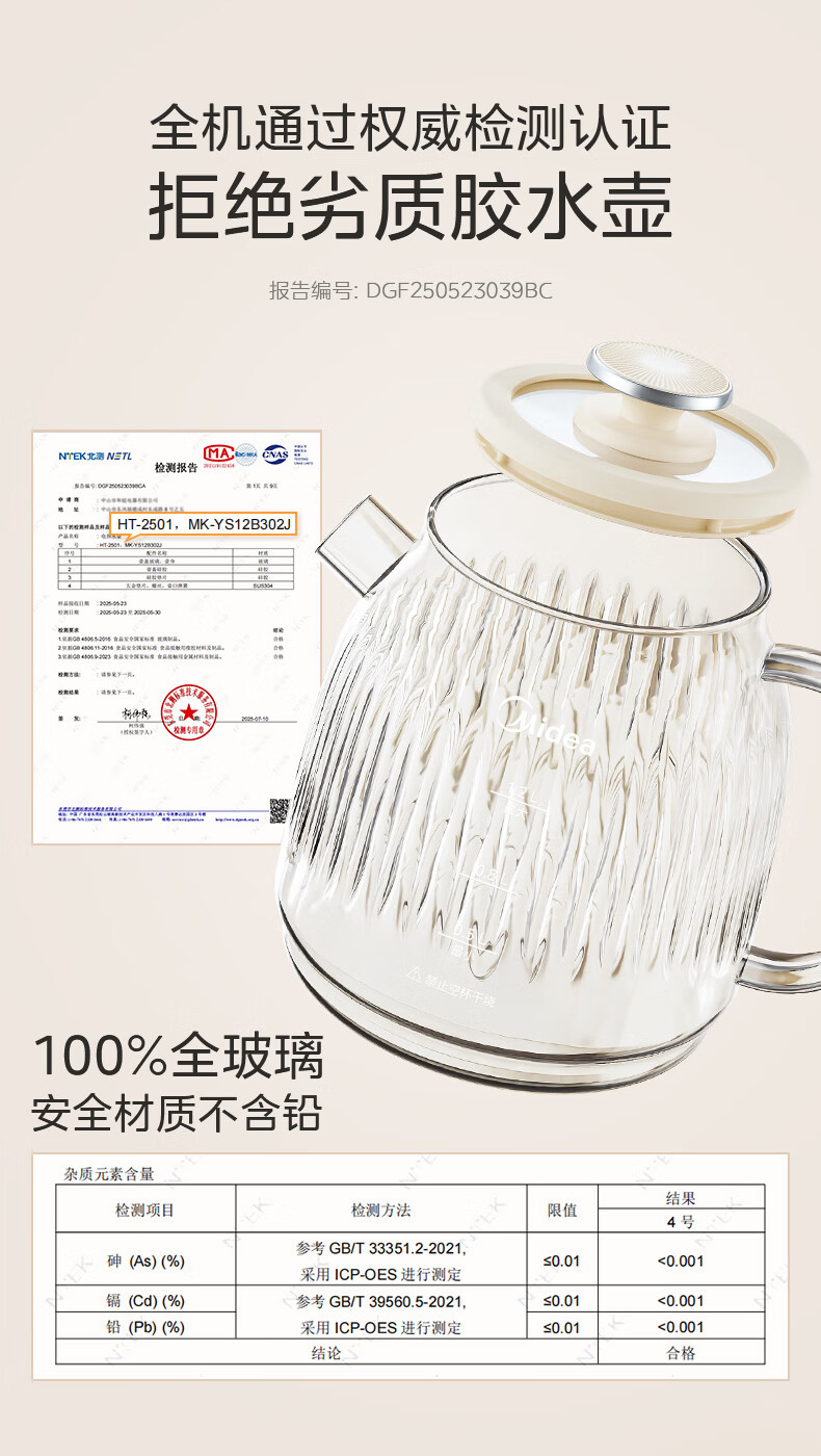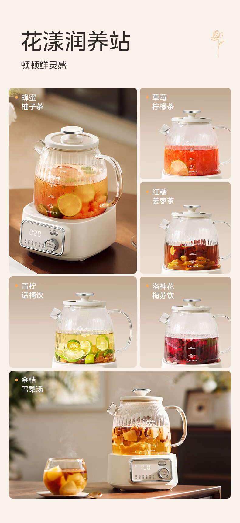 美的全玻璃养生壶 办公室烧水壶 家用多功能煮茶壶 花茶煮茶器 迷你小型电热水壶 围炉煮茶壶 【全玻璃】0金属0胶水0涂层 1L