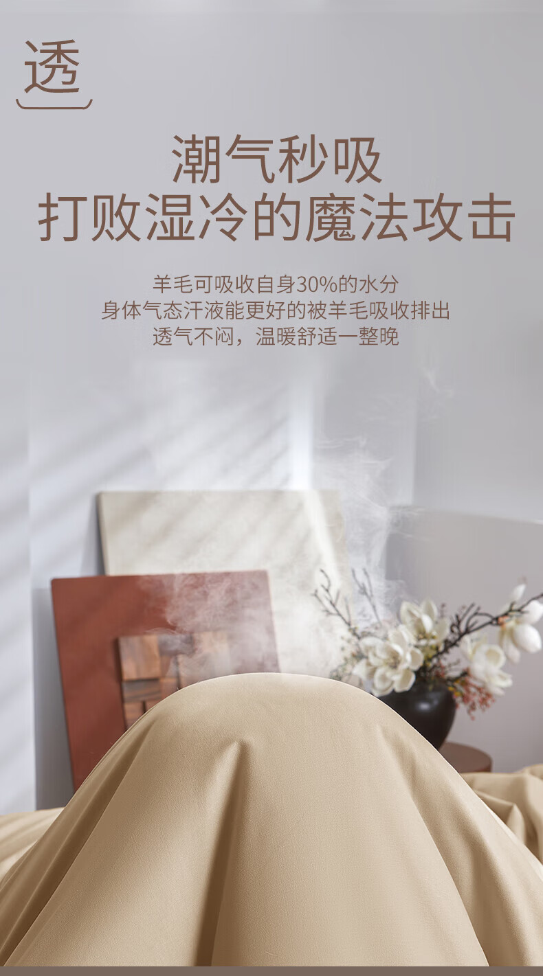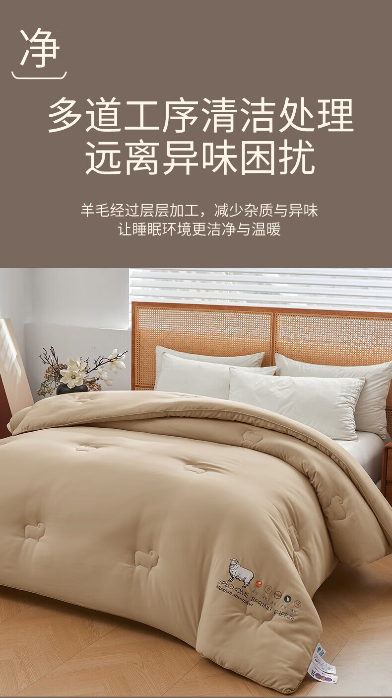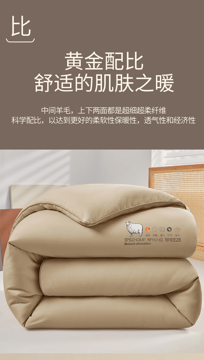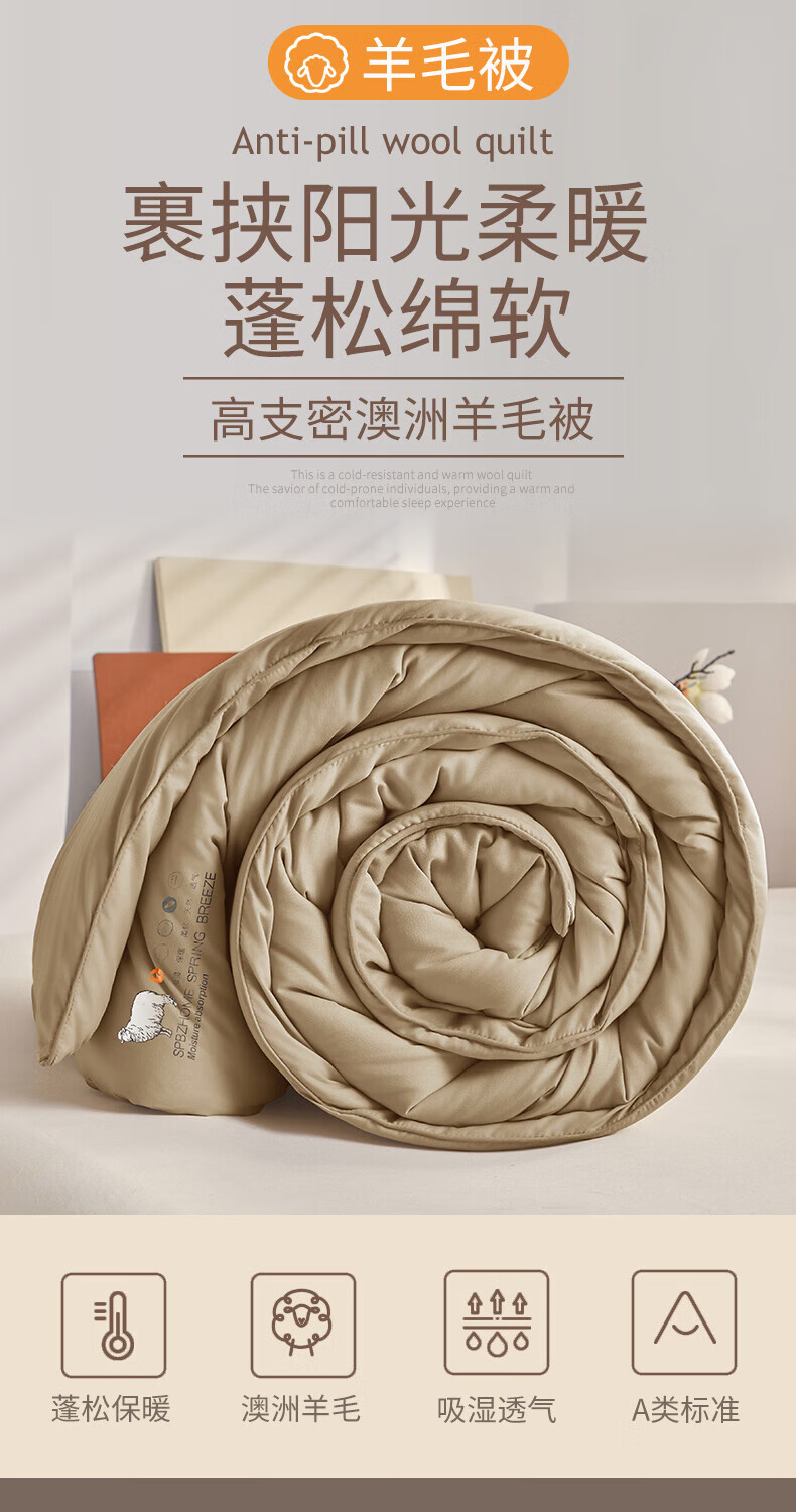 恒源祥羊毛被子冬被澳洲羊毛加厚超柔春秋被芯8-10斤厚冬被单人学生宿舍 纯色-卡其 1.5*2.0米【4斤夏被】