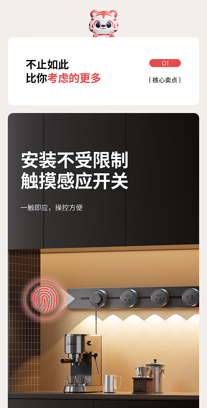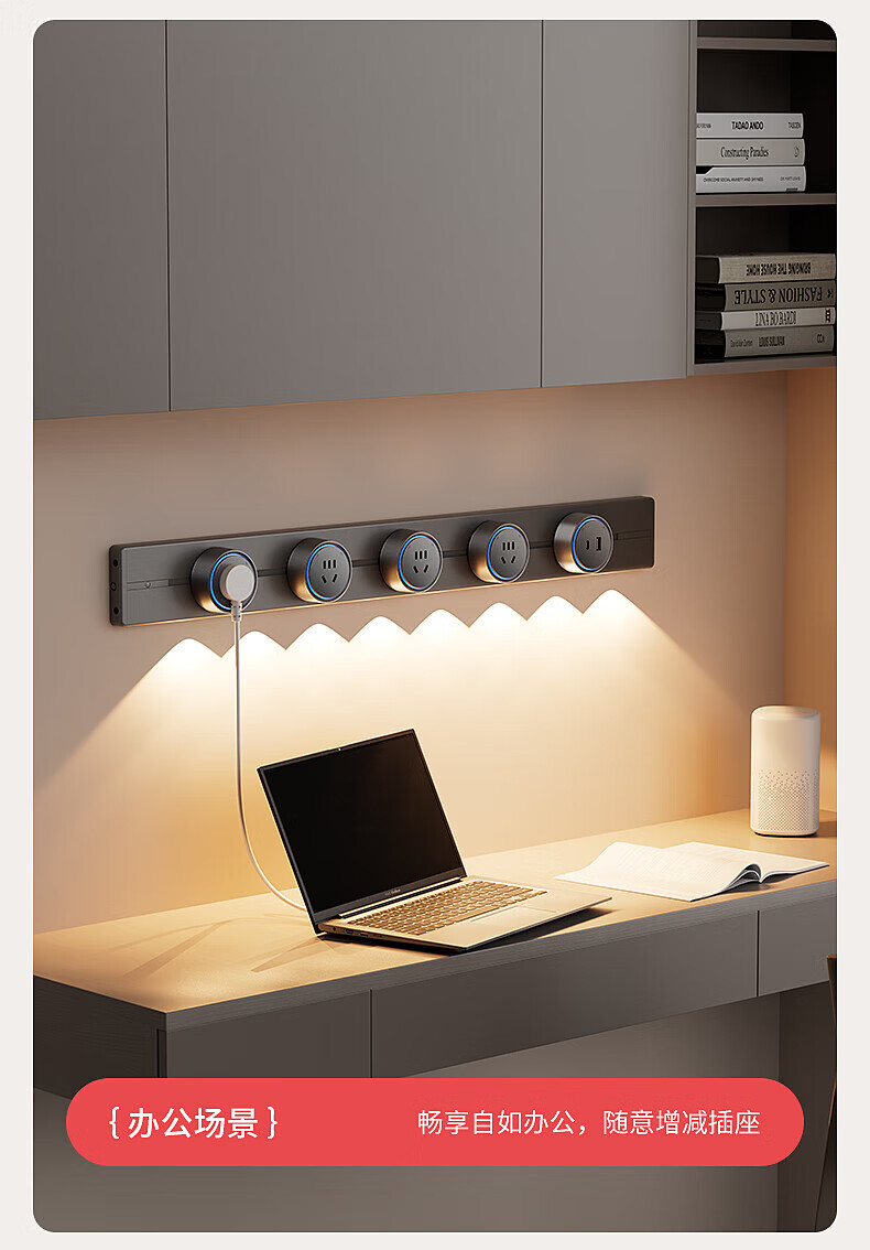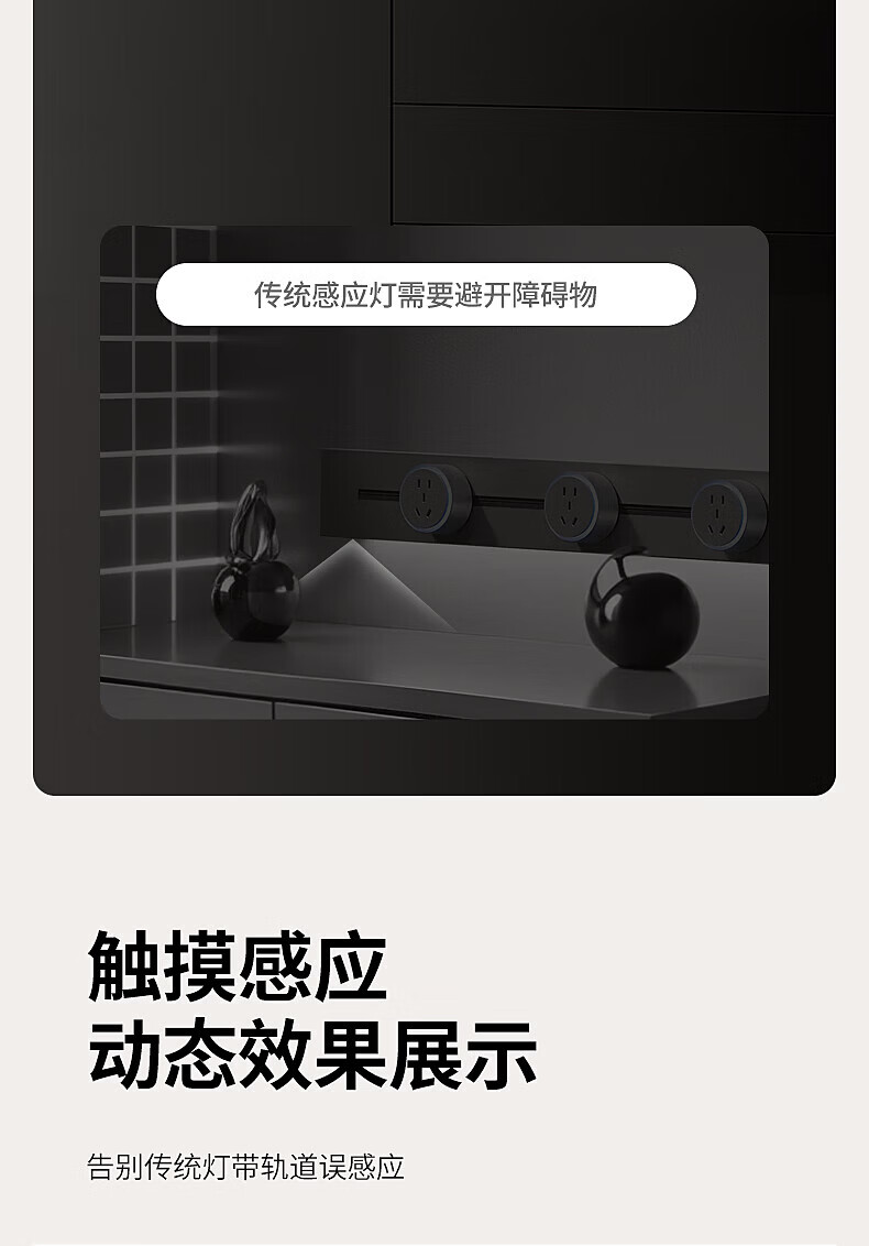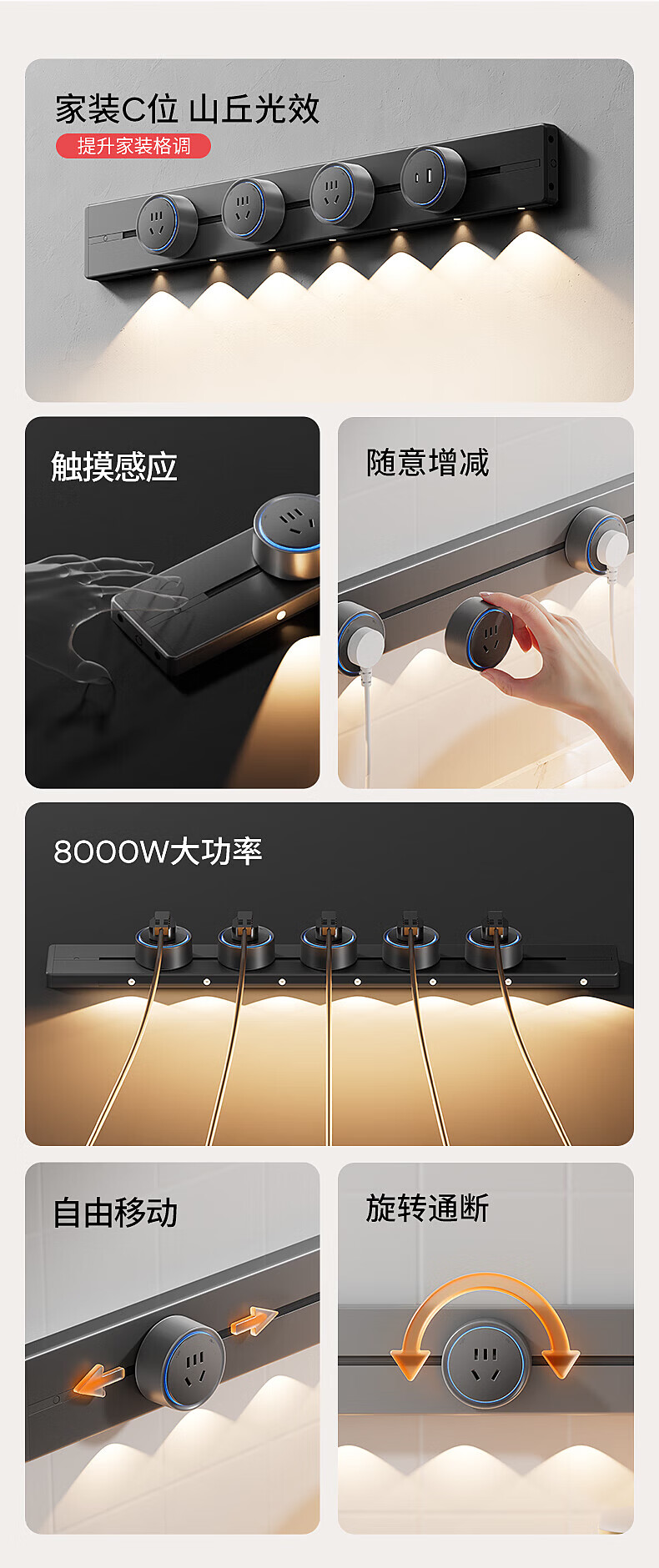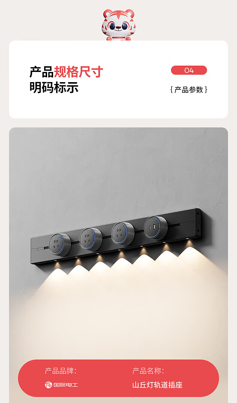国际电工明装触摸感应灯轨道插座可移动家用厨房客厅导轨插座大功率滑轨插 暗夜黑 50CM山丘感应灯轨道+3个五孔