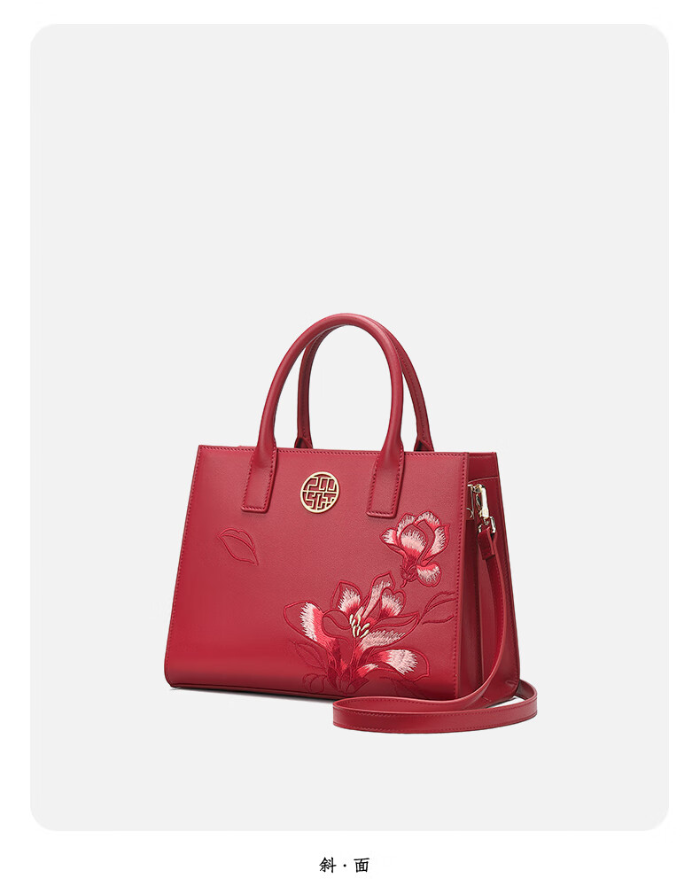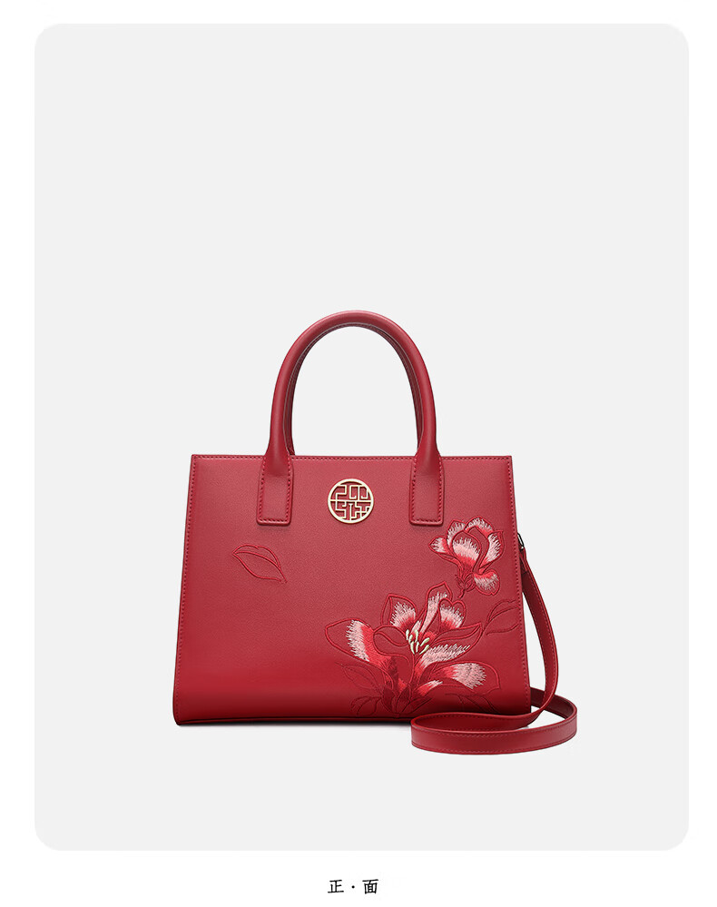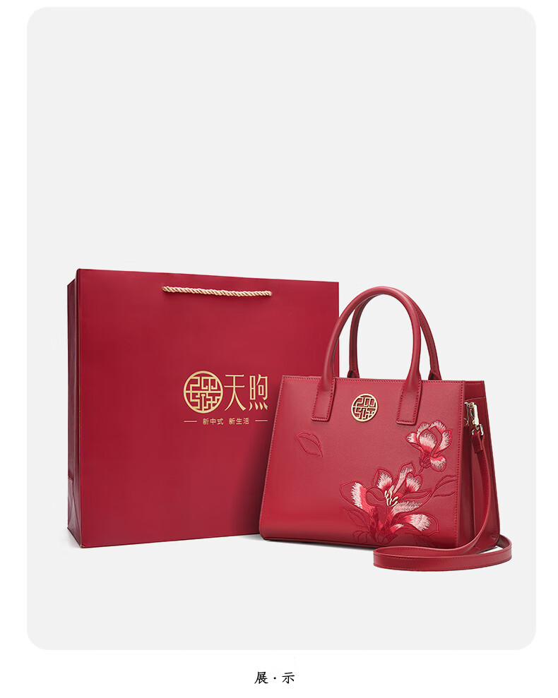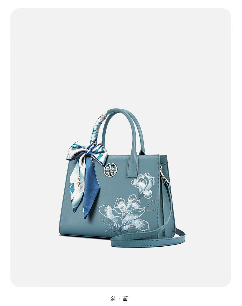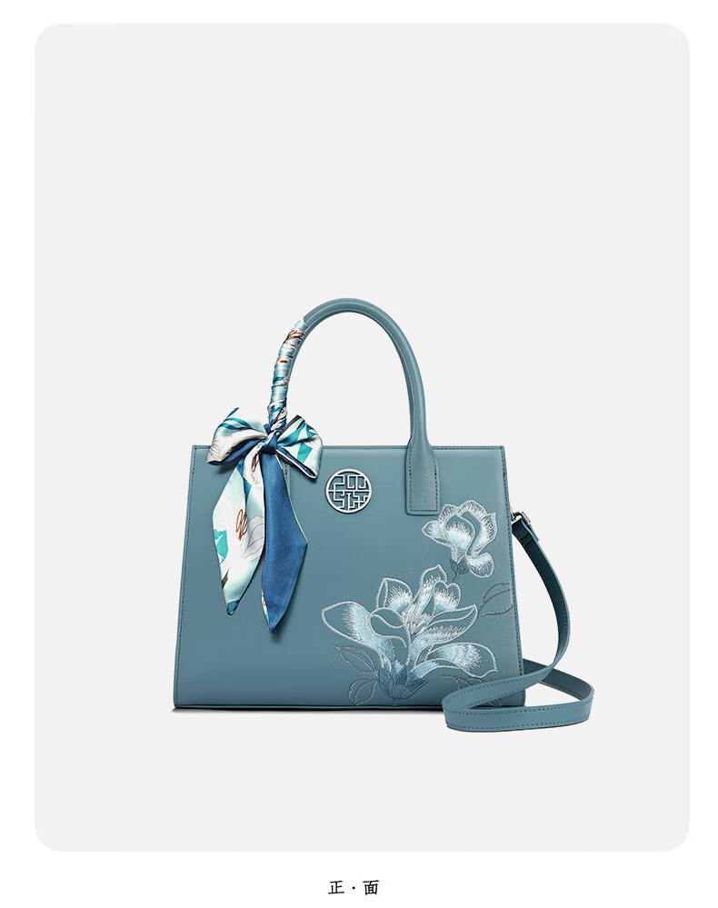 天煦女包刺绣手提包牛皮大包中年婆婆包单肩旗袍包送丈母娘礼物妈妈包 蓝绿色-送礼品袋