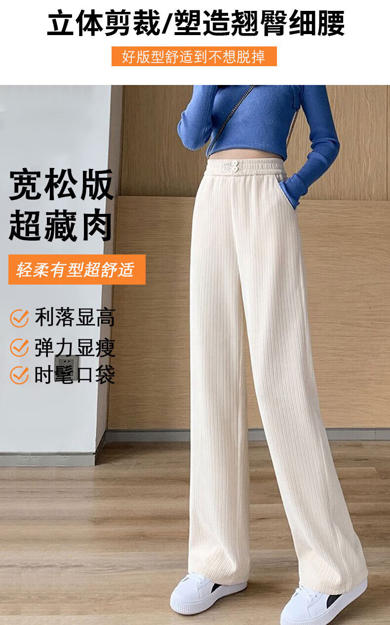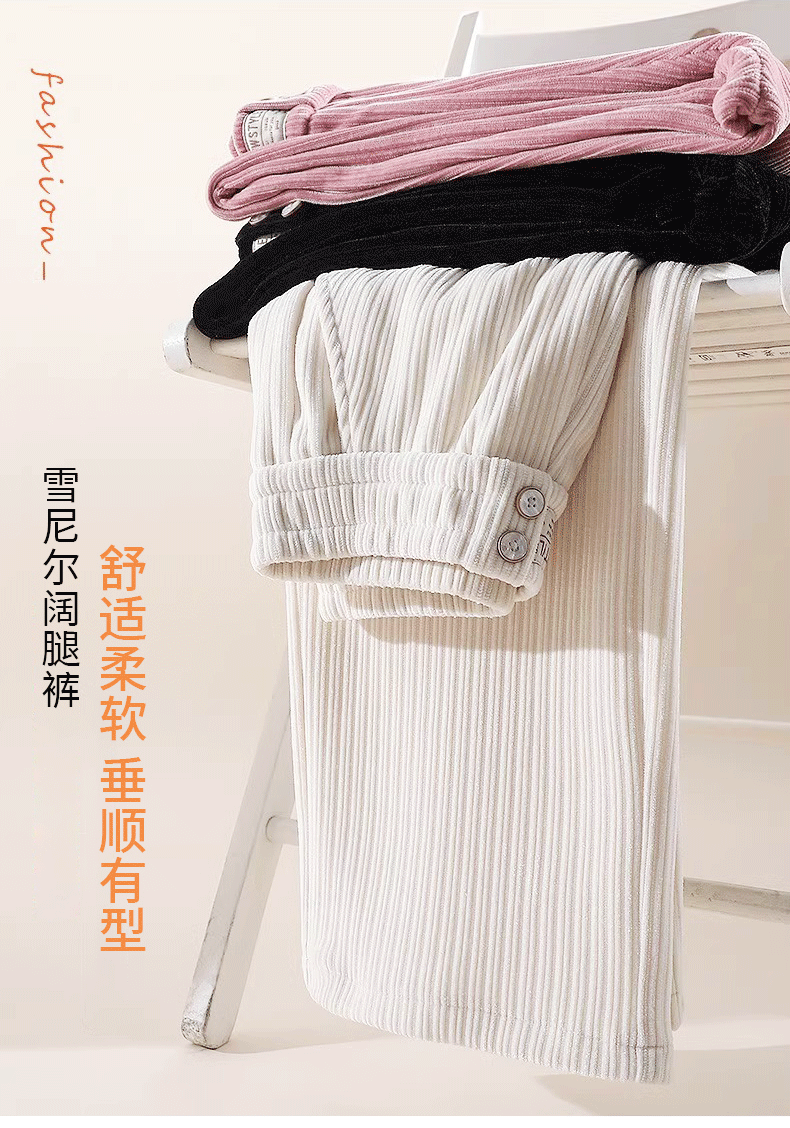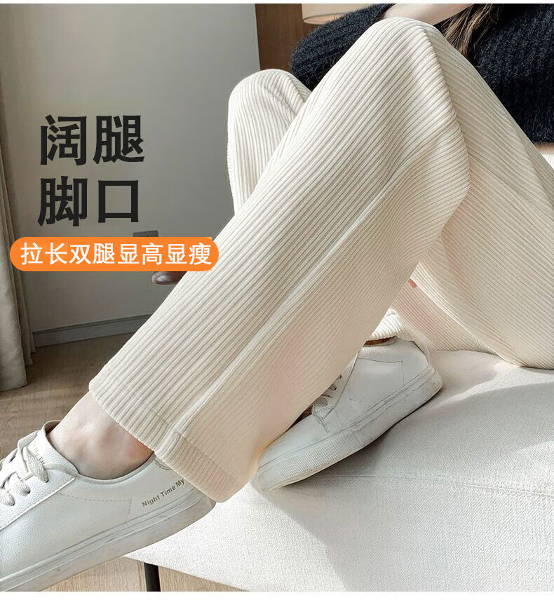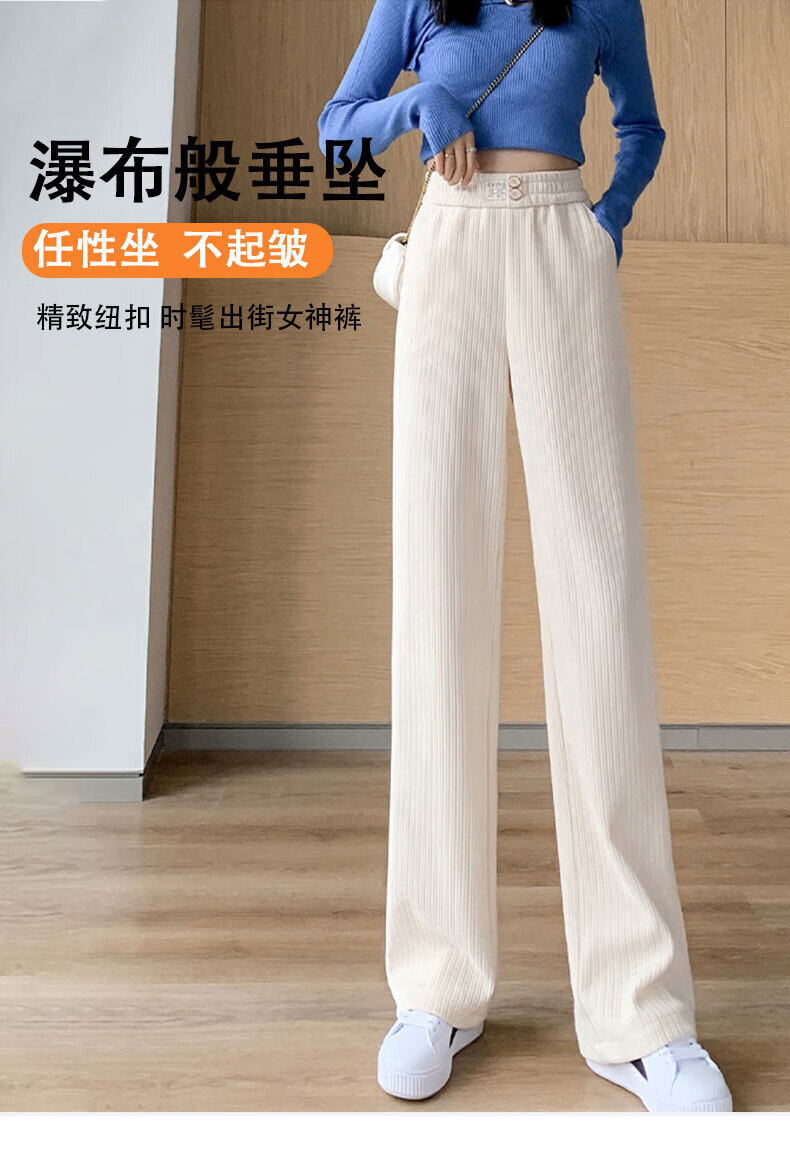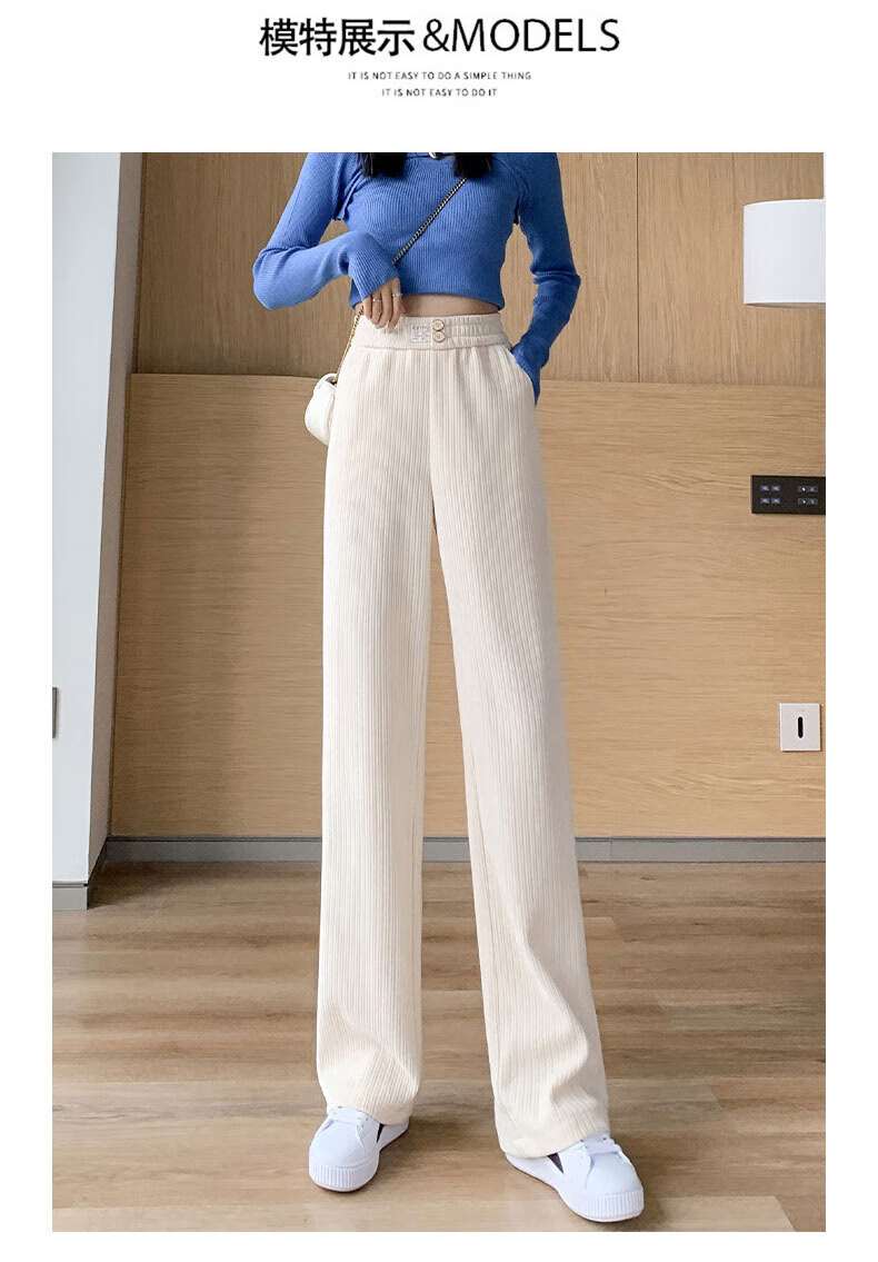 浪莎雪尼尔阔腿裤女秋冬季新款加绒加厚高腰直筒裤宽松垂感休闲裤子女 米白色 -冬季加绒 M (推荐101斤-110斤)