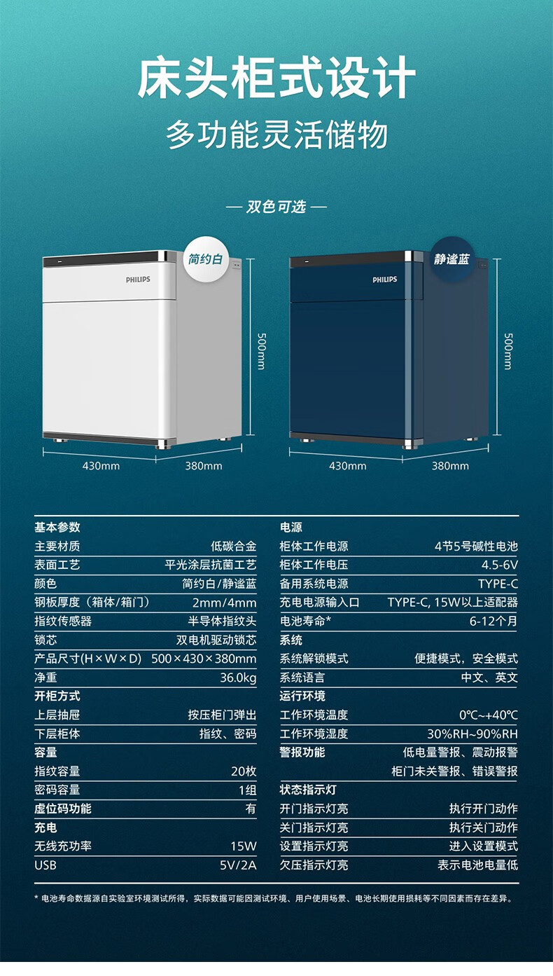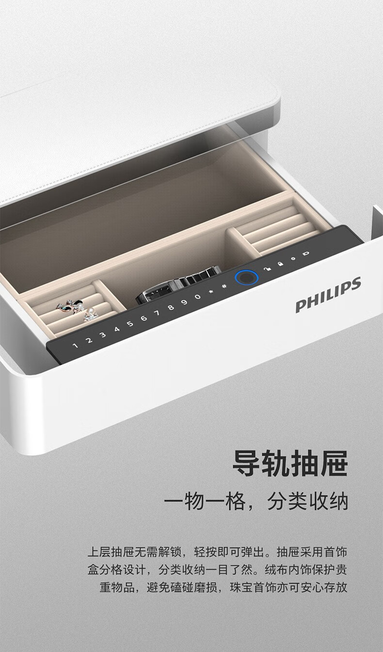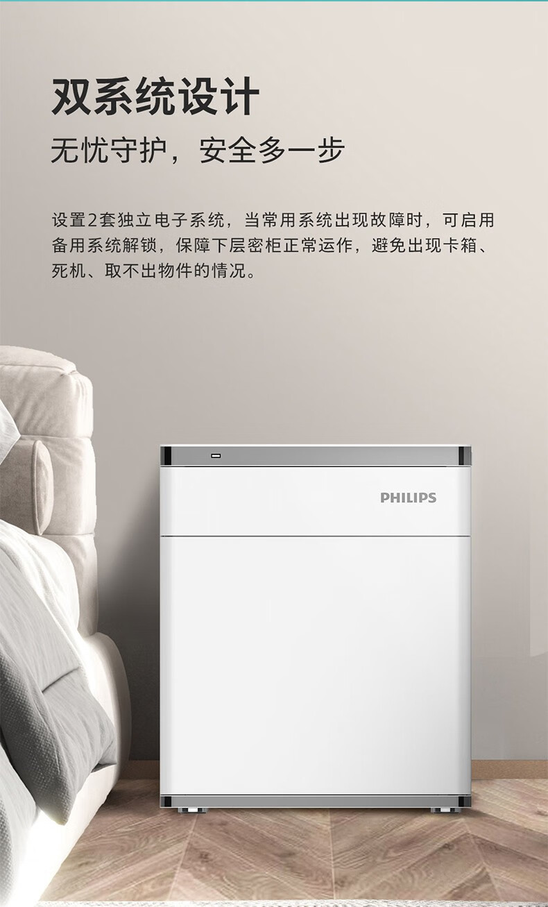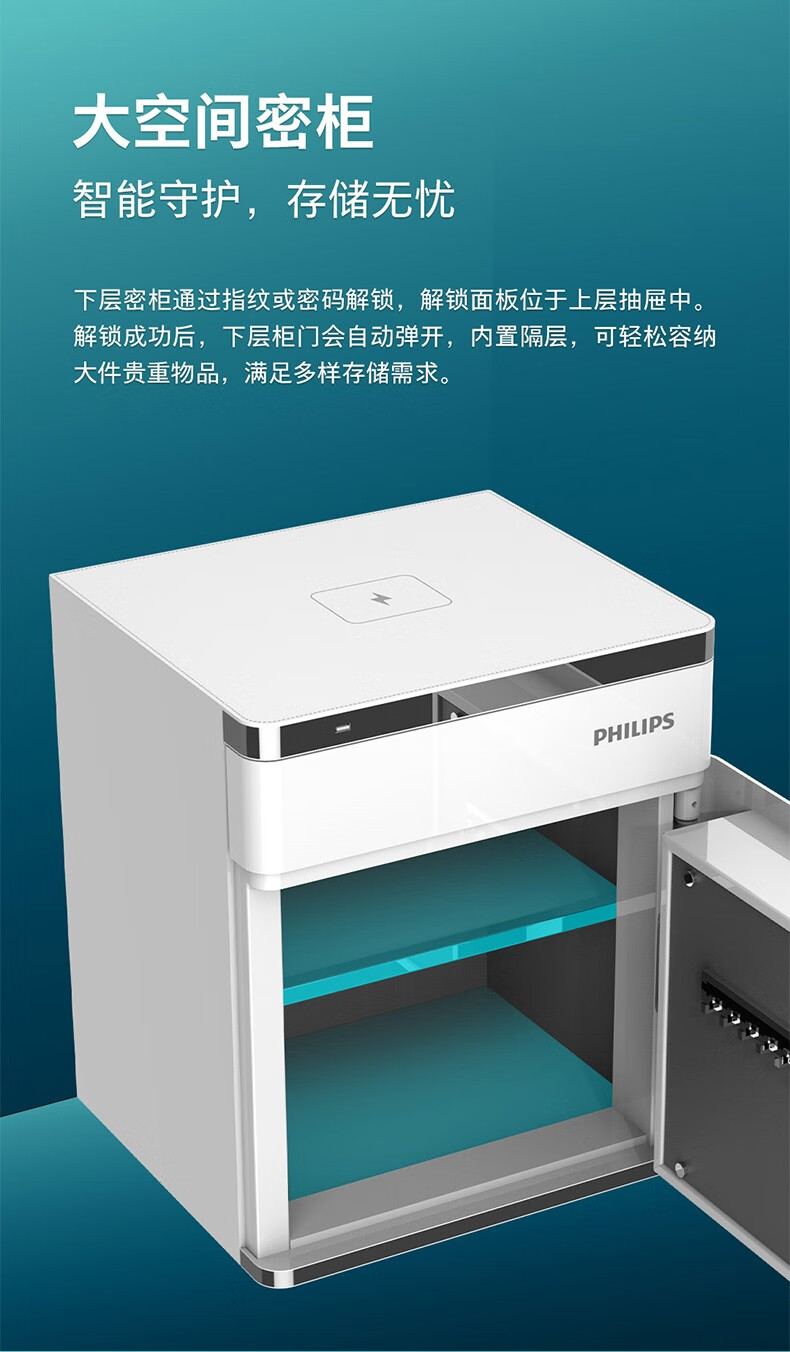 飞利浦保险柜50cm高 可无线充电 指纹保险箱电子密码保管箱家用小型床头入衣柜式保管箱智能保管盒 皓月白