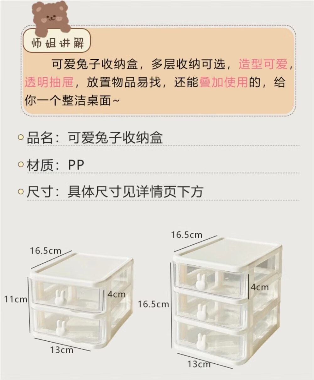 赞婴美收纳卡通桌面盒透明小抽屉式书桌塑料迷你储物盒兔子文具整理盒 桌面收纳3层1套【颜色随机发货】