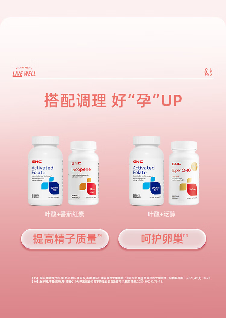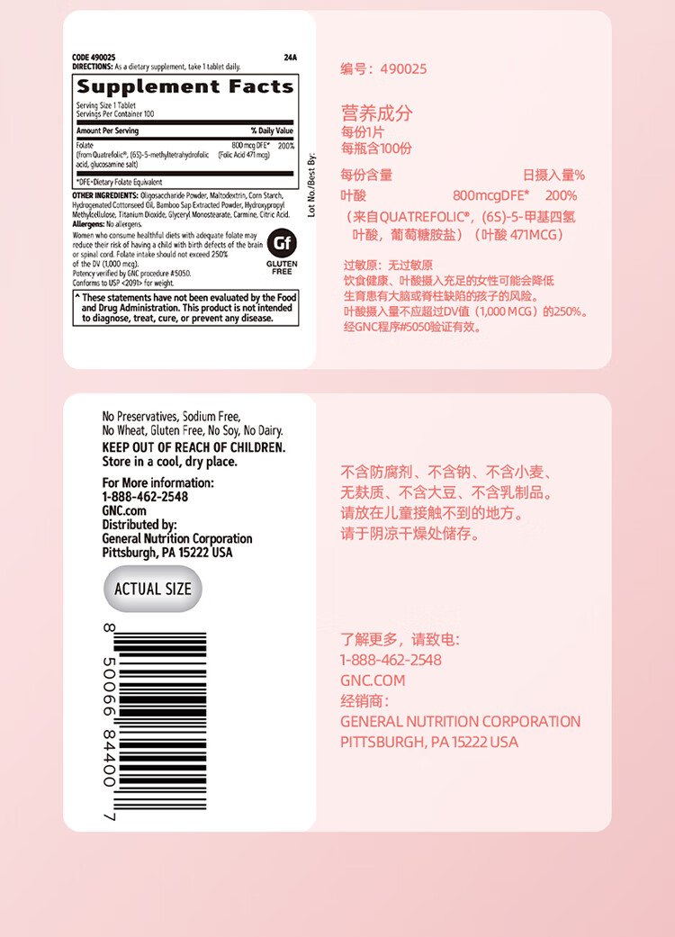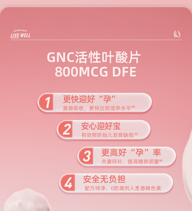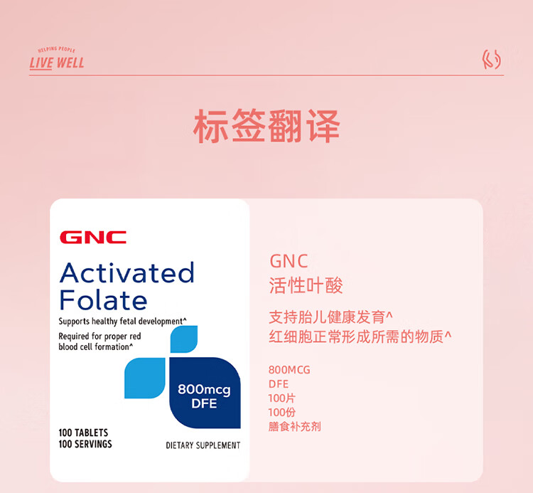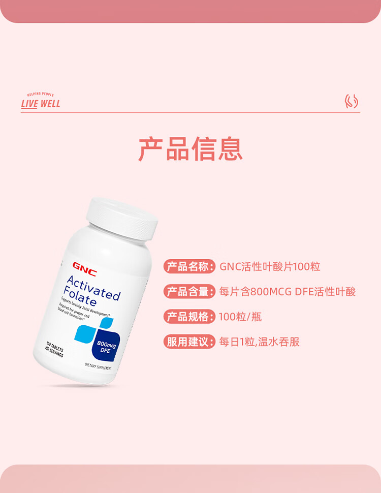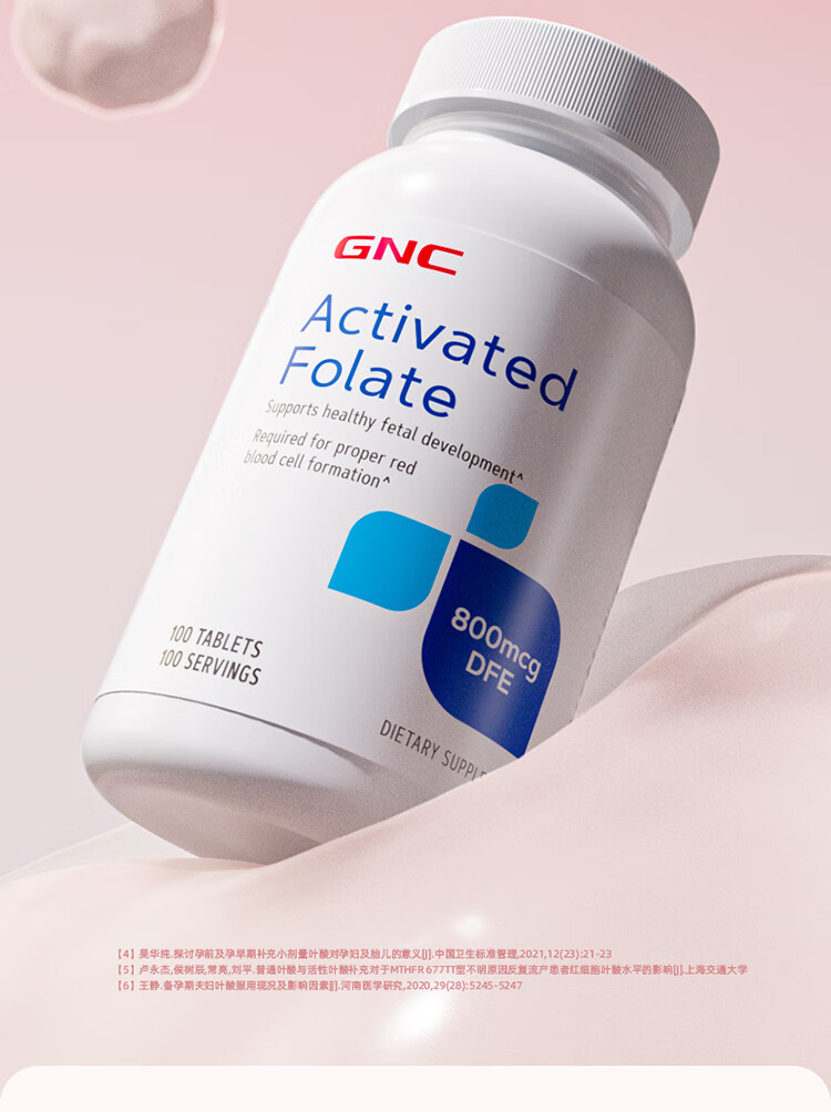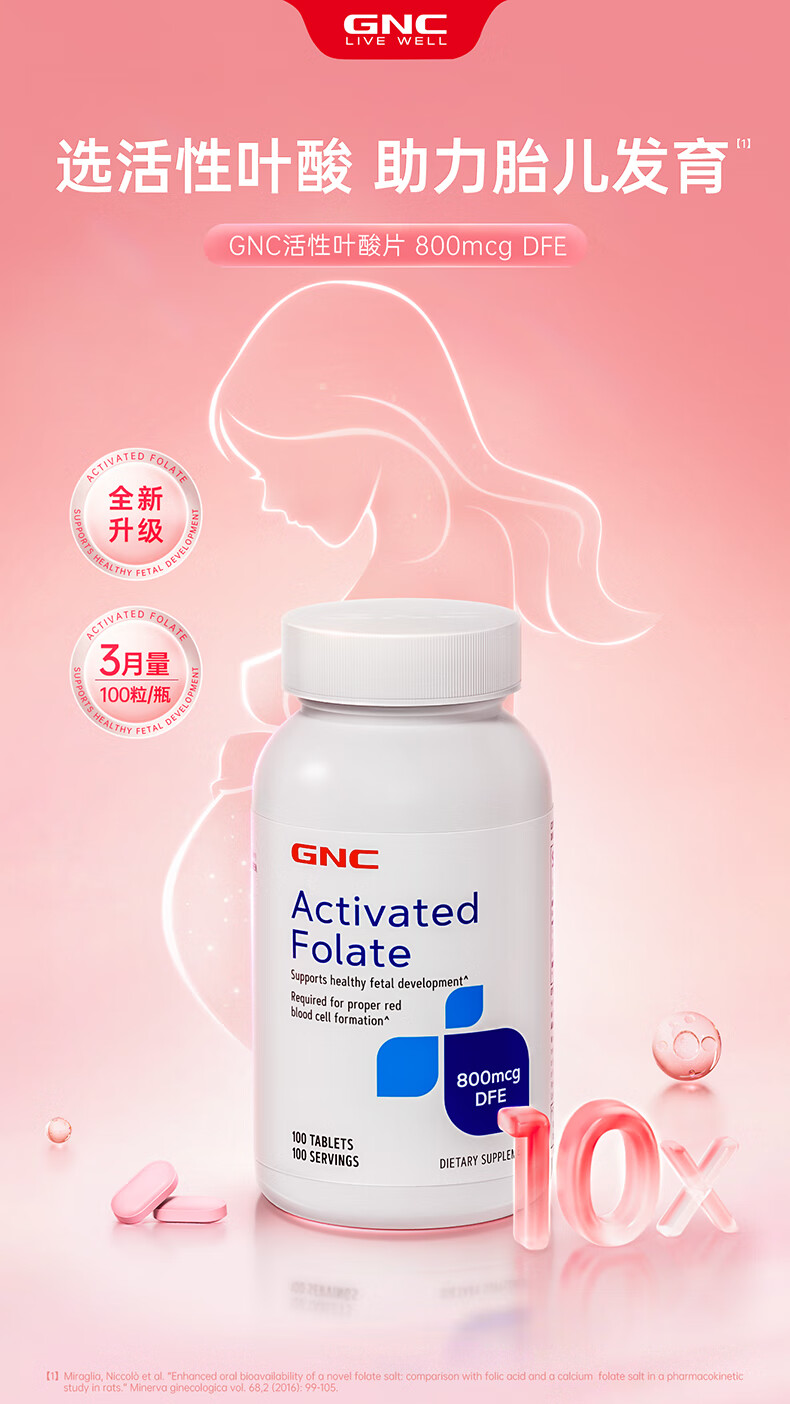GNC健安喜 活性叶酸营养片 孕妇备孕 成人备孕营养品 海外原装进口 【新品】活性叶酸800mcg 100片*1瓶