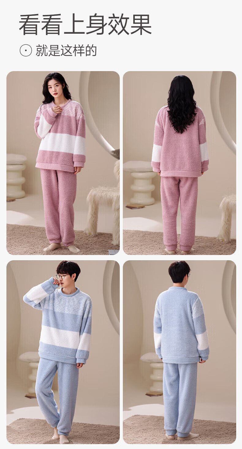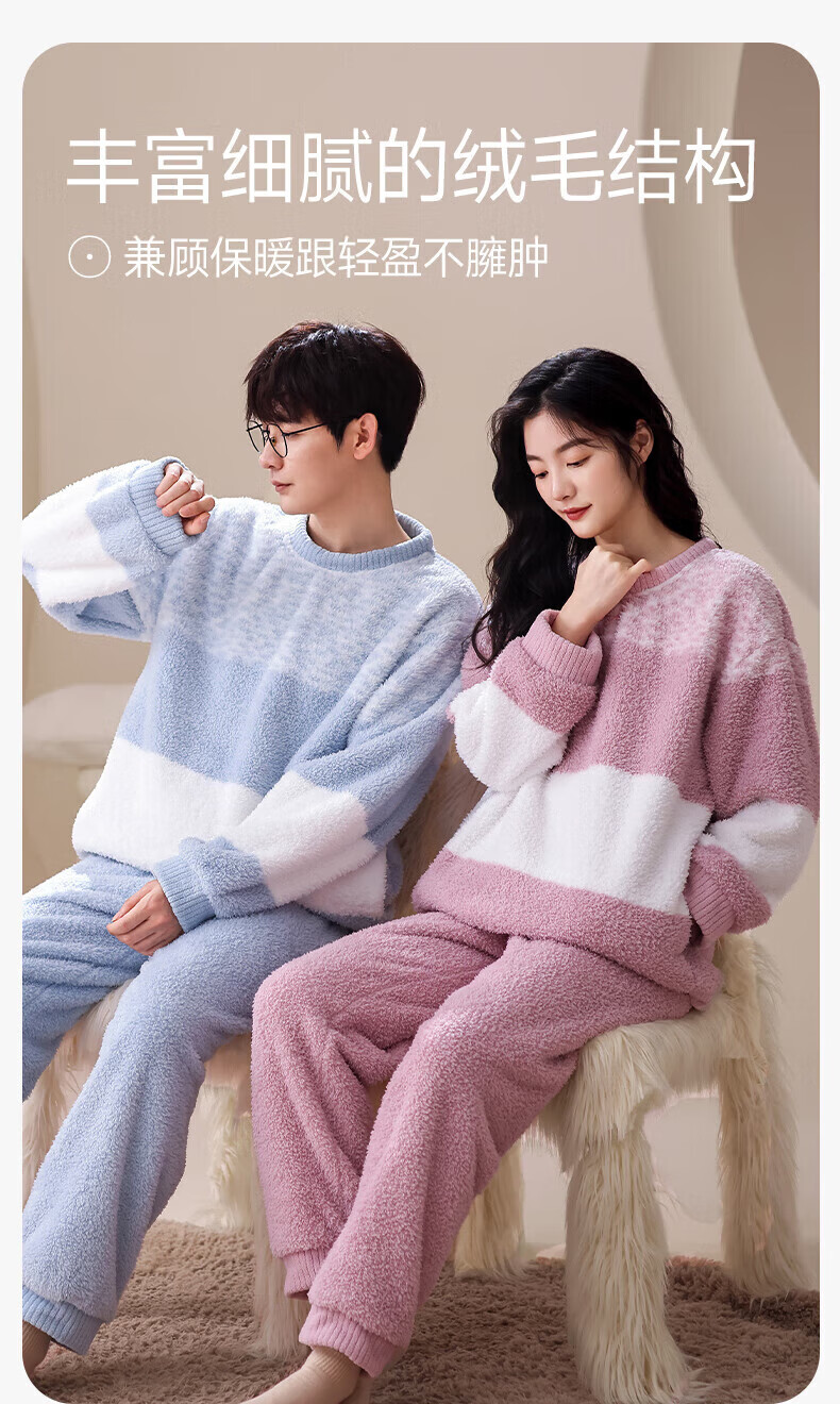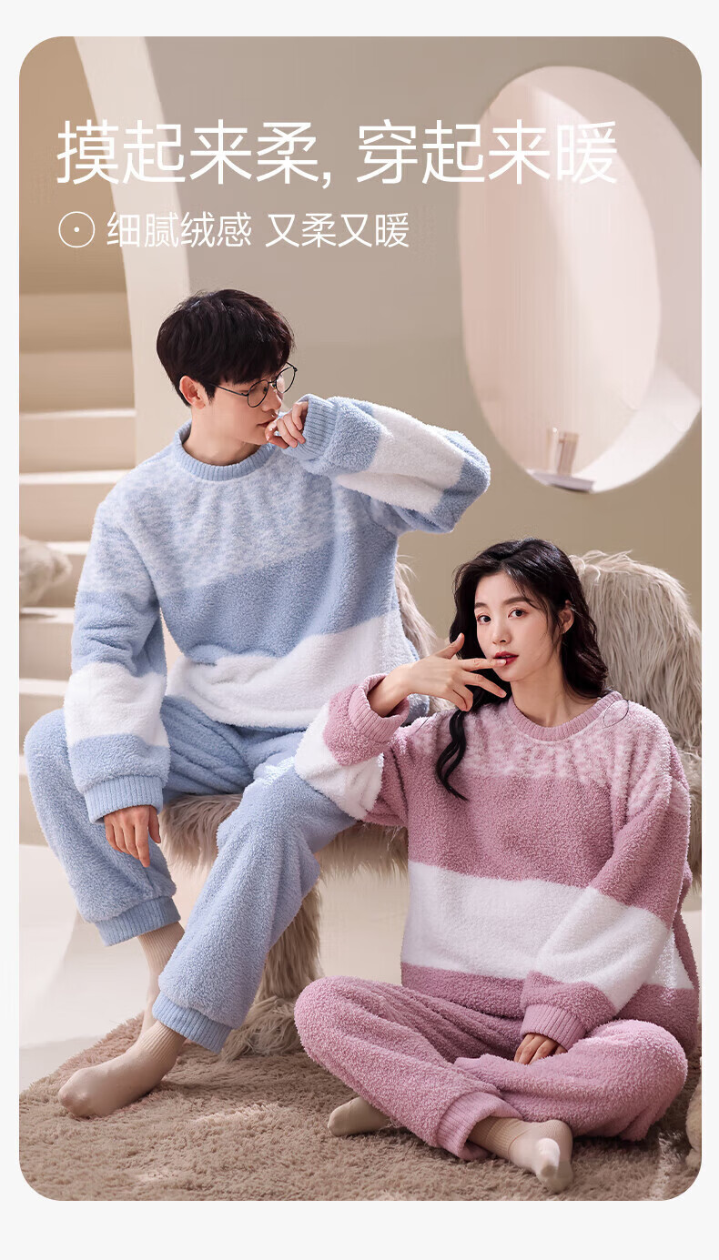 芬腾【断码清仓】珊瑚绒情侣睡衣冬季女款男士加厚加绒套装大码家居服 FX25940680兰白条【单男款】 3XL 建议:男186-206斤