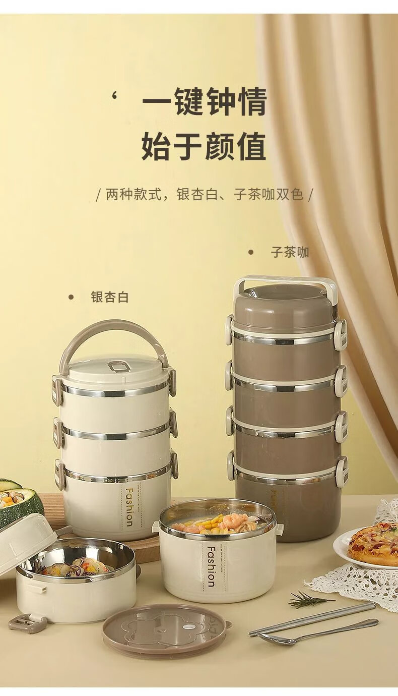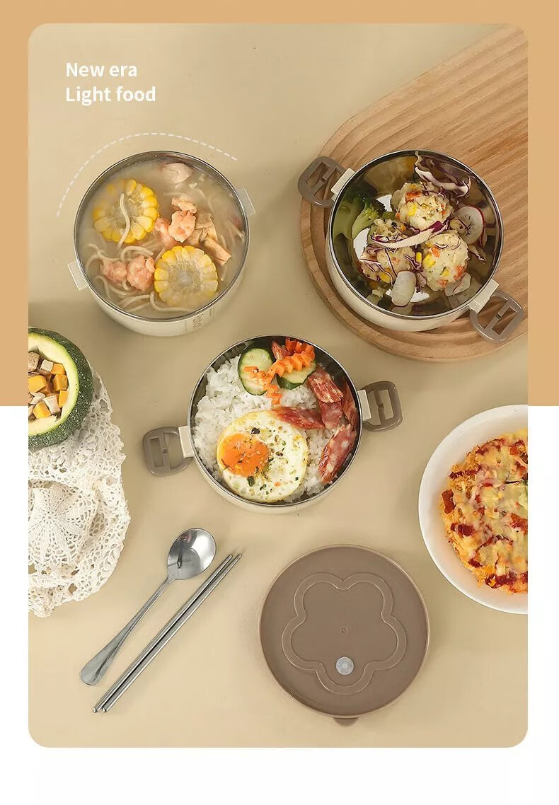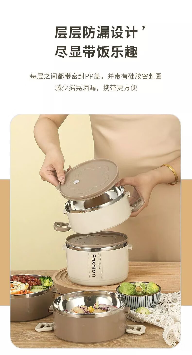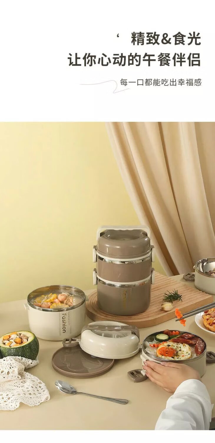 【精选】层层密封保温饭盒桶上班族不锈钢带盖餐盒微波炉加热便当 一层+餐具 201不锈钢银杏白