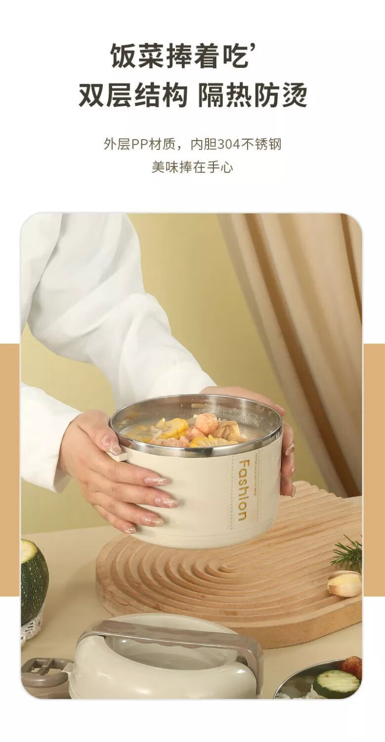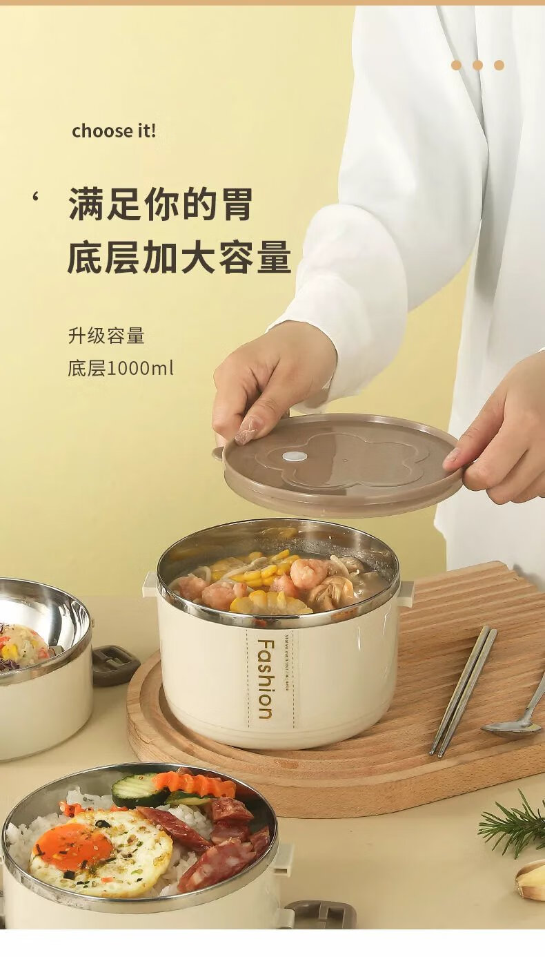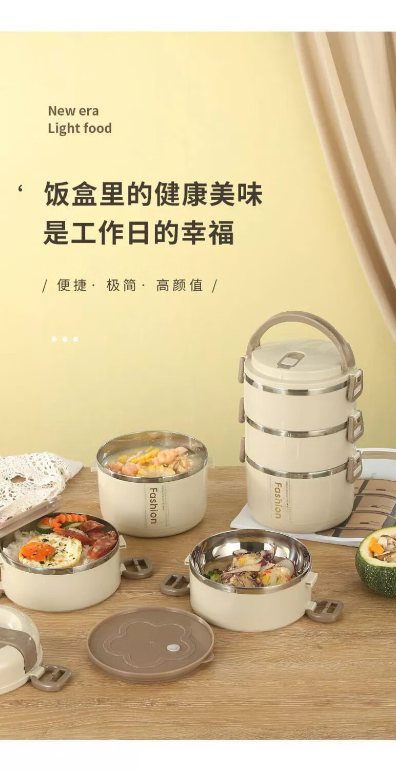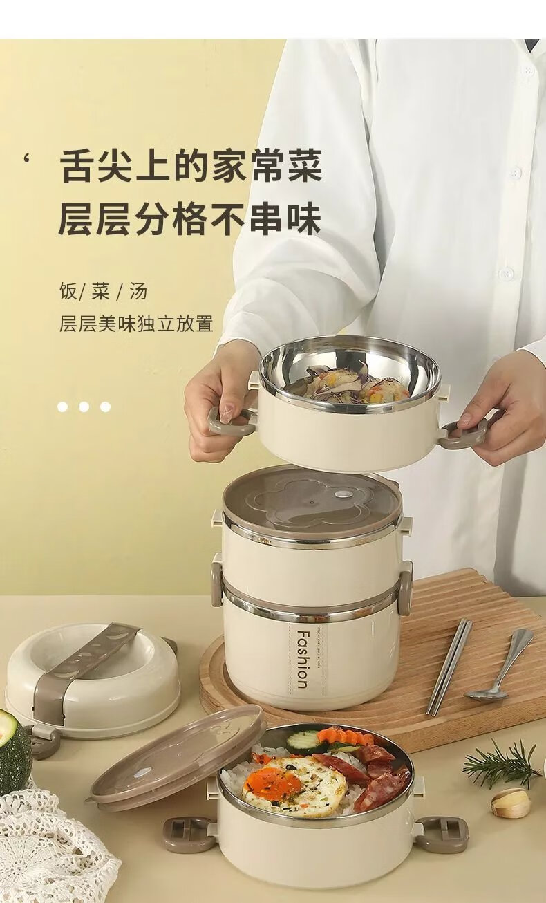 【精选】层层密封保温饭盒桶上班族不锈钢带盖餐盒微波炉加热便当 一层+餐具 201不锈钢银杏白