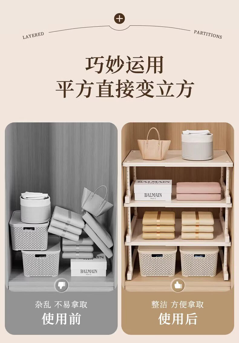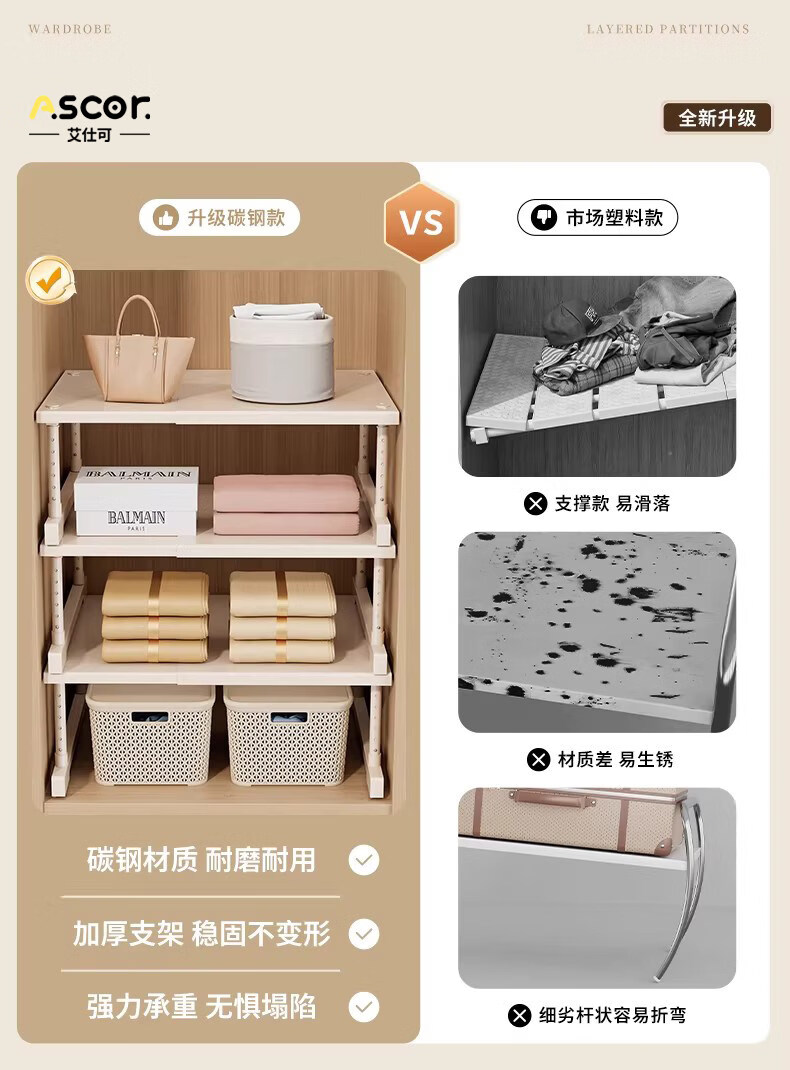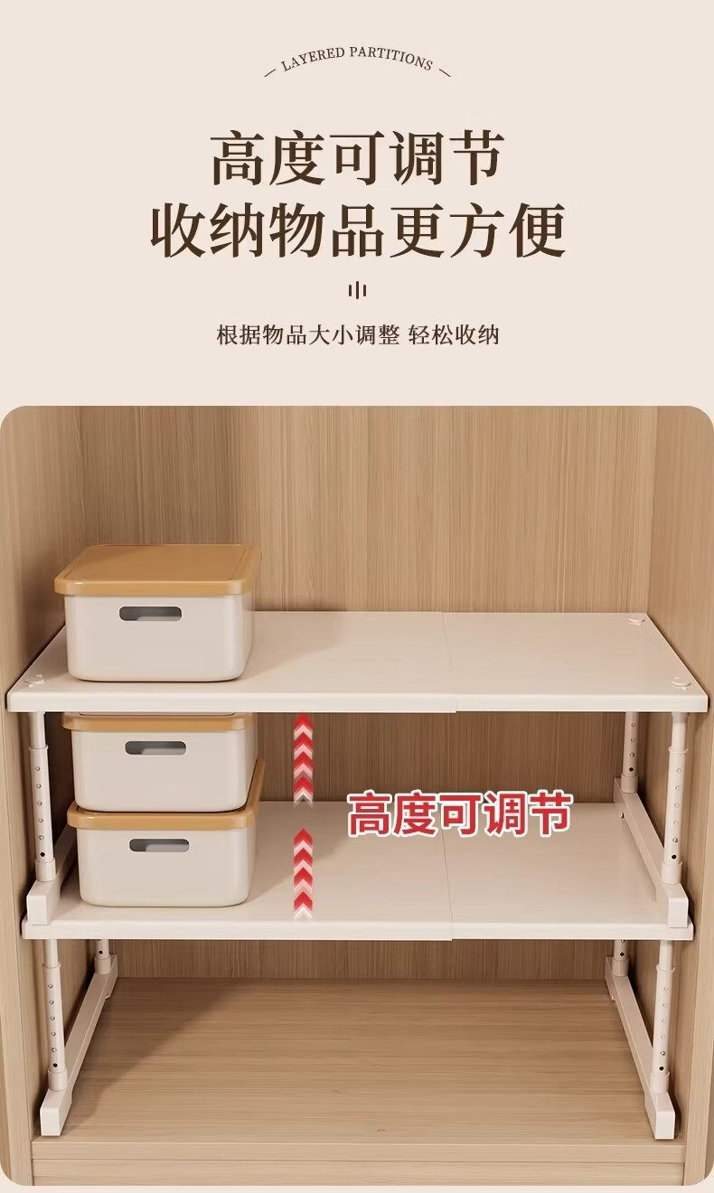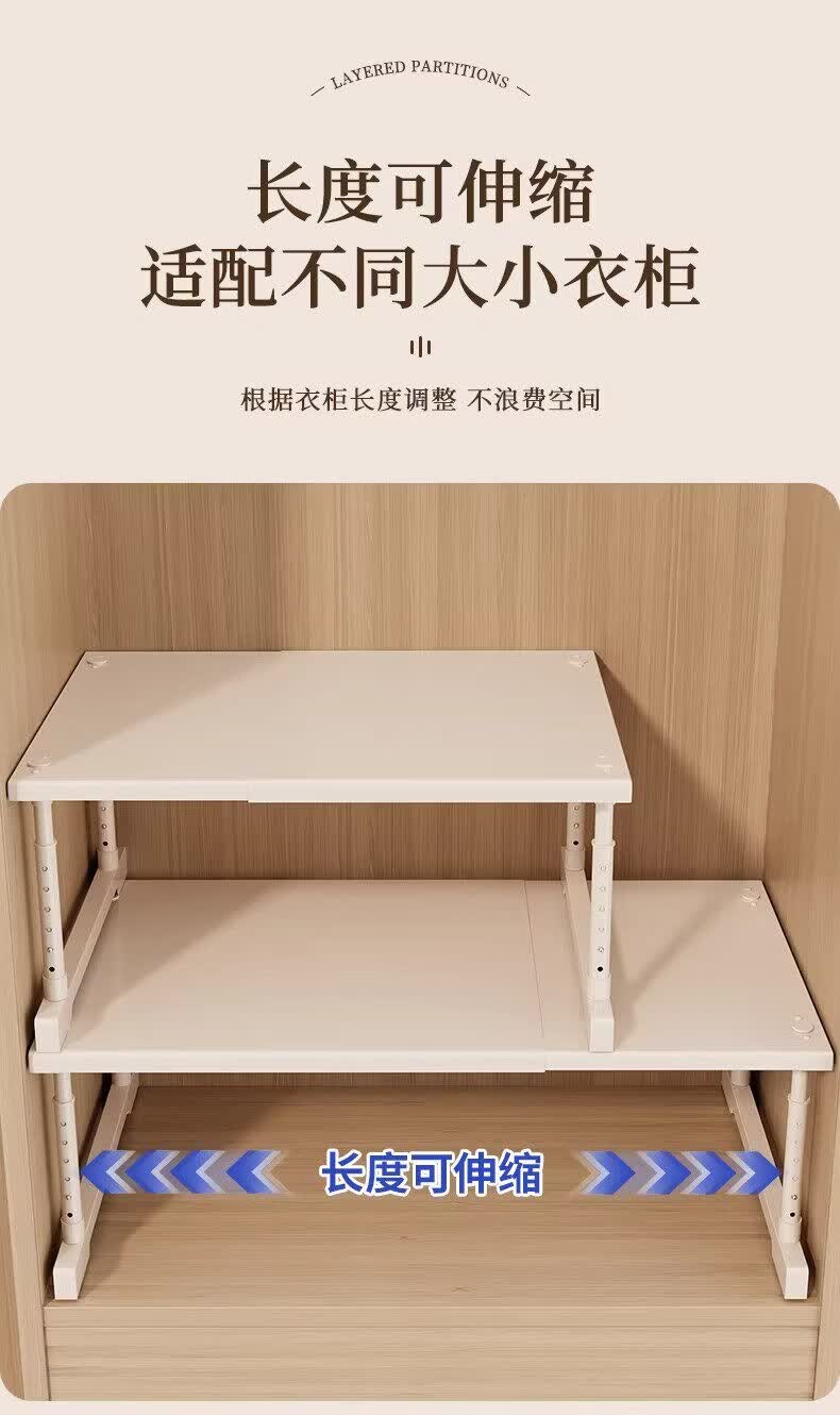 艾仕可(ASCOR)衣柜分层隔板收纳神器柜子橱柜伸缩置物架衣橱碳钢隔断整理架子 奶油白-加高款【长50-85】宽42cm【高35-50】