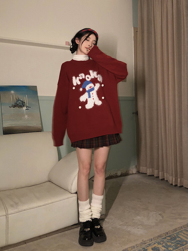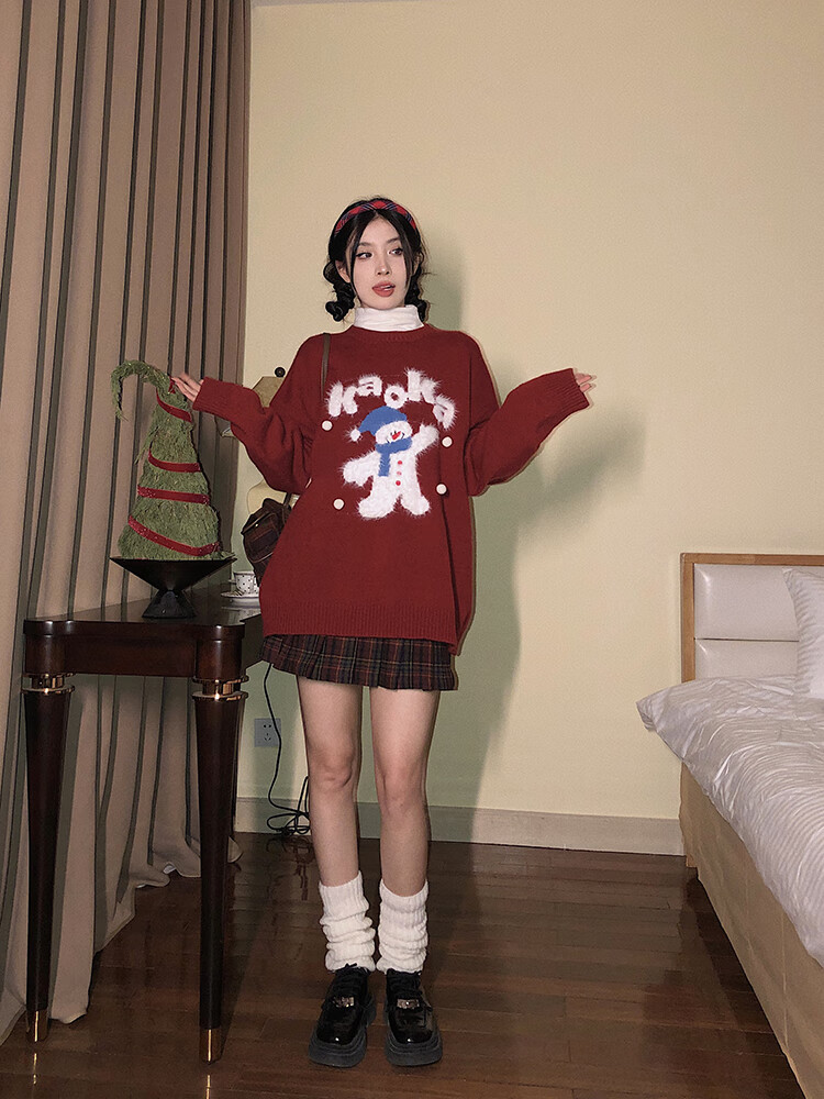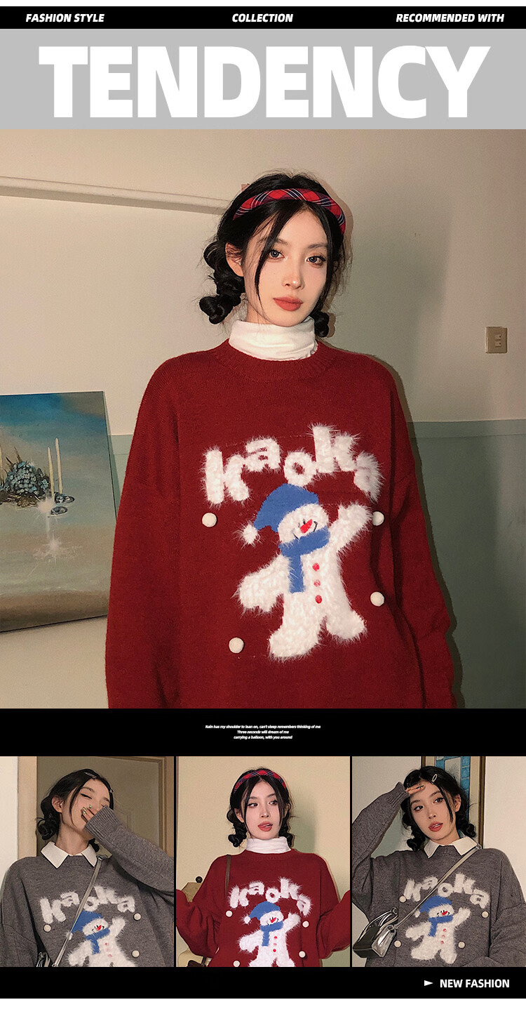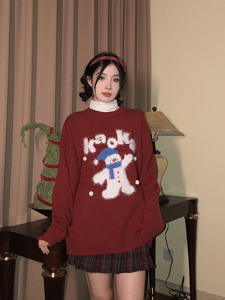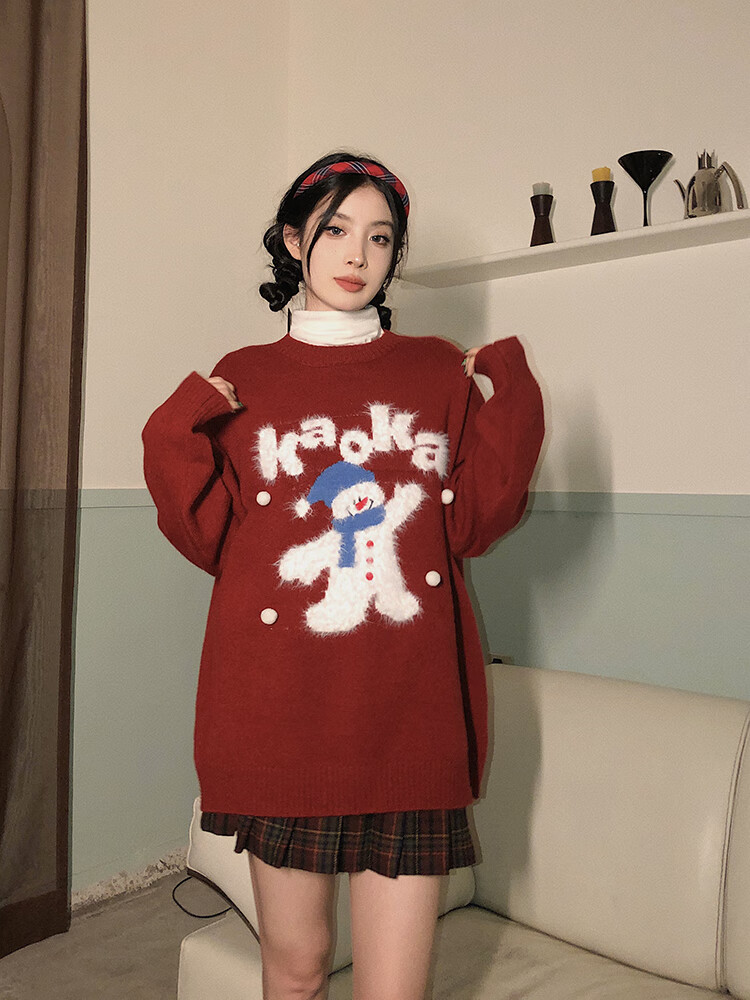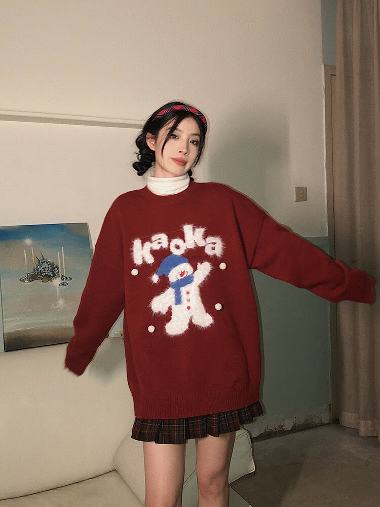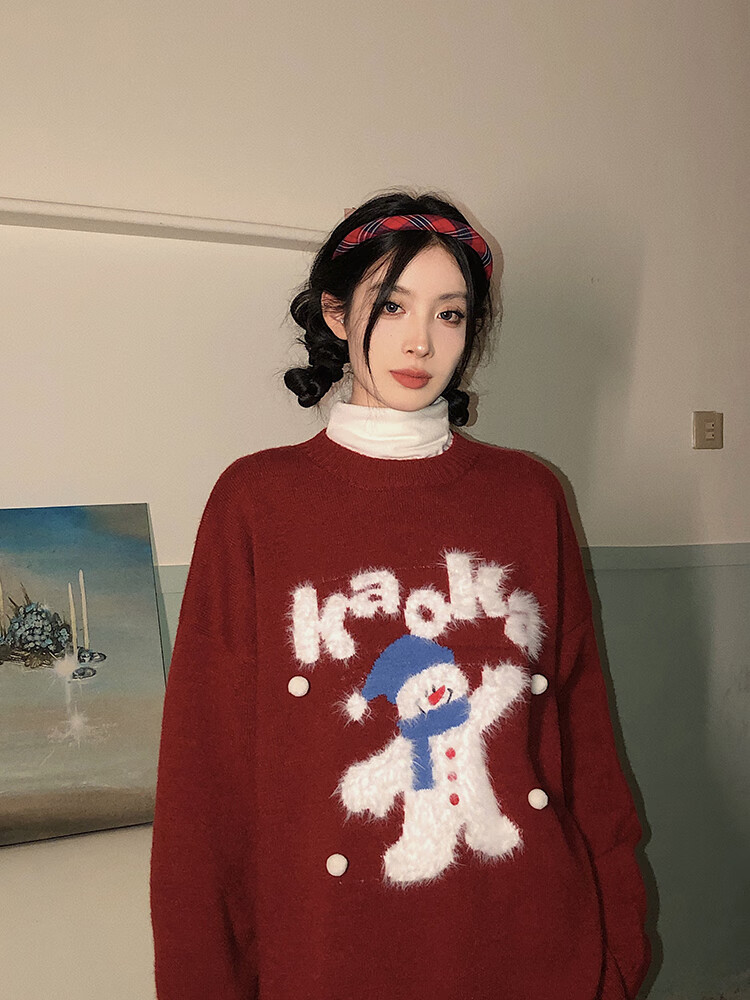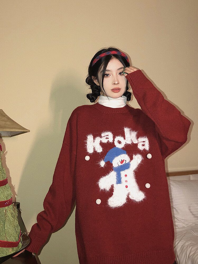 相伊恋人毛衣女25秋冬新款加绒加厚针织衫美式圣诞慵懒风上衣宽松内搭外套 红色【软糯升级亲肤】 均码 【建议80-140斤】
