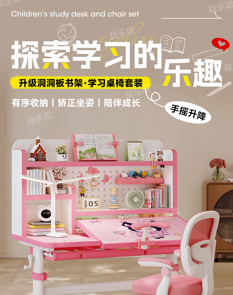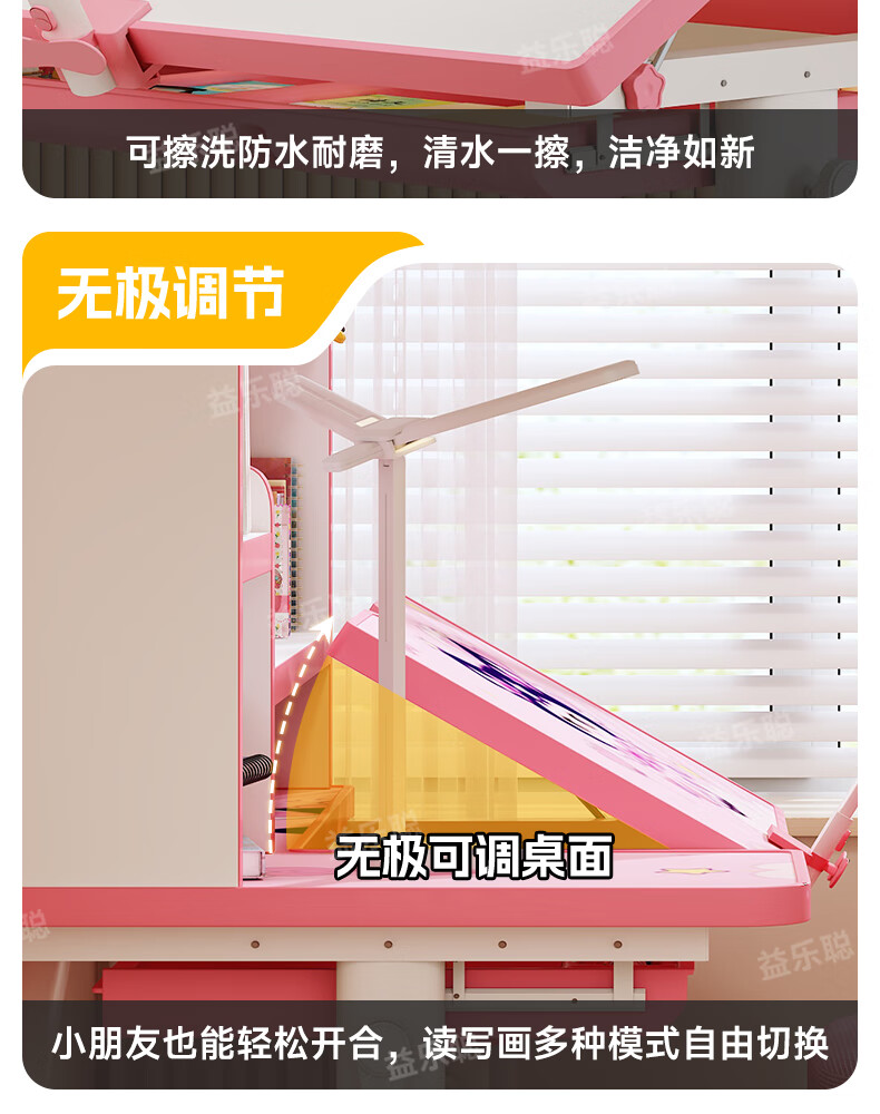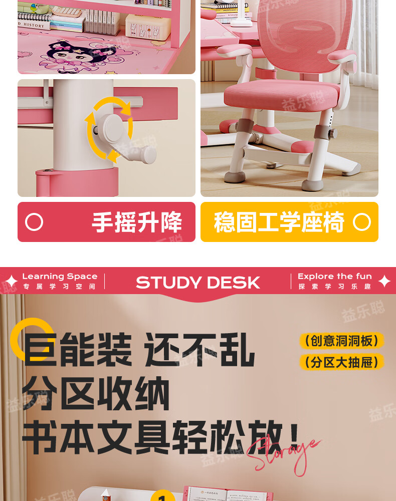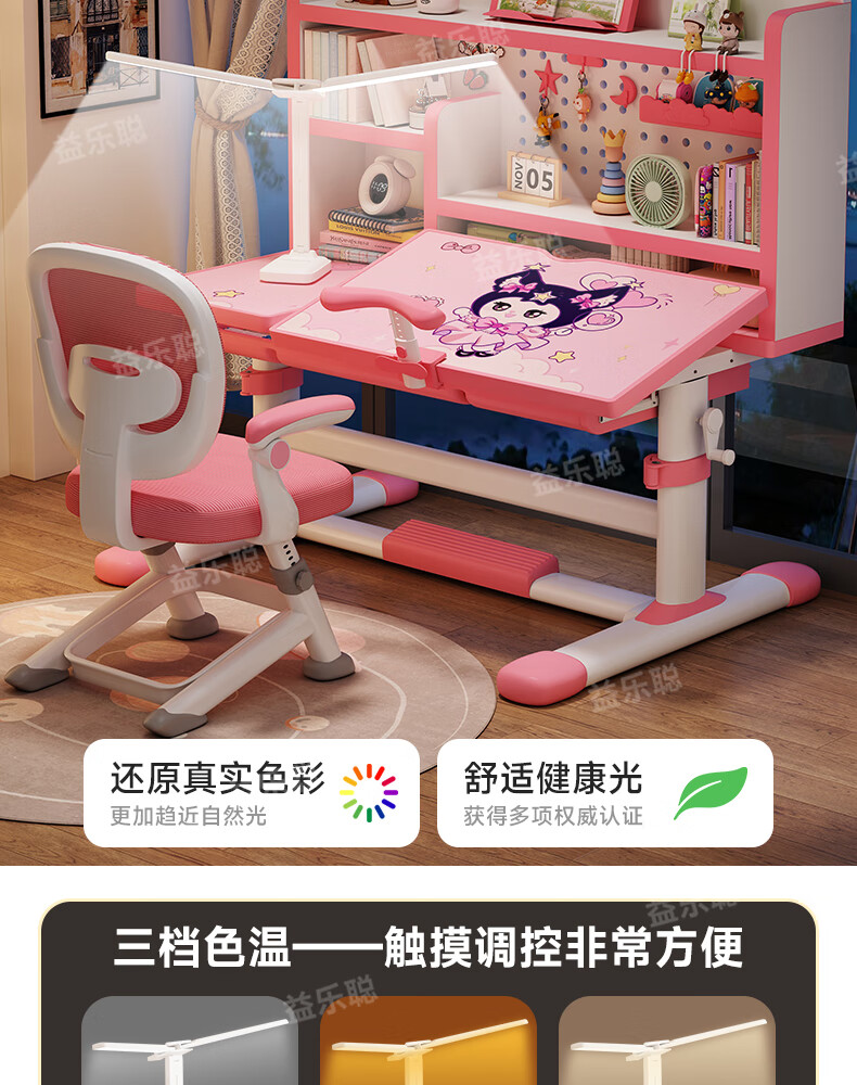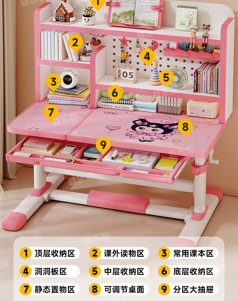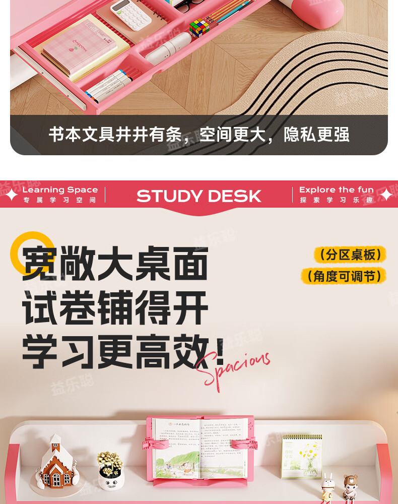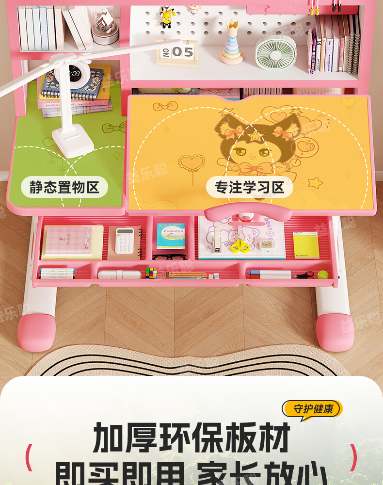 森优匠儿童学习桌书桌椅套装6-18岁专用可升降带书架一体小学生写字课桌 匠心粉兔兔多区收纳书架+分区调节桌板+三角永定椅