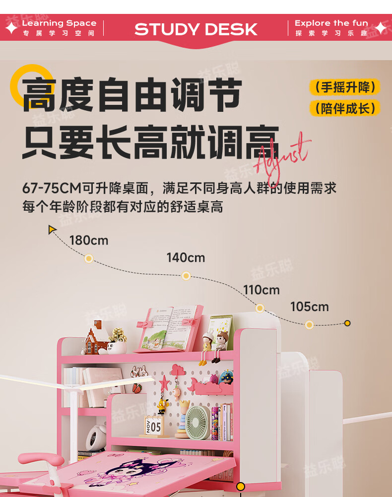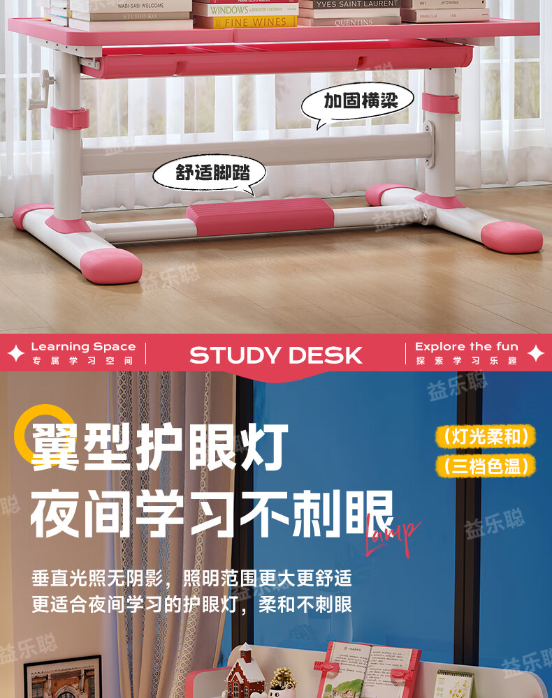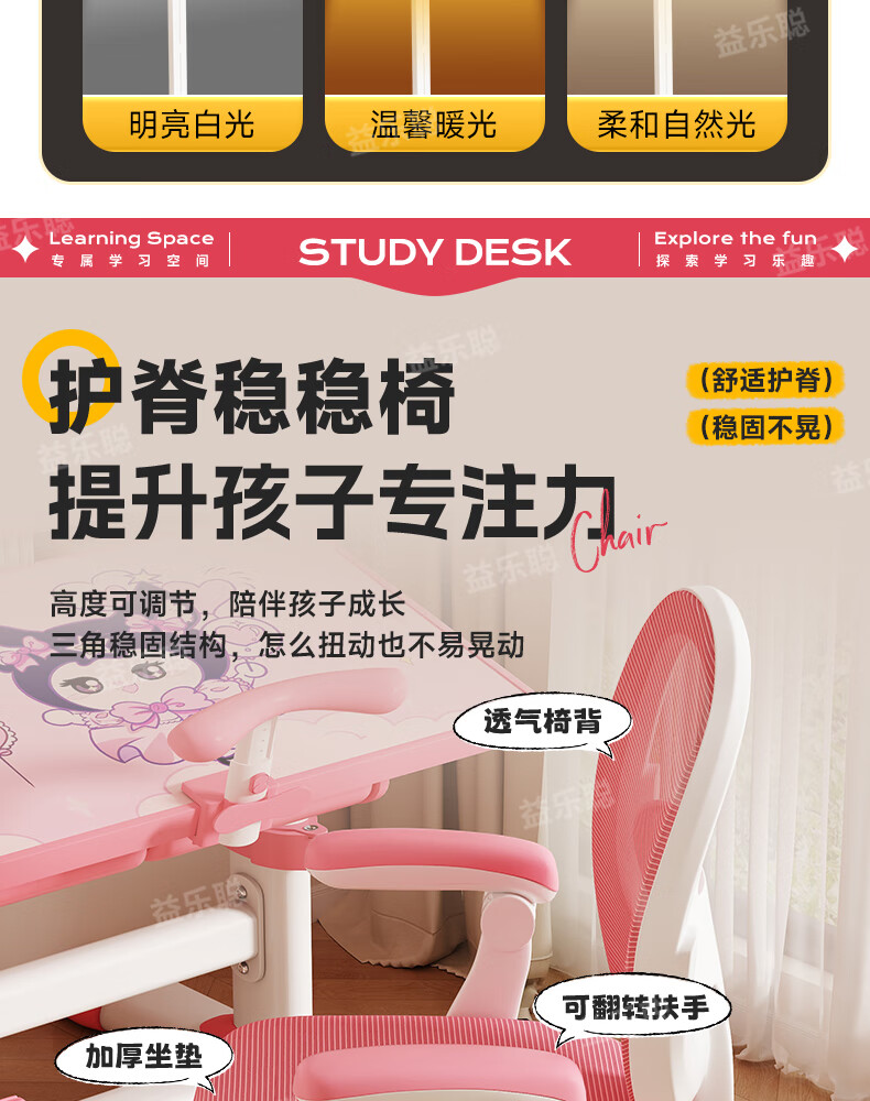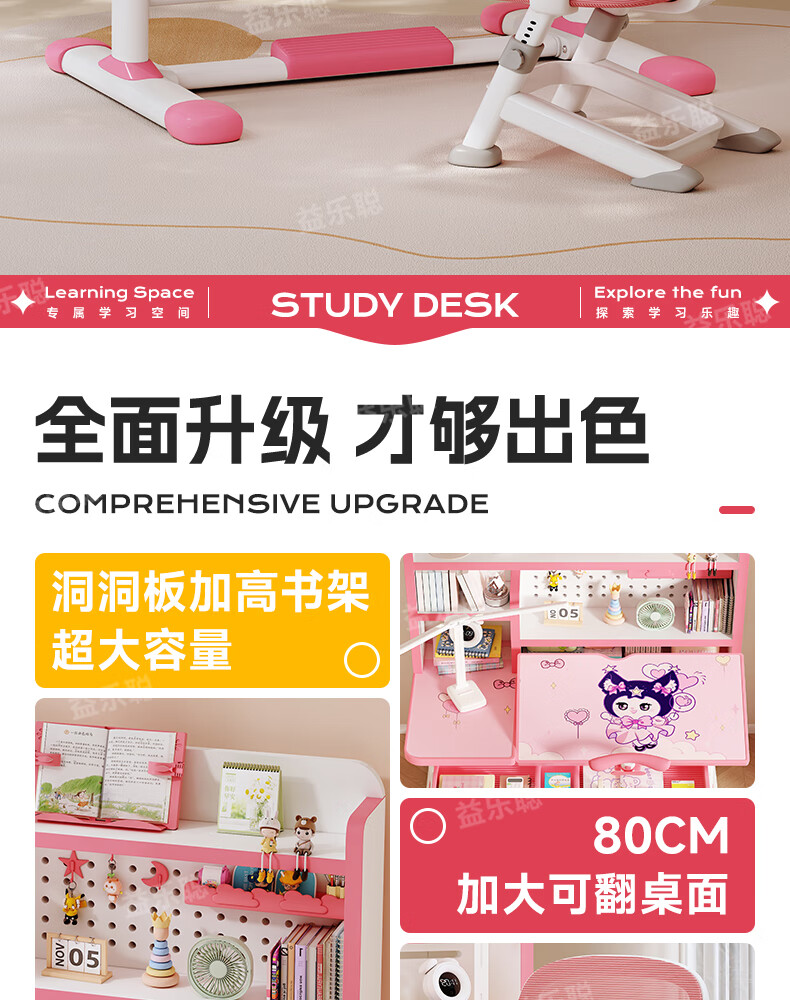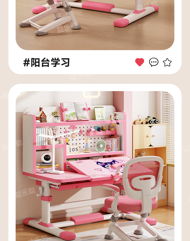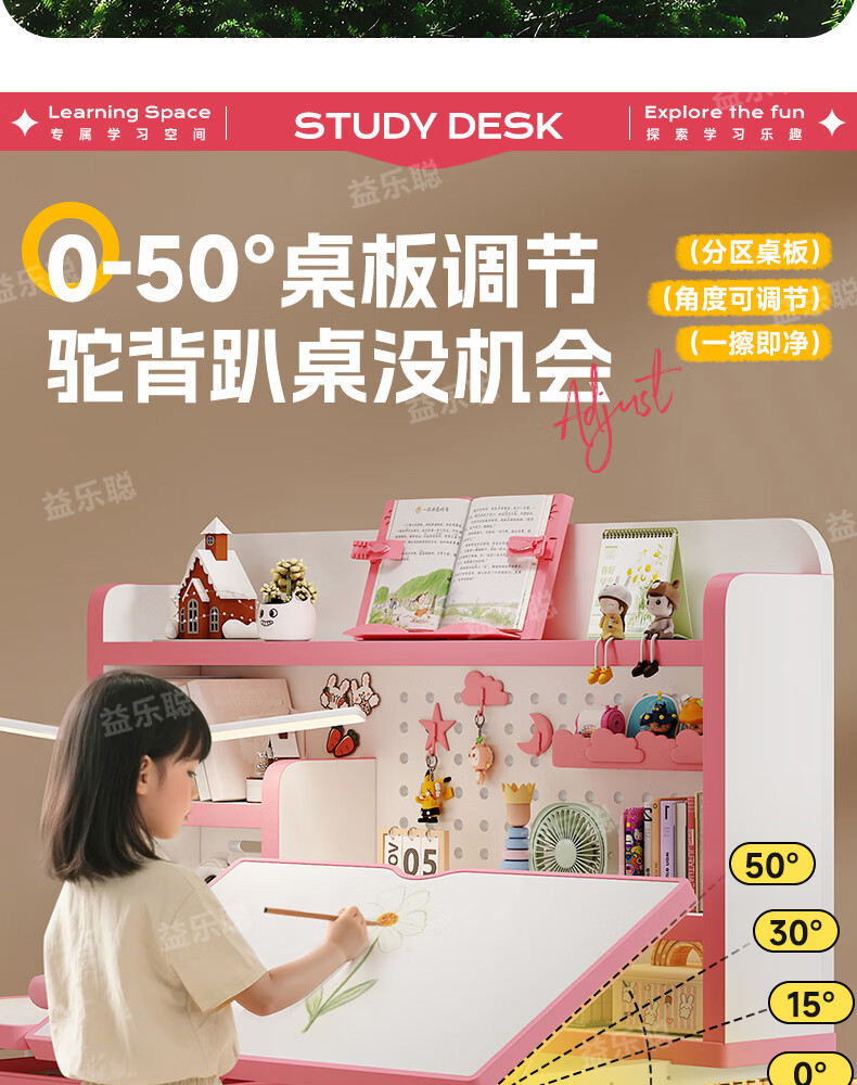 森优匠儿童学习桌书桌椅套装6-18岁专用可升降带书架一体小学生写字课桌 匠心粉兔兔多区收纳书架+分区调节桌板+三角永定椅