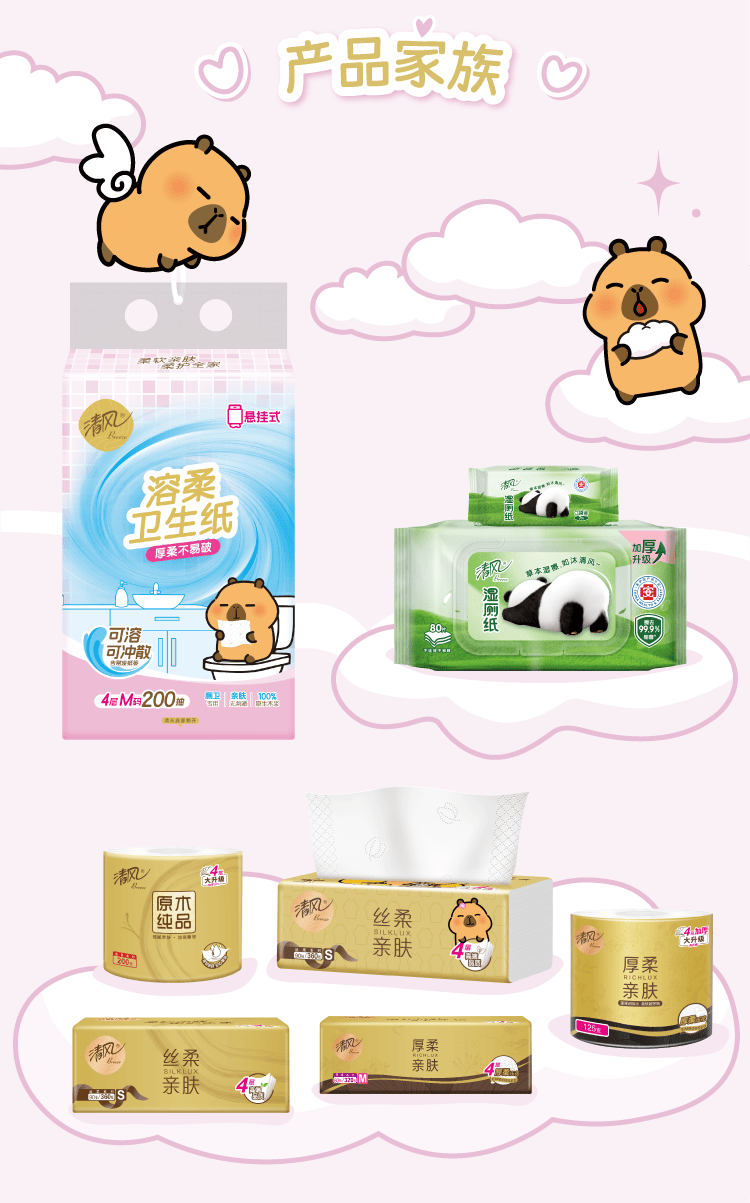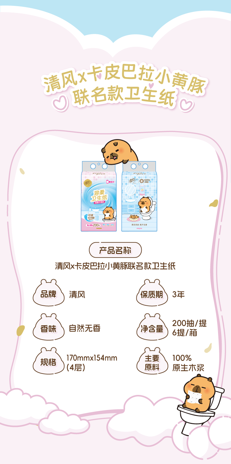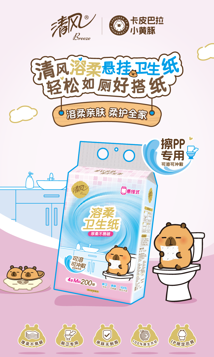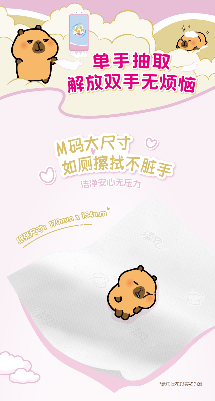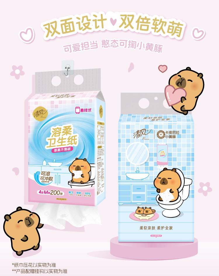 清风卡皮巴拉溶柔系列 悬挂式卫生纸 4层200抽*6包整箱家用厚实抽纸