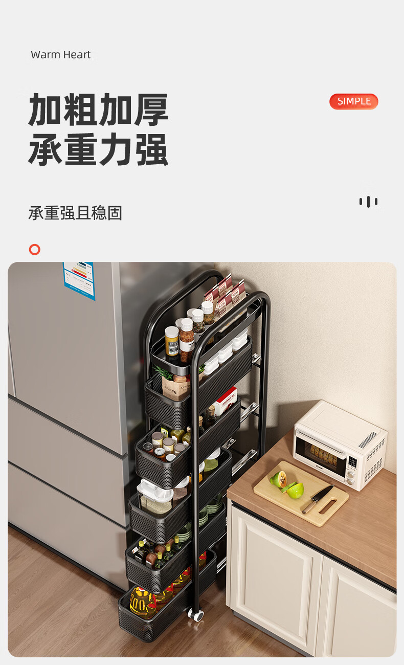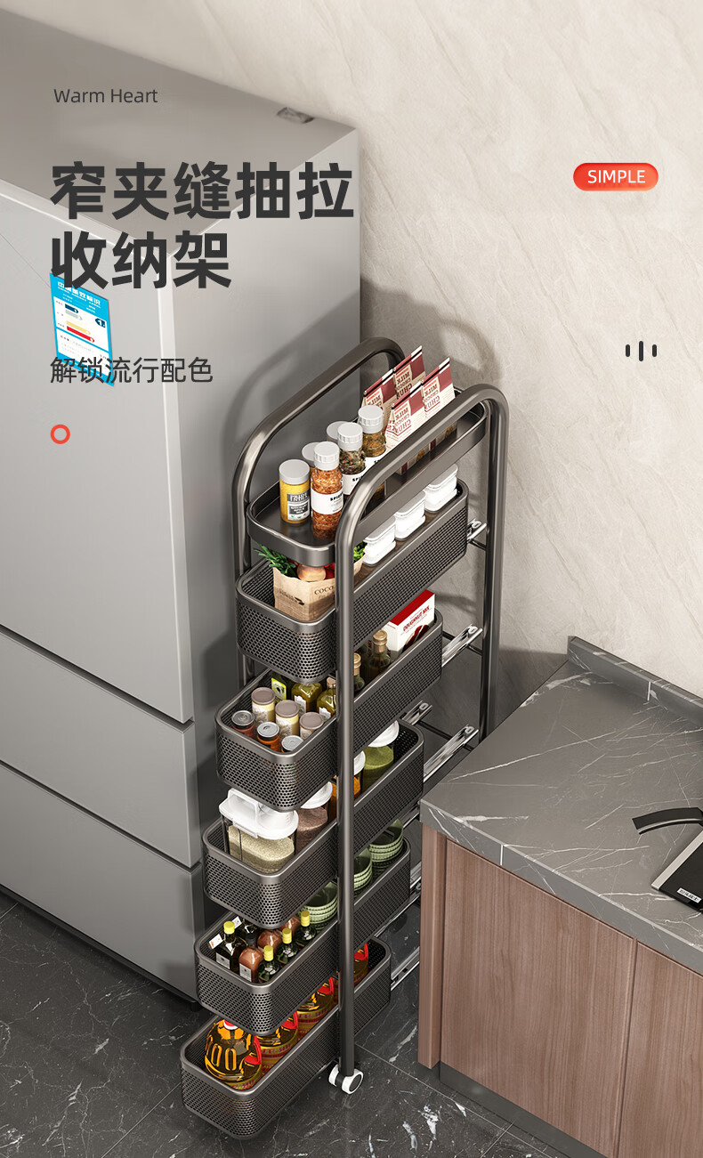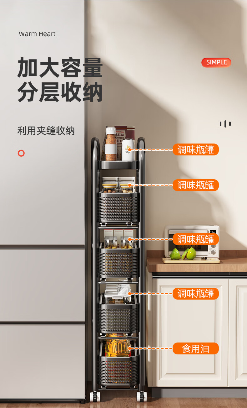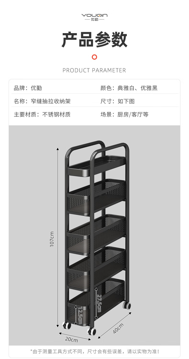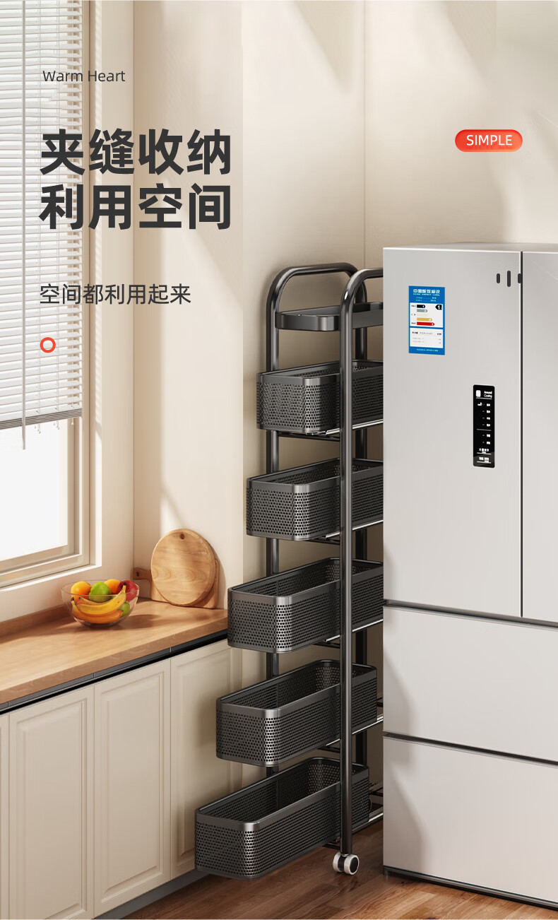 优勤(YOUQIN)厨房置物架夹缝极窄缝隙落地收纳柜多层冰箱侧面抽拉柜果蔬小推车 20cm宽五层黑色【可抽拉高围护】