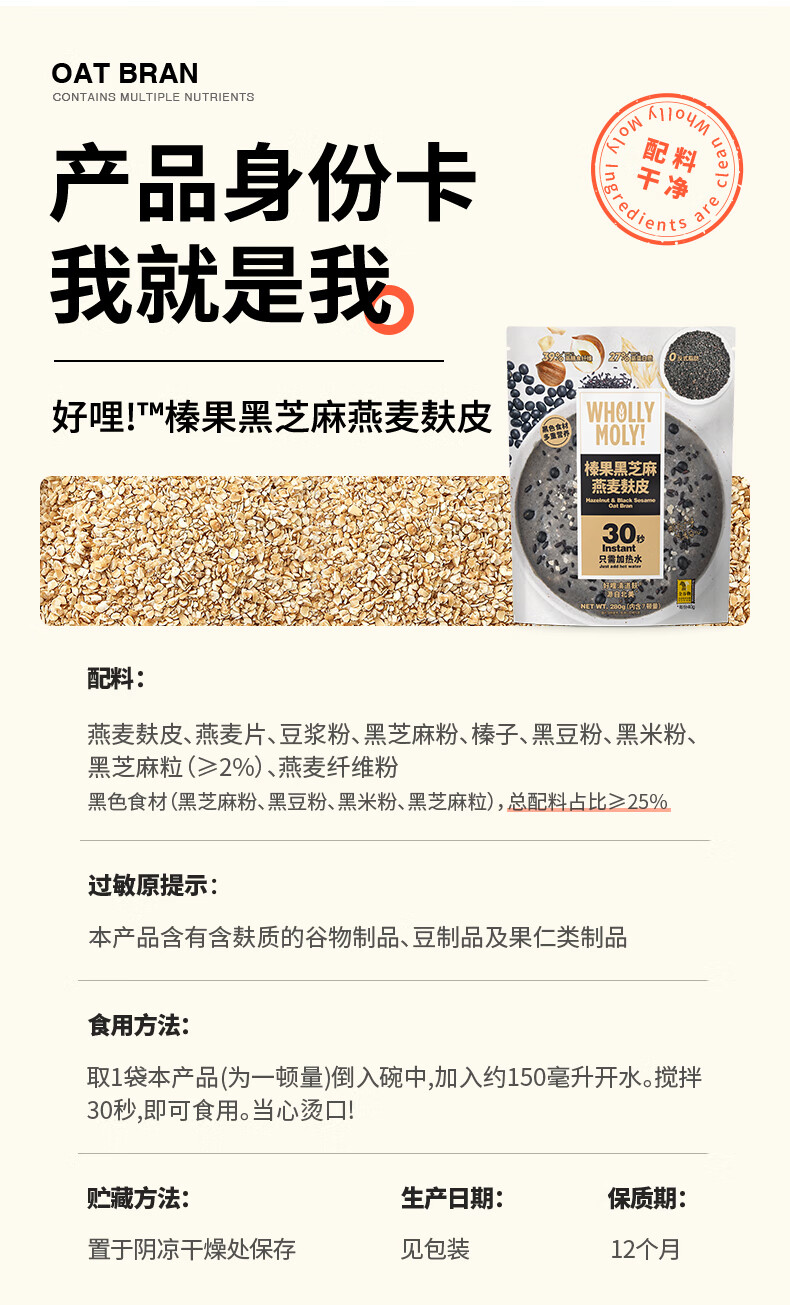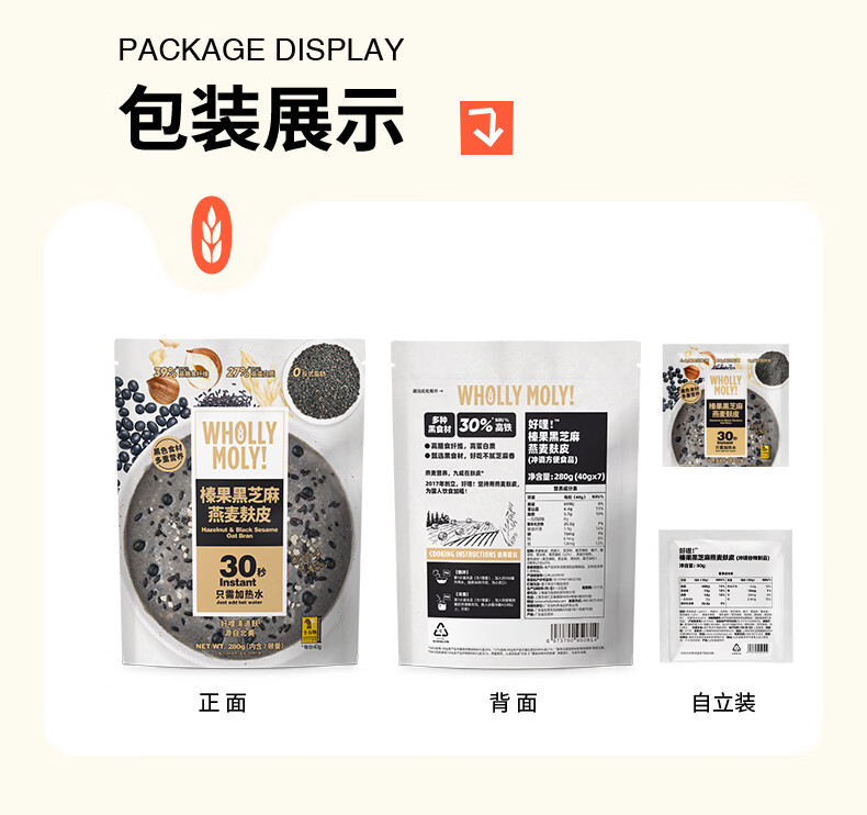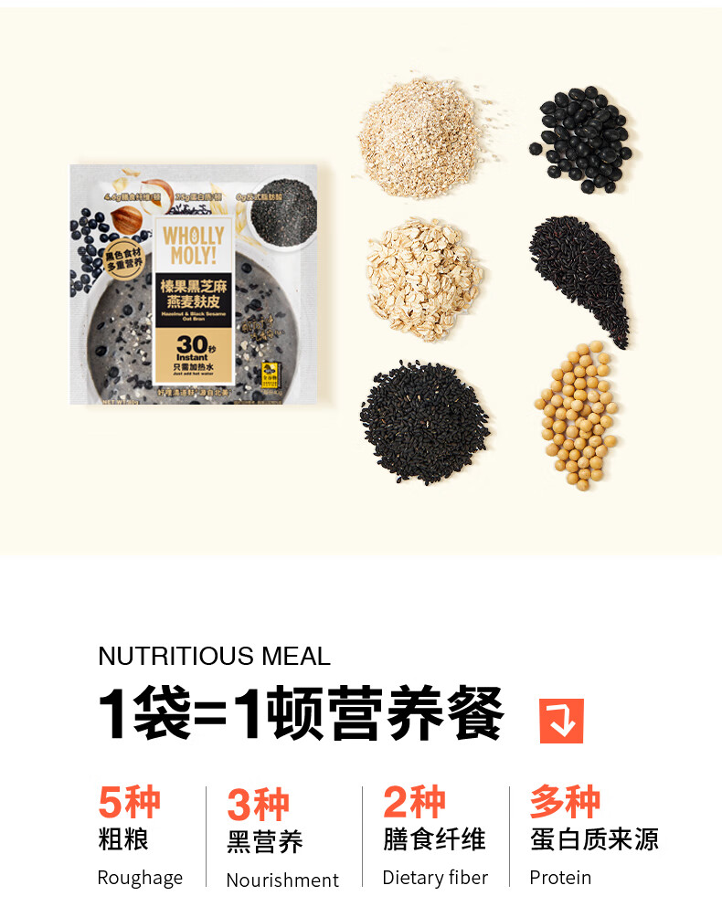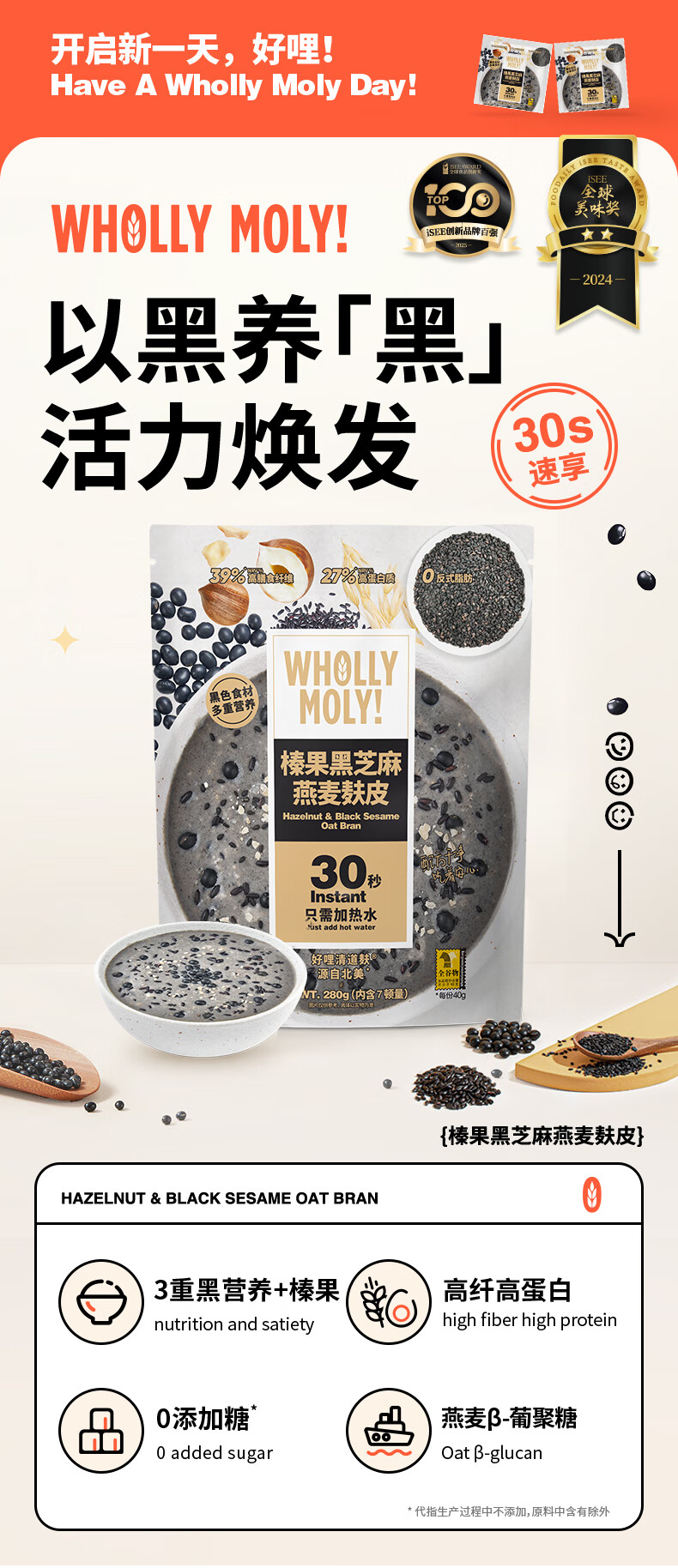 WHOLLY MOLY!好哩榛果黑芝麻燕麦麸皮40g*7袋 高膳食纤维高蛋白 营养早餐代餐