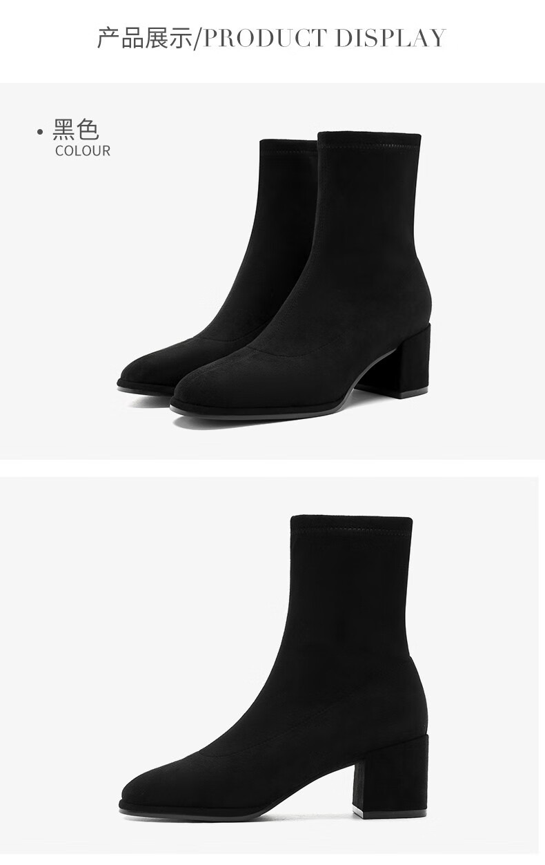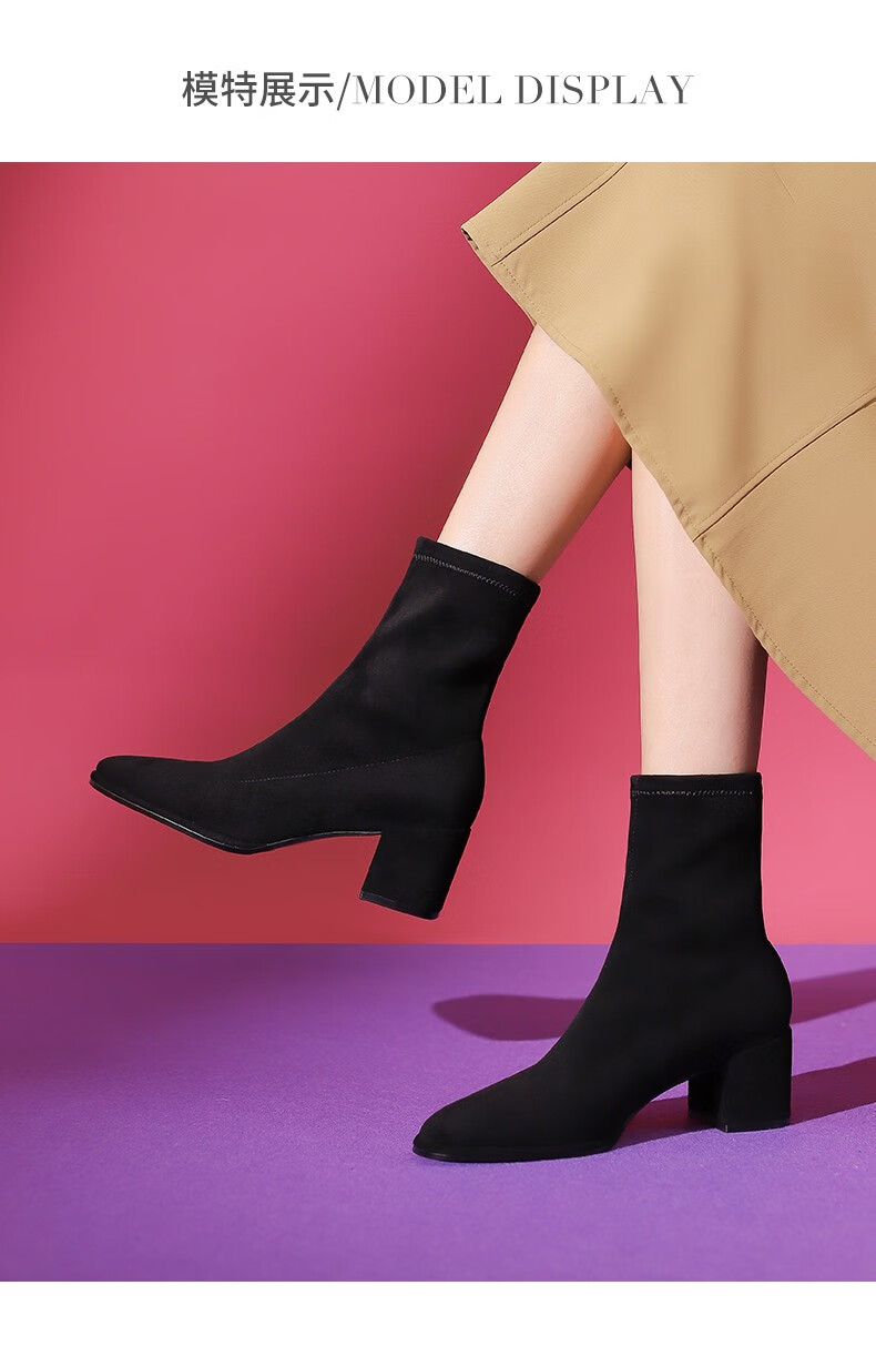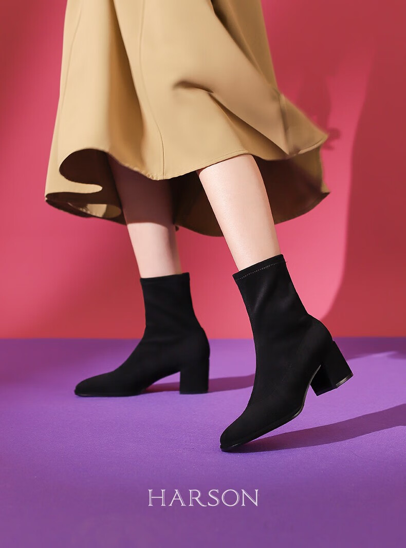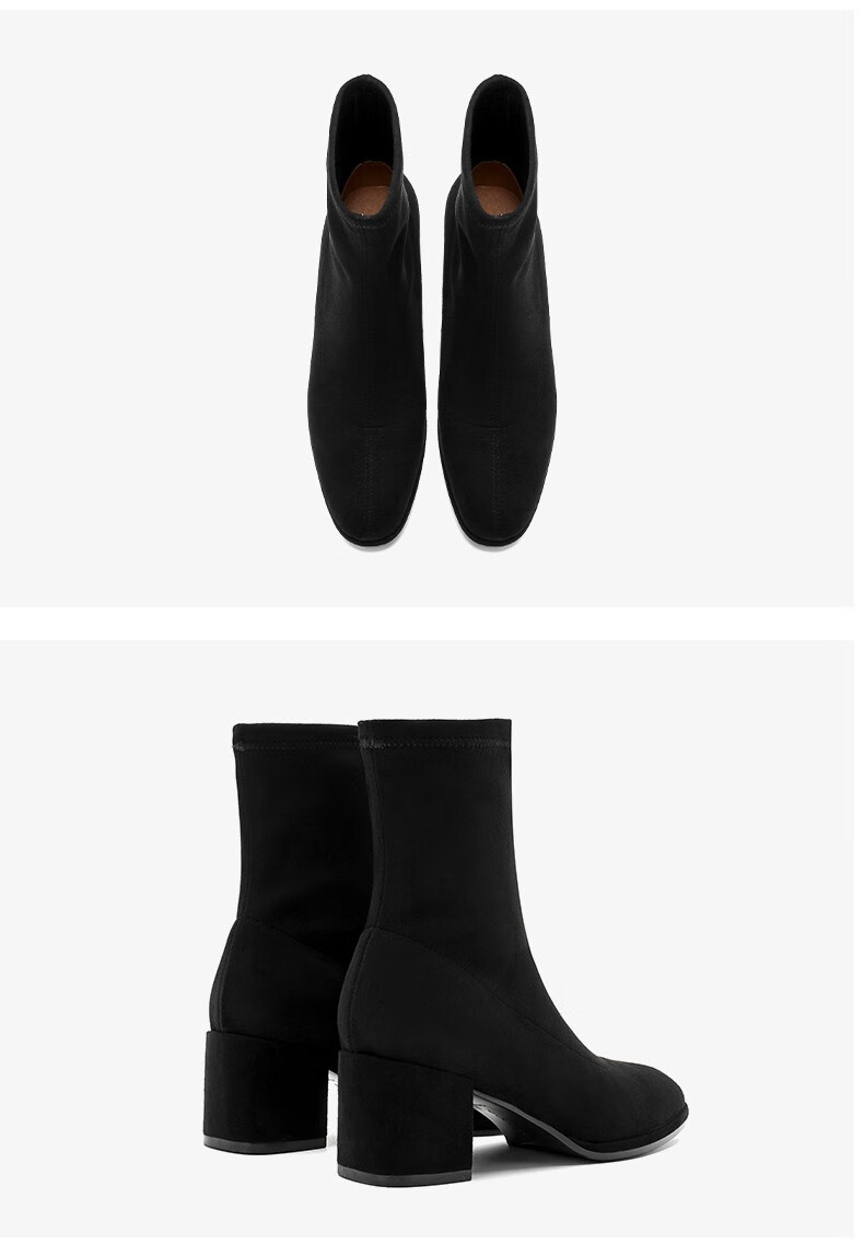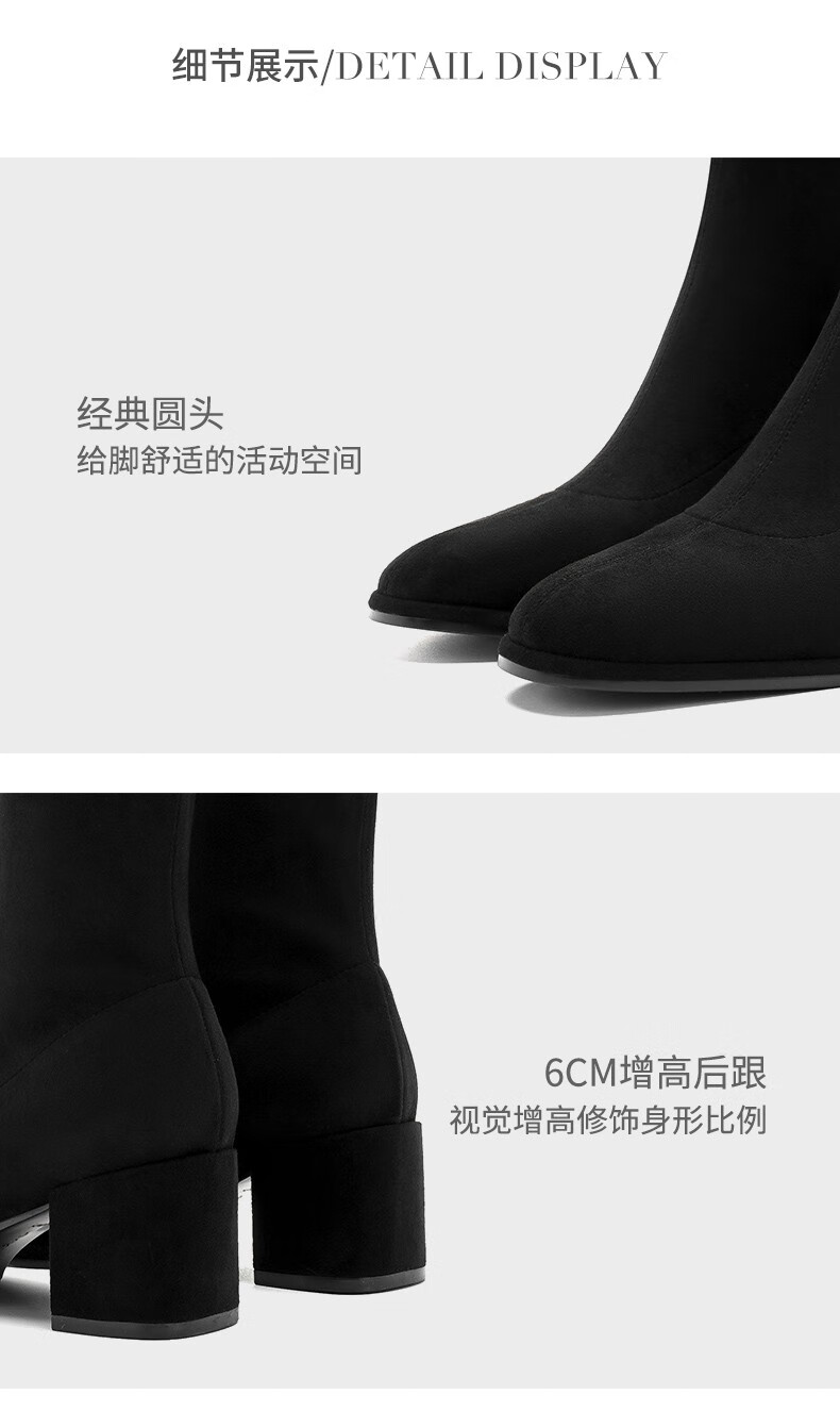 哈森冬季弹力靴女保暖气质圆头粗跟套脚瘦瘦靴女靴HWA230202 黑色 34