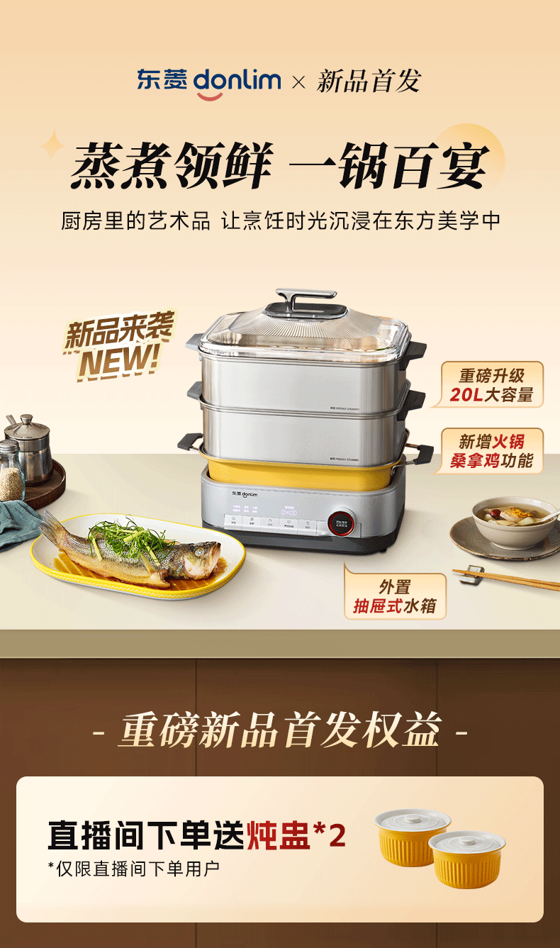 东菱(Donlim)多功能电蒸锅3-4人家用大容量电陶炉火锅可预约定时早餐炖蒸煮一体机2026新款不锈钢大容量DL-1007 【标配】20L 全钢+火锅