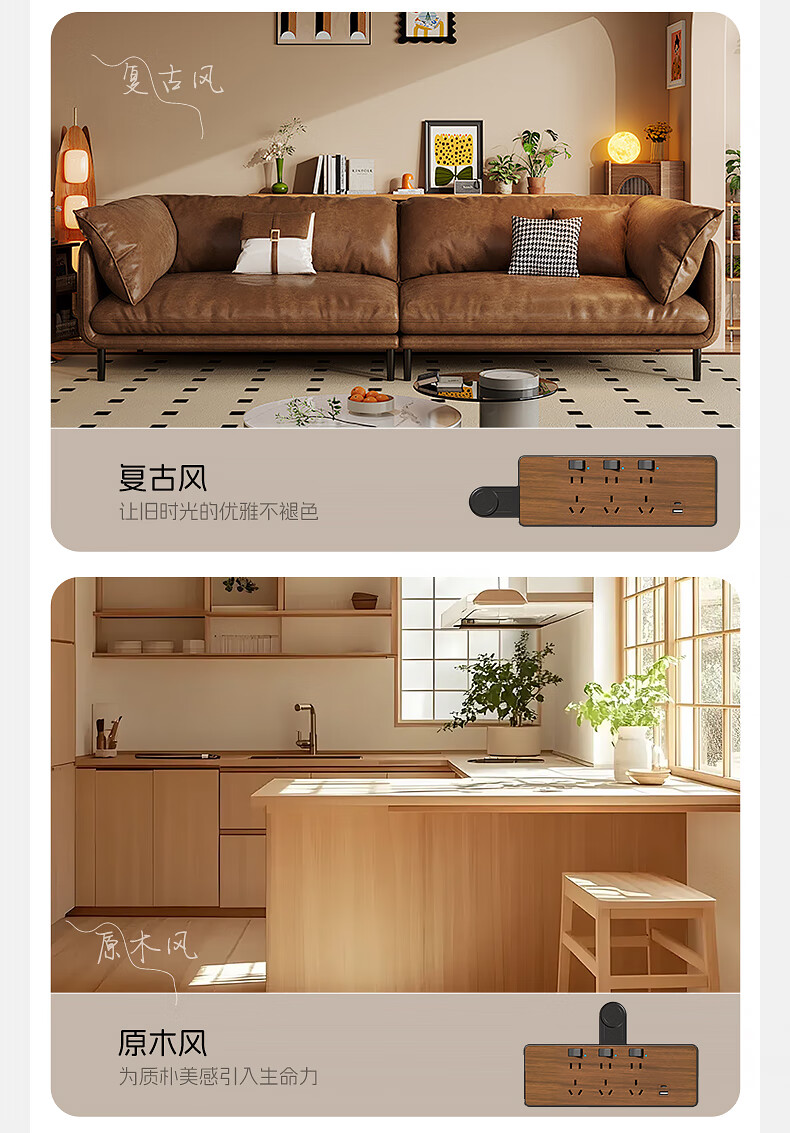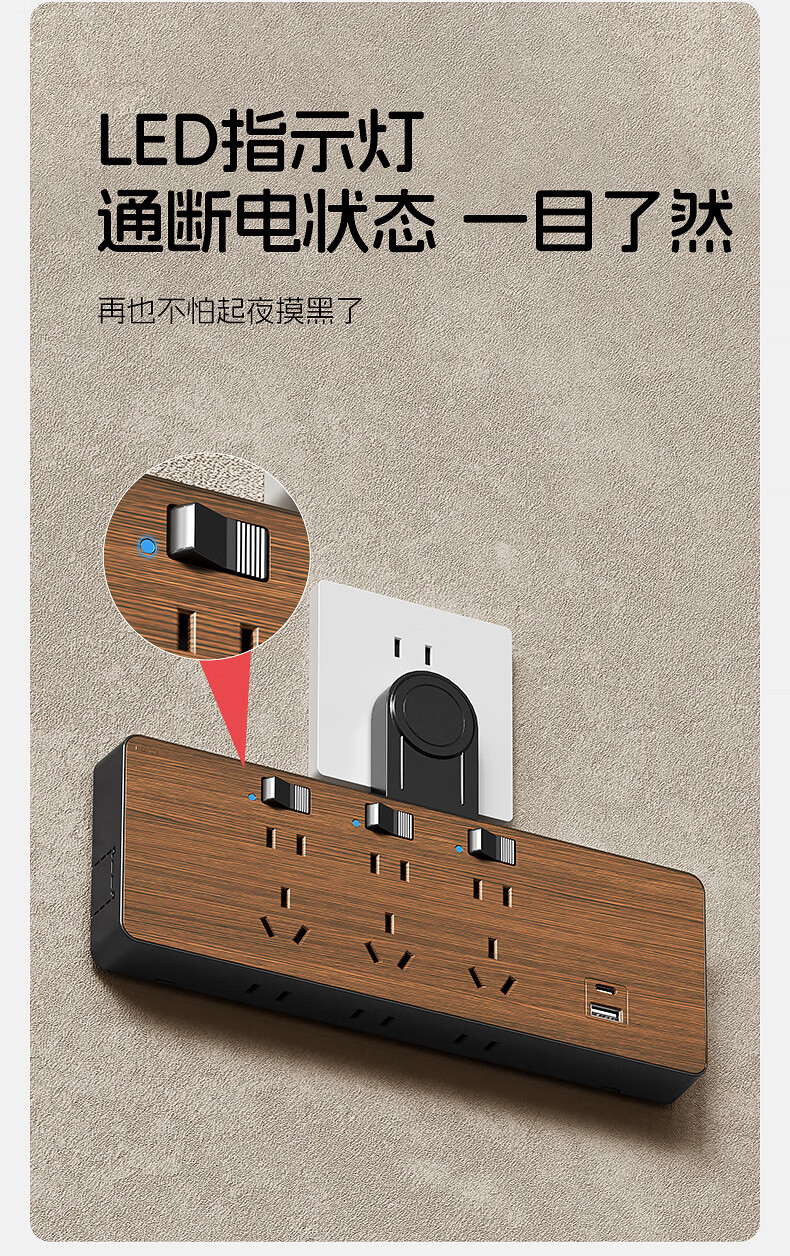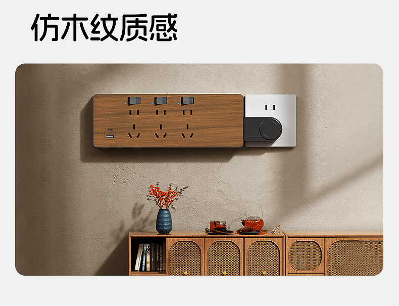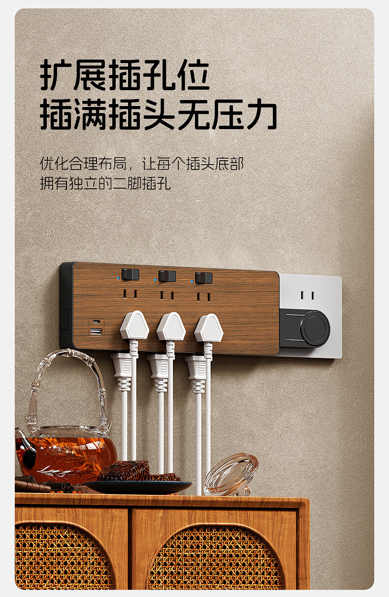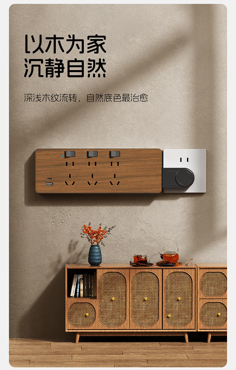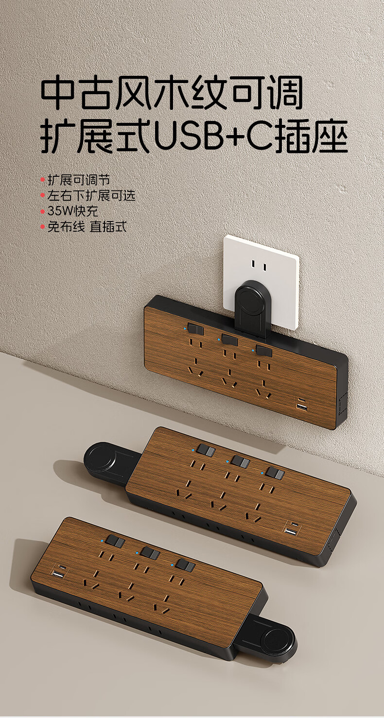 国际电工中古风木纹扩展插座一转多孔35W快充插排明装家用墙壁USB+C转换器 中古风木纹【向左扩展】35W快充USB+C-3开21孔