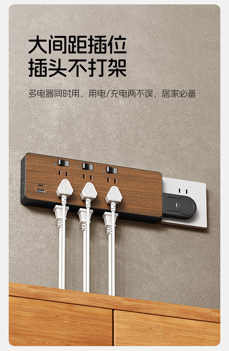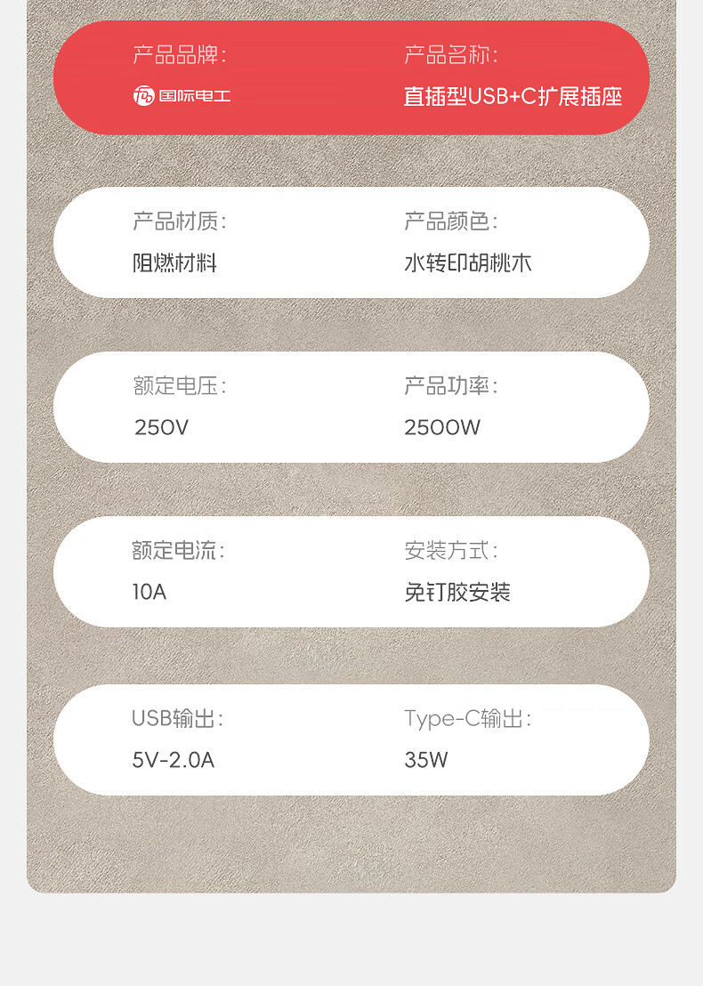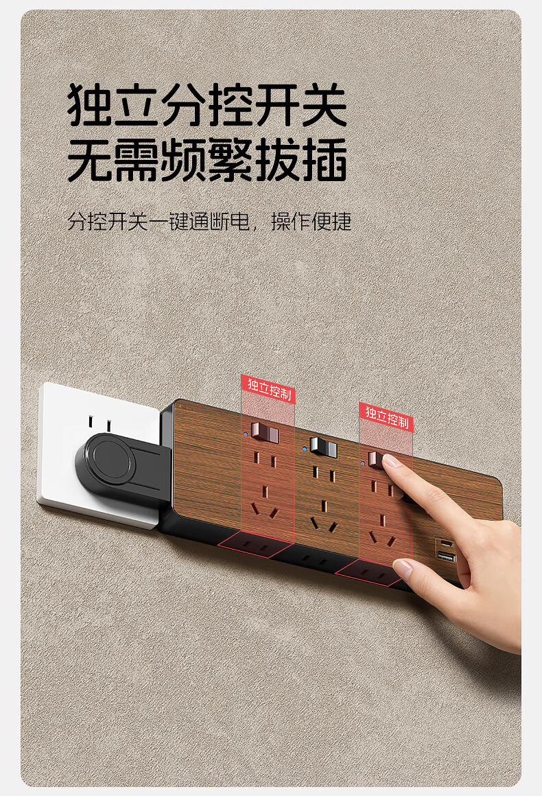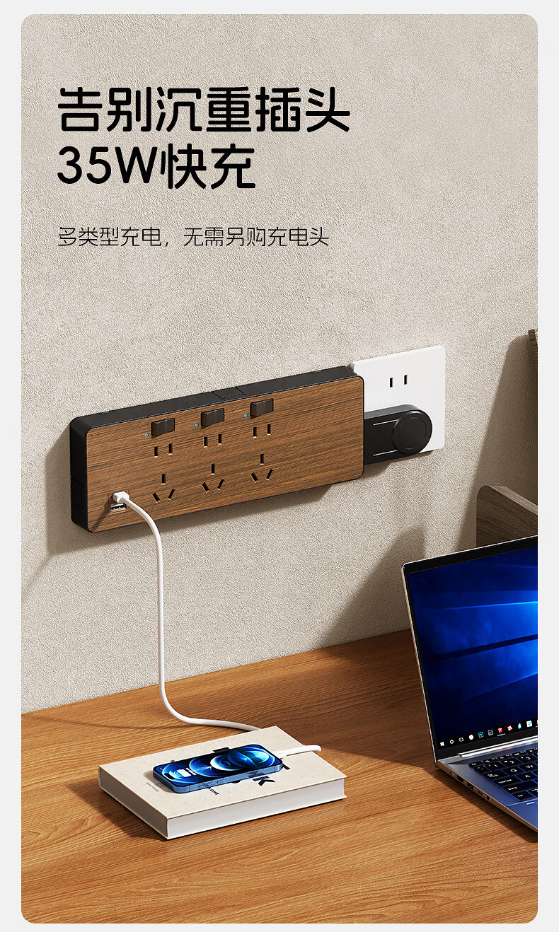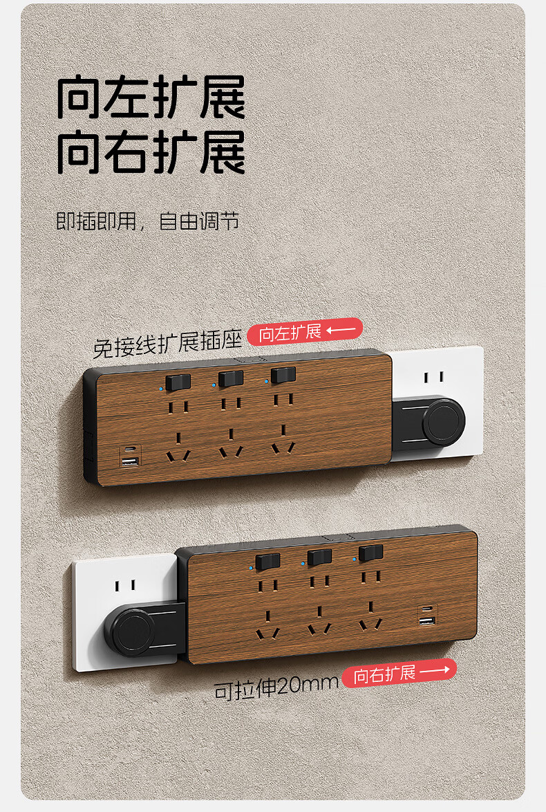 国际电工中古风木纹扩展插座一转多孔35W快充插排明装家用墙壁USB+C转换器 中古风木纹【向左扩展】35W快充USB+C-3开21孔