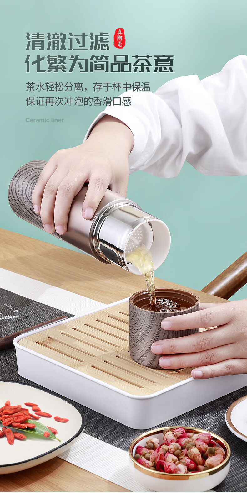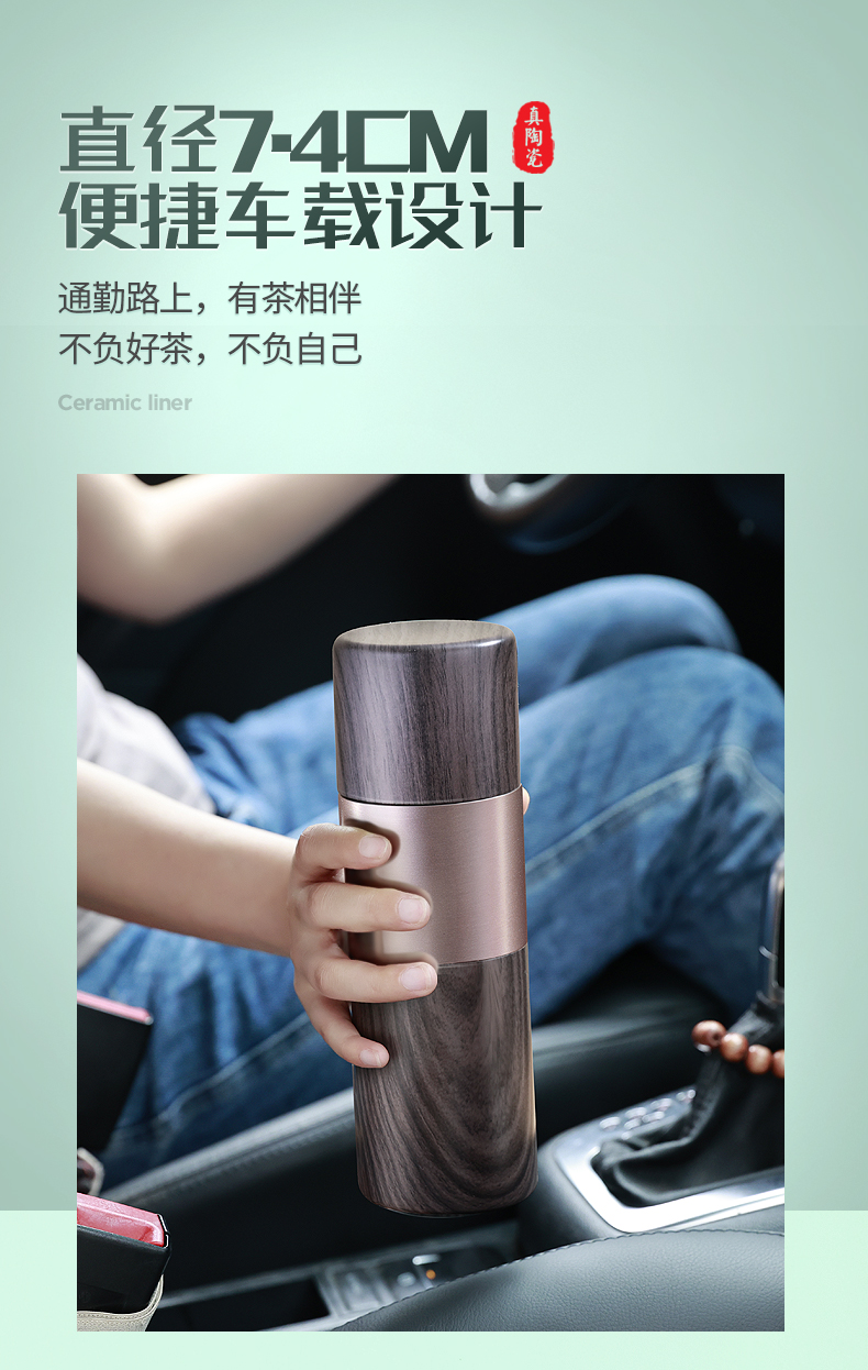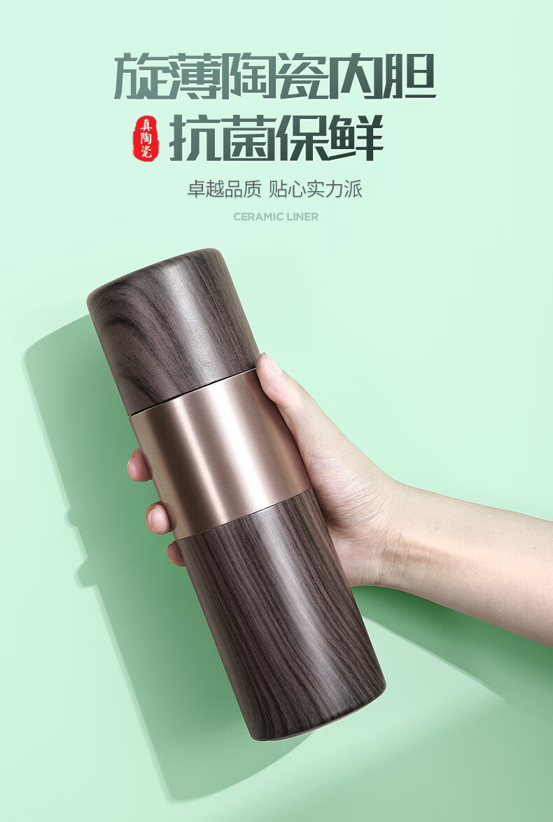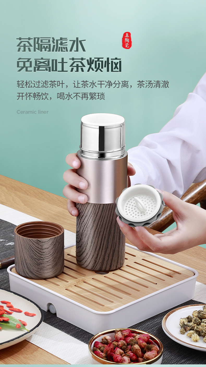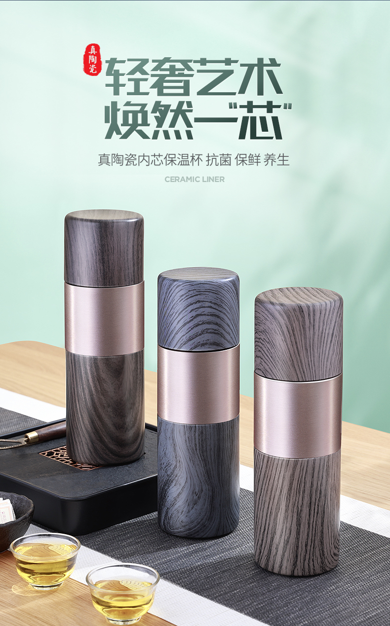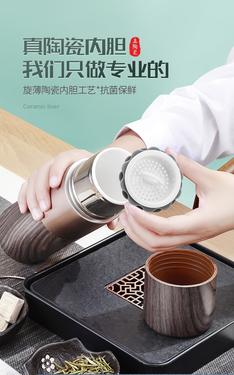 GROOT陶瓷内胆保温杯木纹运动便携水杯子男女办公室商务泡茶水杯礼品杯 升级款带陶瓷茶隔(浅棕色)