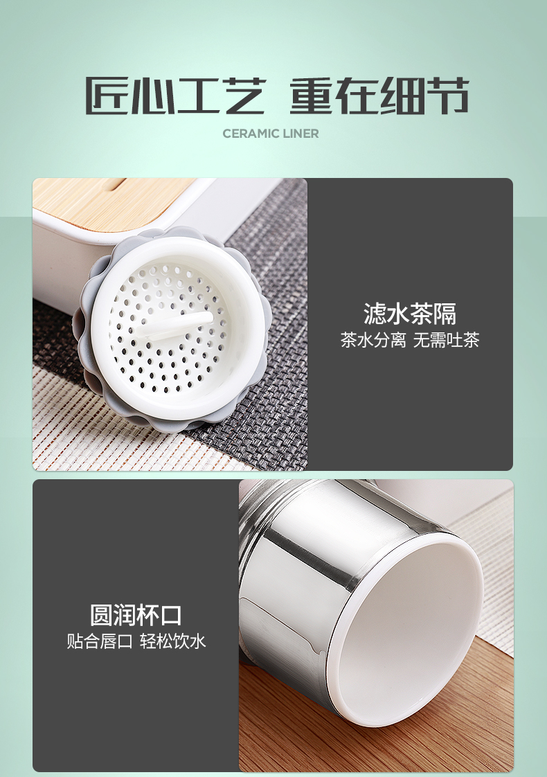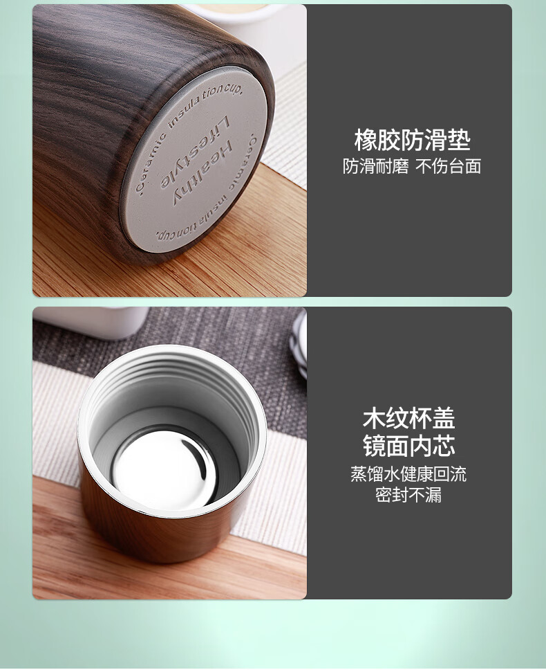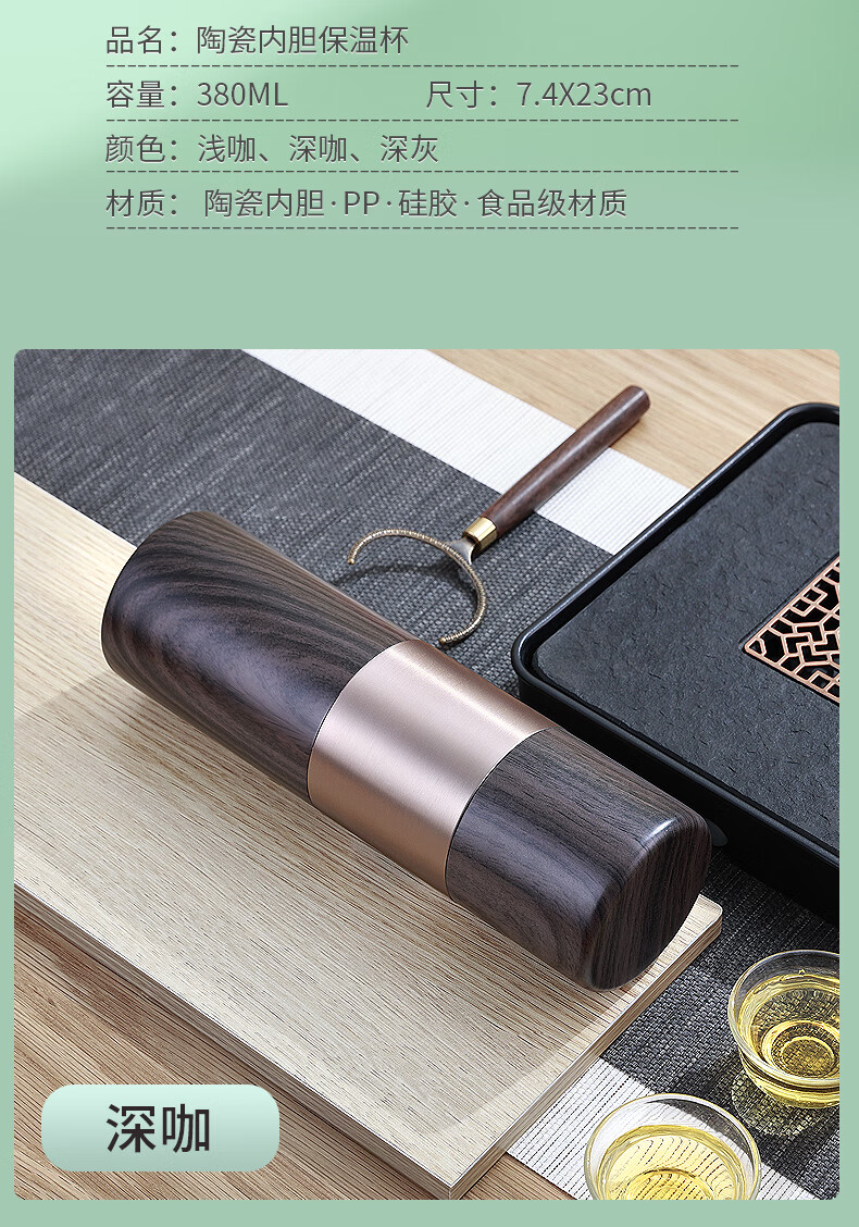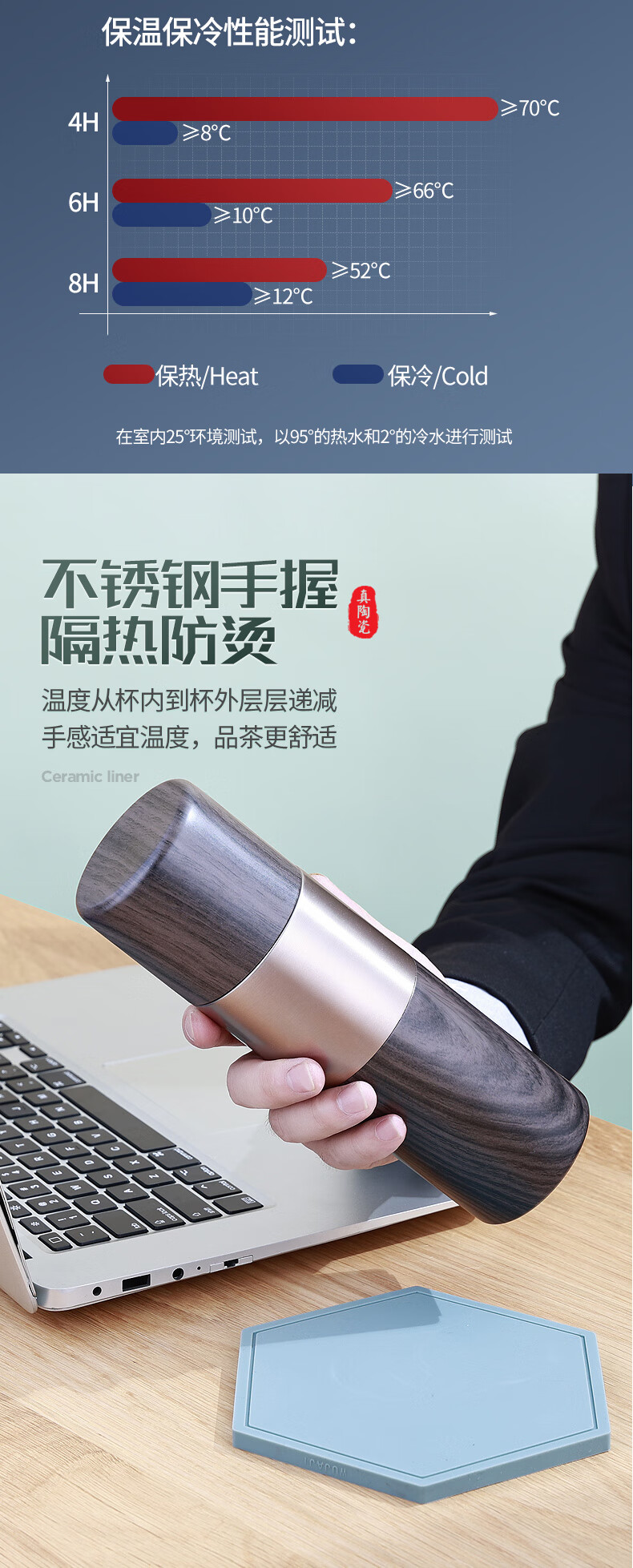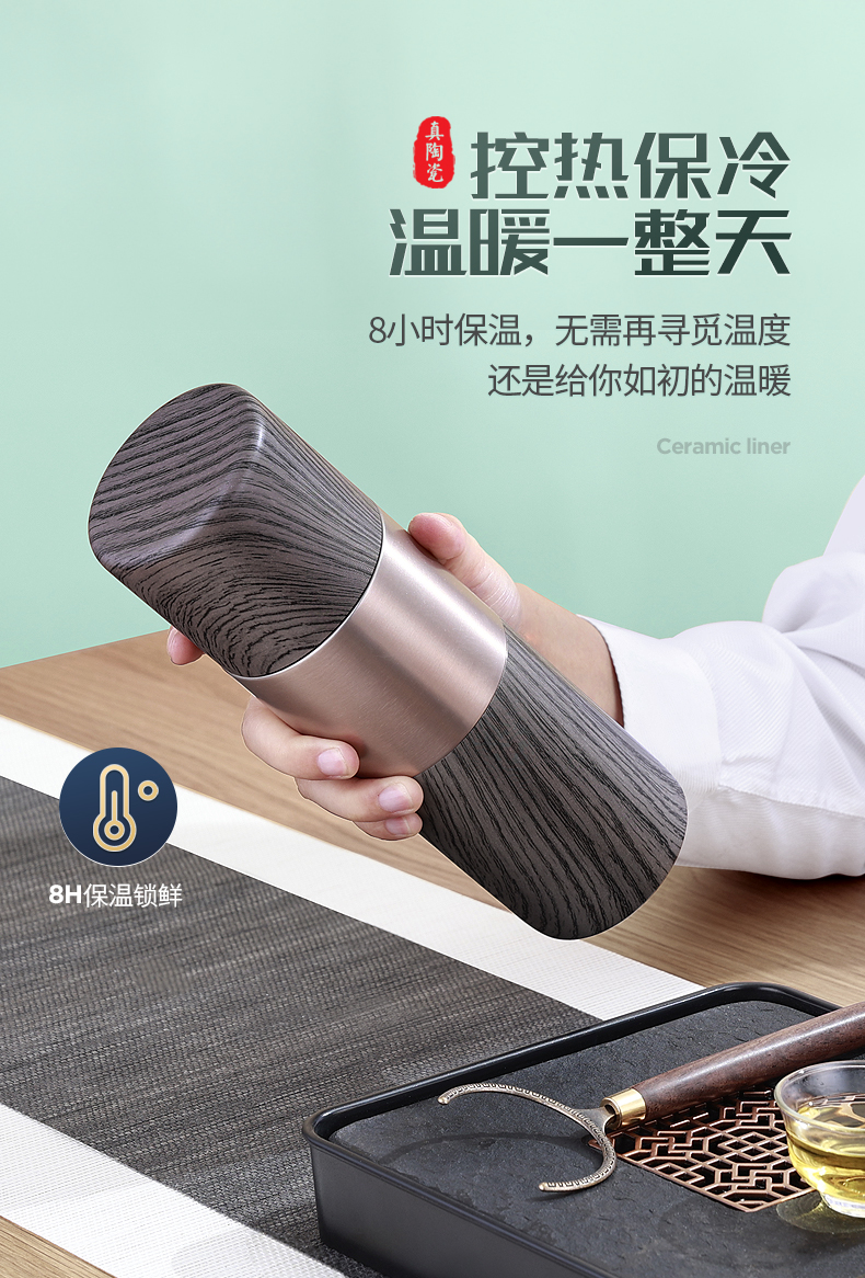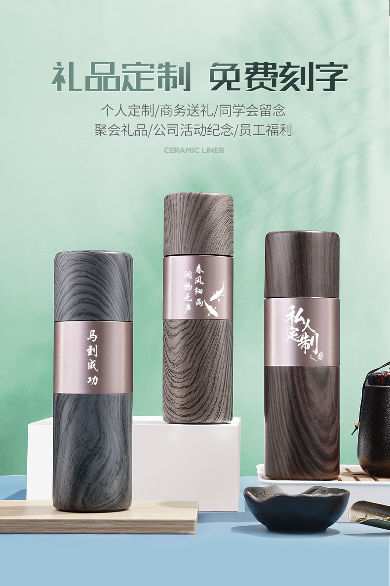 GROOT陶瓷内胆保温杯木纹运动便携水杯子男女办公室商务泡茶水杯礼品杯 升级款带陶瓷茶隔(浅棕色)