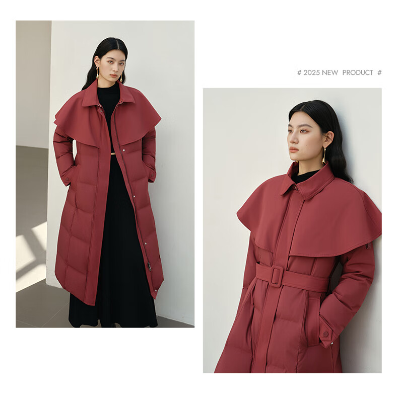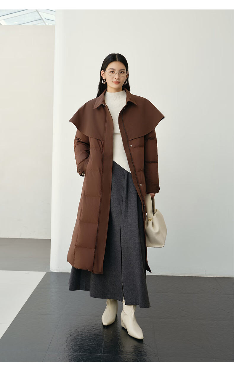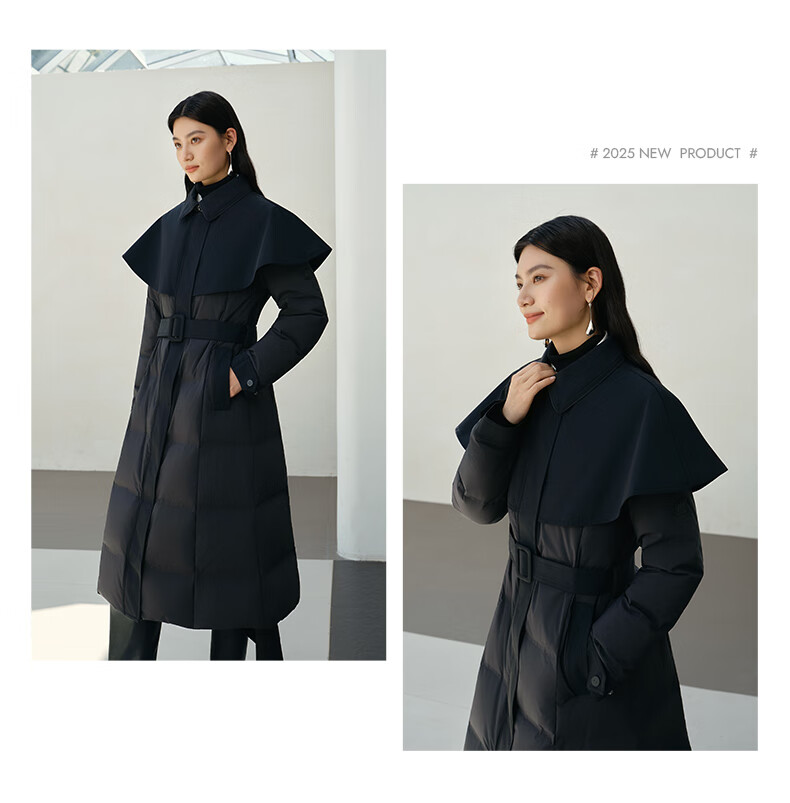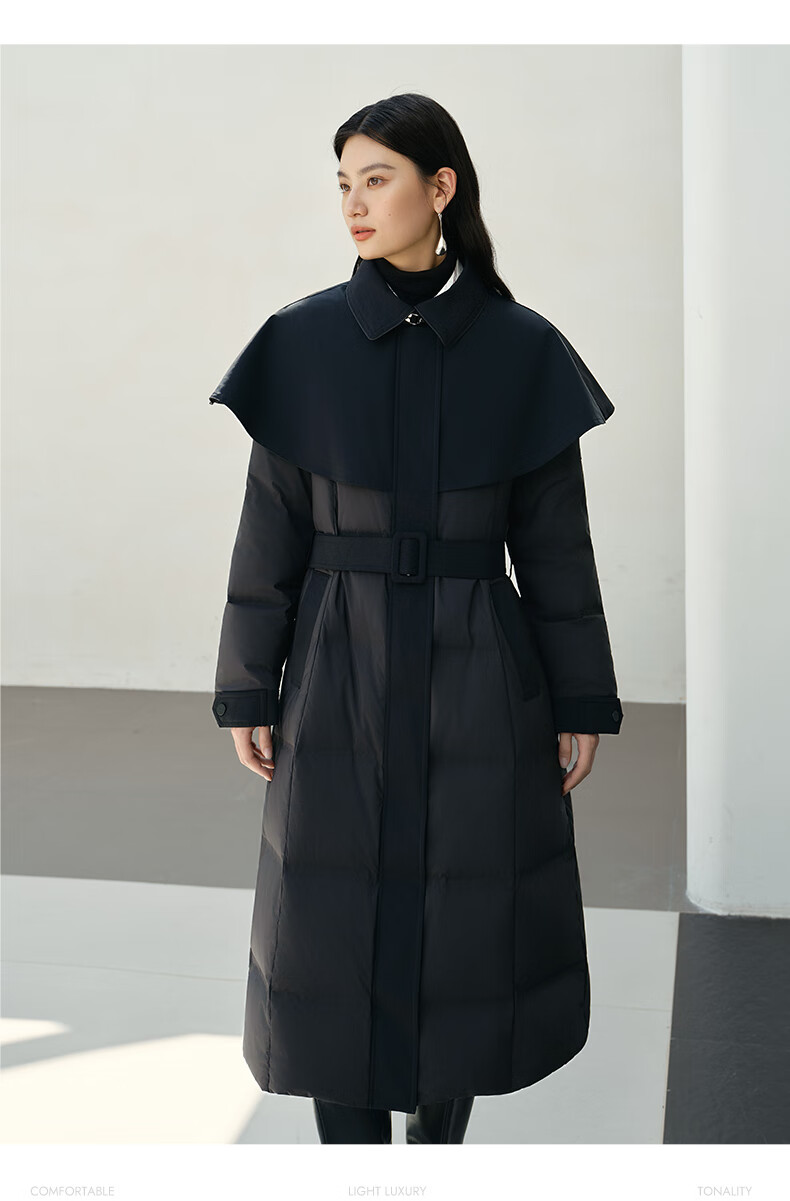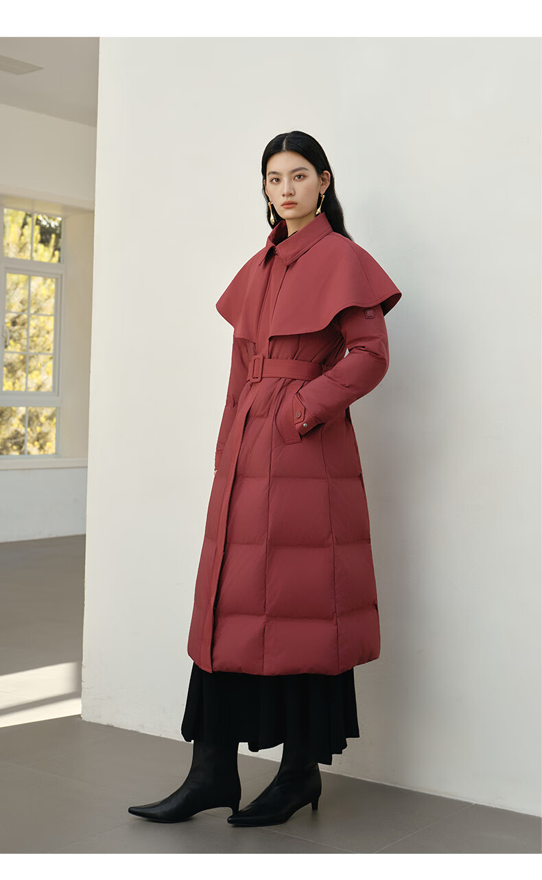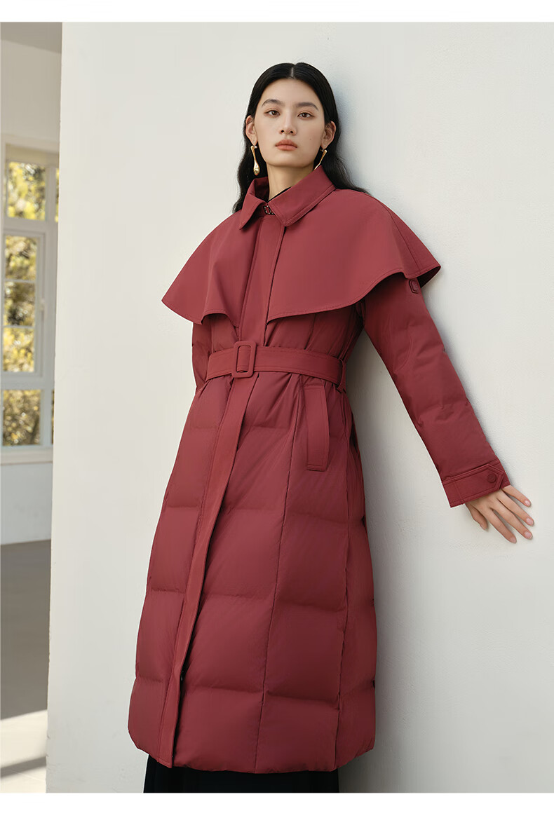 艾莱依(ERAL)女士羽绒服气质风衣斗篷长款外套披肩鹅绒收腰显瘦新年战袍骐骥红 炭黑 XL 170【建议125-140斤】