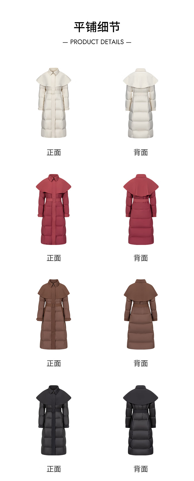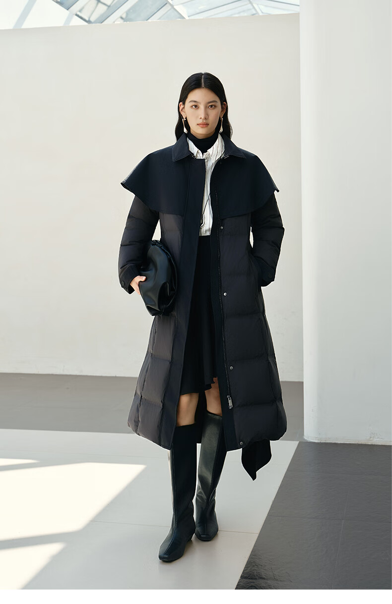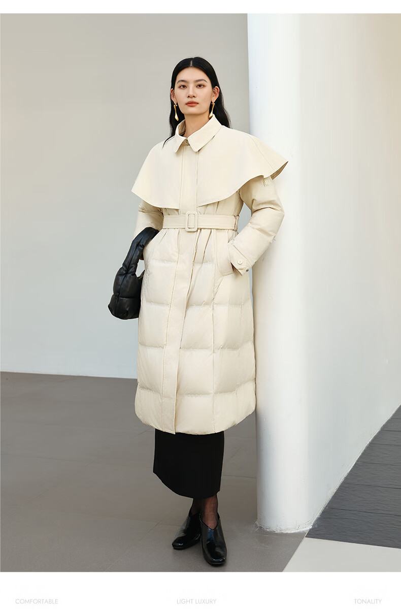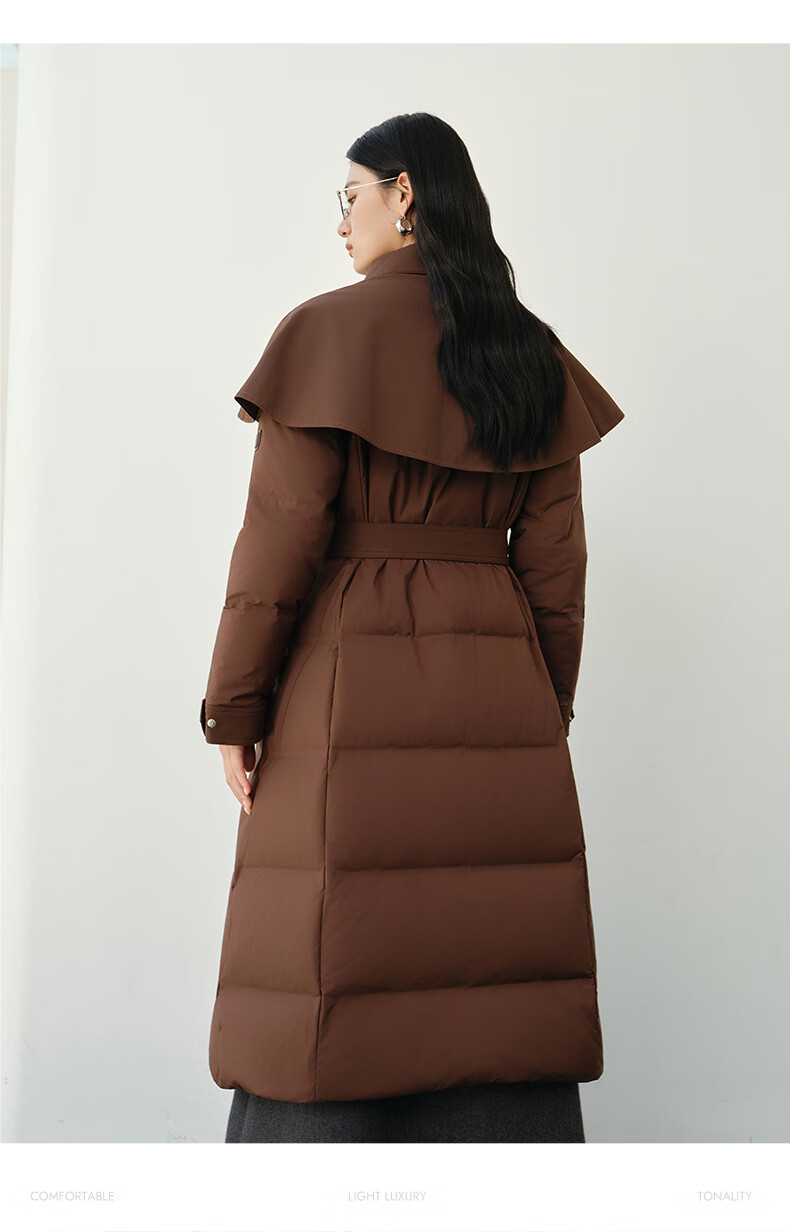 艾莱依(ERAL)女士羽绒服气质风衣斗篷长款外套披肩鹅绒收腰显瘦新年战袍骐骥红 炭黑 XL 170【建议125-140斤】
