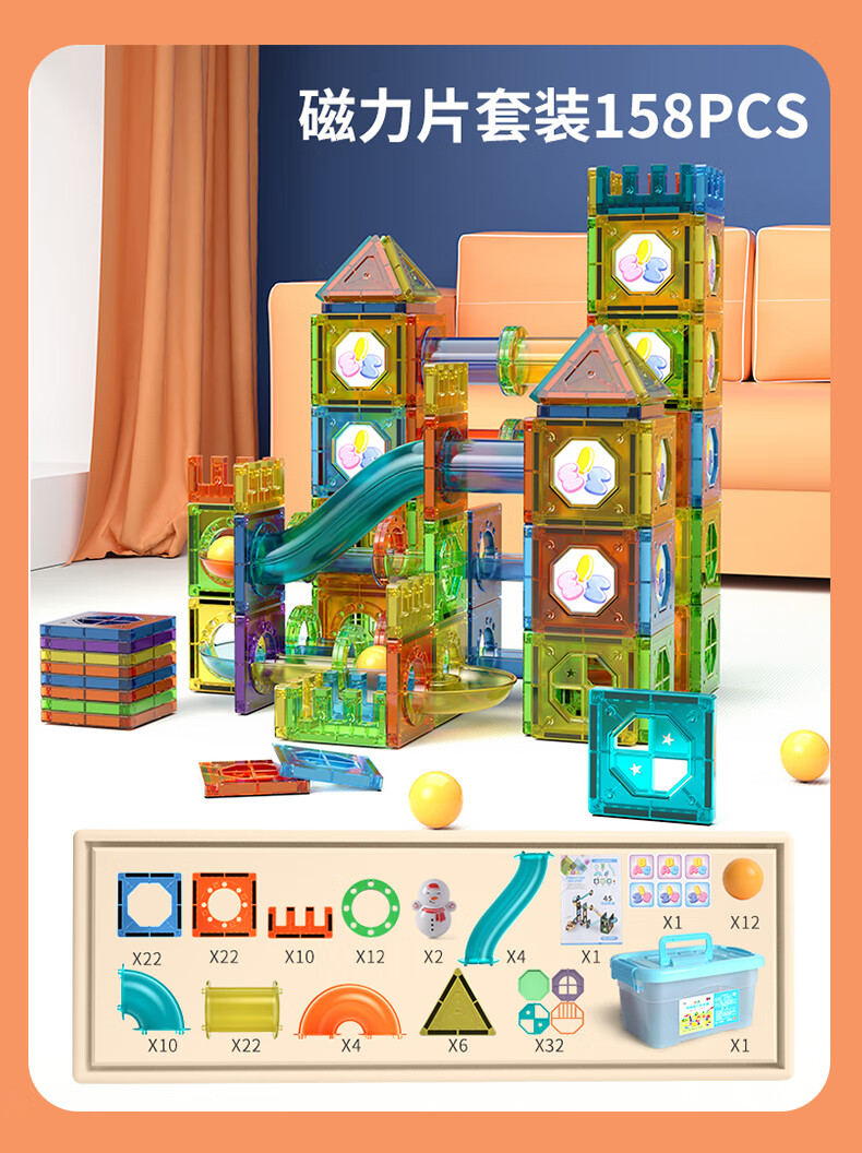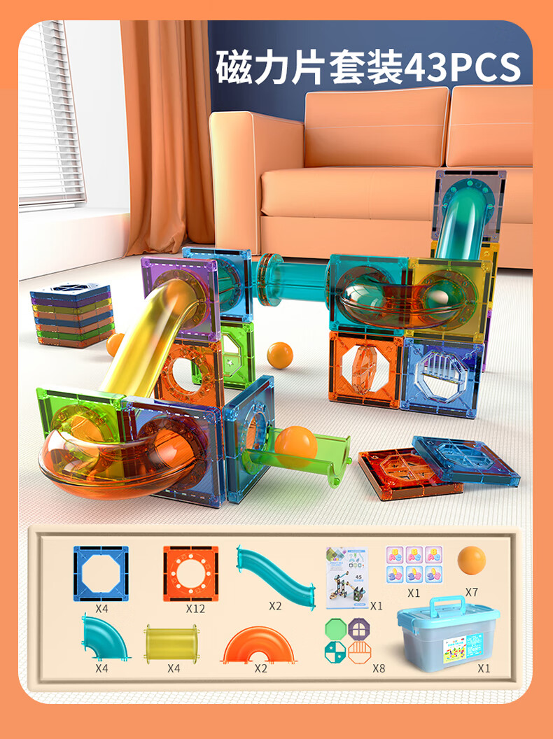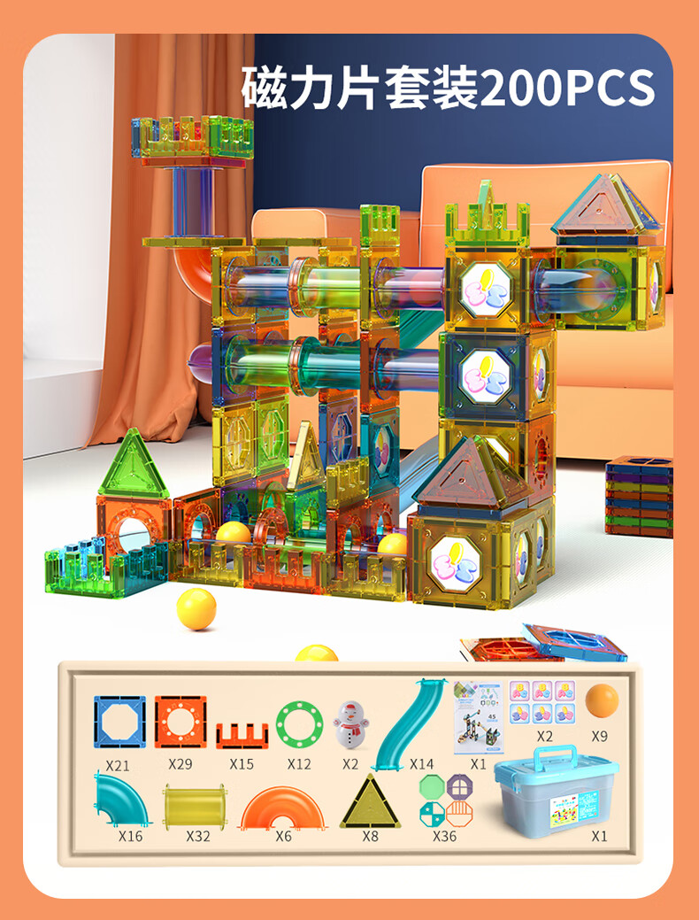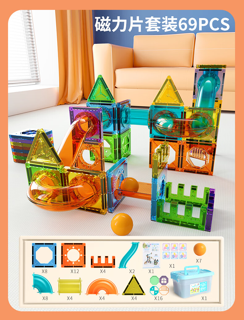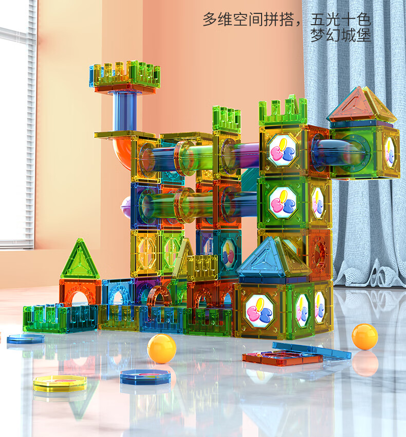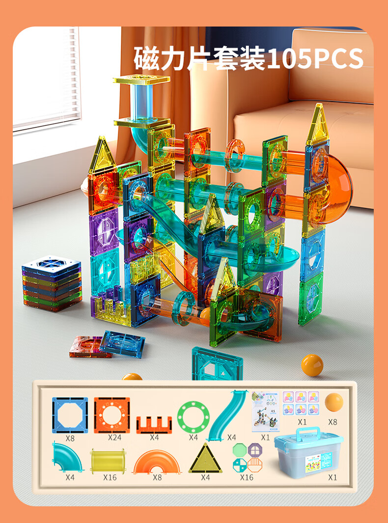 新奇源磁力片儿童益智玩具男孩磁力积木拼插磁力棒玩具3-6岁生日礼物 5.5cm磁力片滚珠管道105件套
