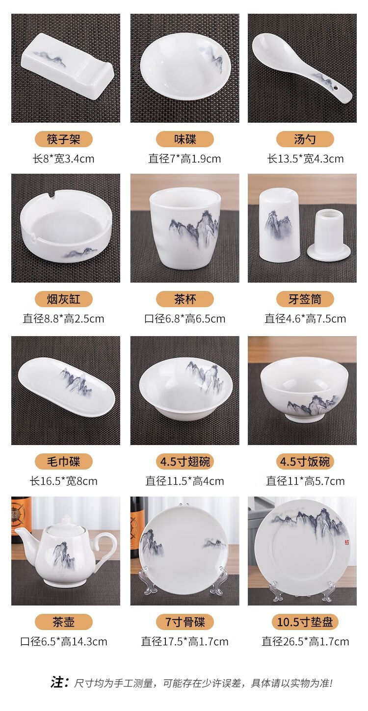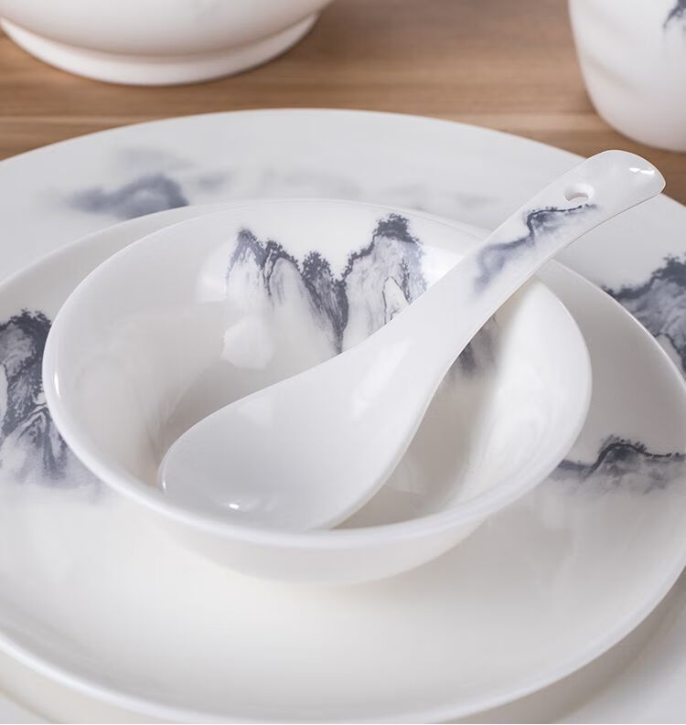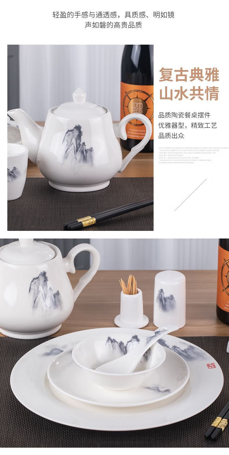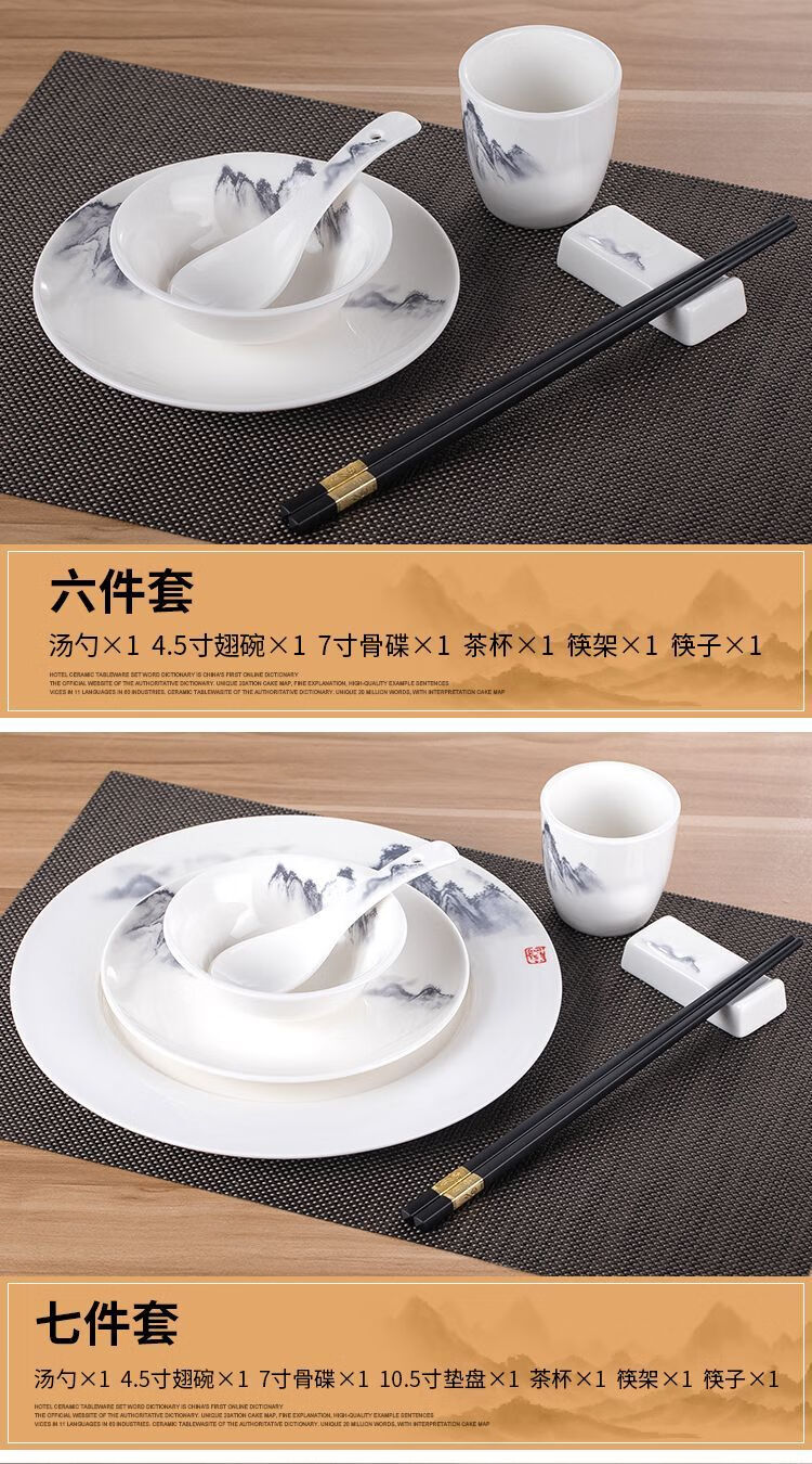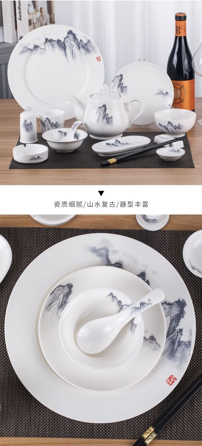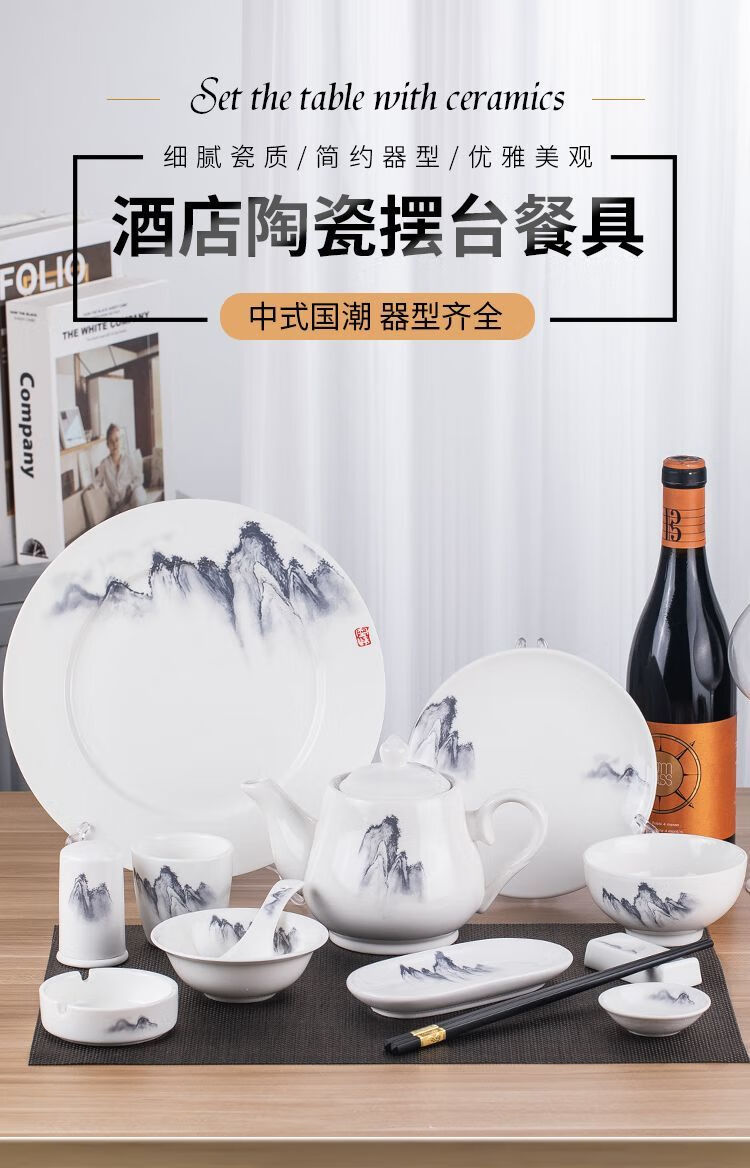 泰禧阁新中式高档酒店山水画摆台陶瓷餐具套餐饭店会所三件套骨碟碗杯勺 四件套A(山峰)