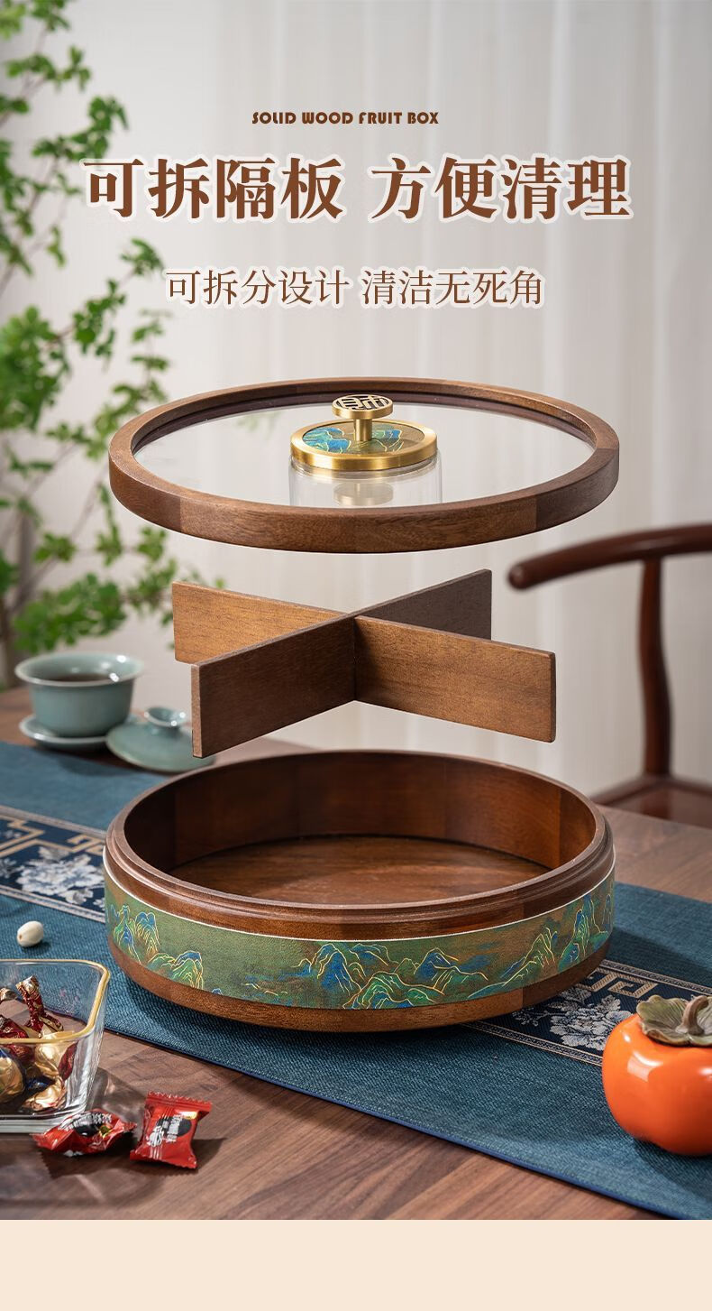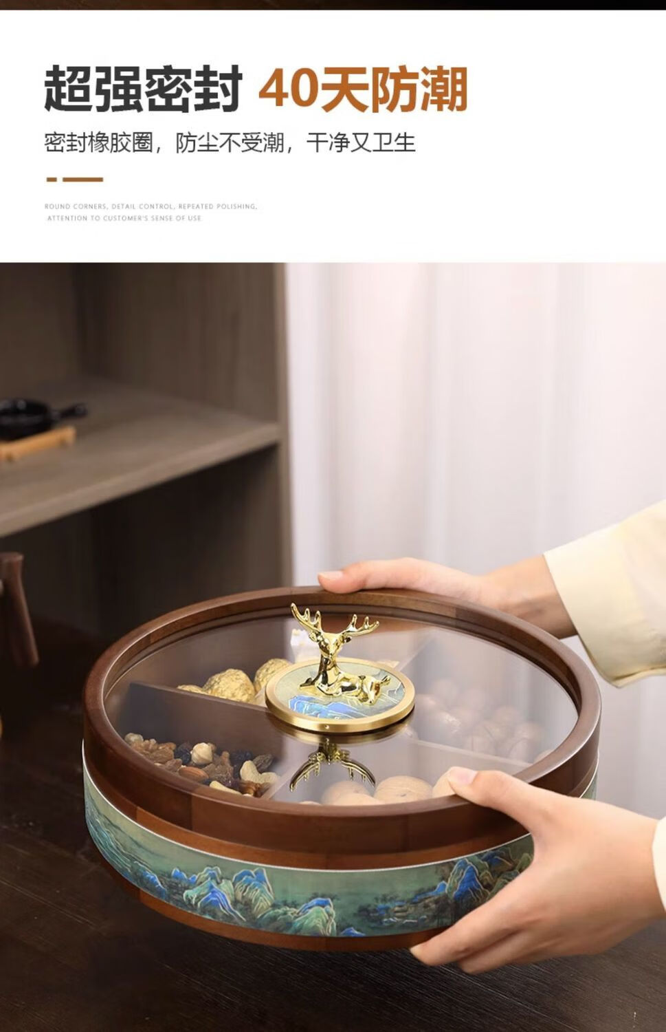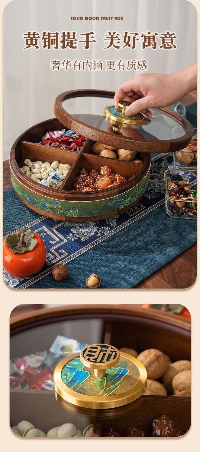 咏夏新中式实木干果盒千里江山零食收纳盒家用带盖分格客厅果盘 千里江山财柄四格