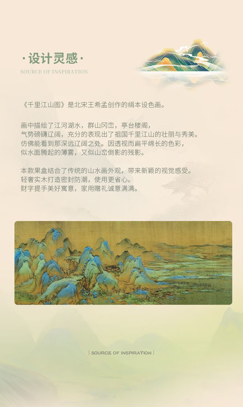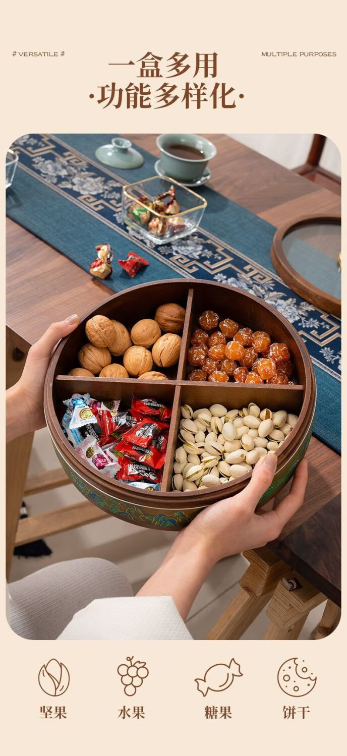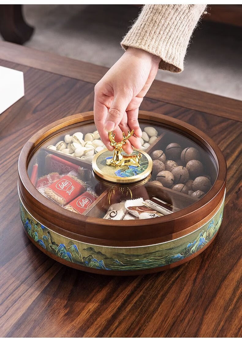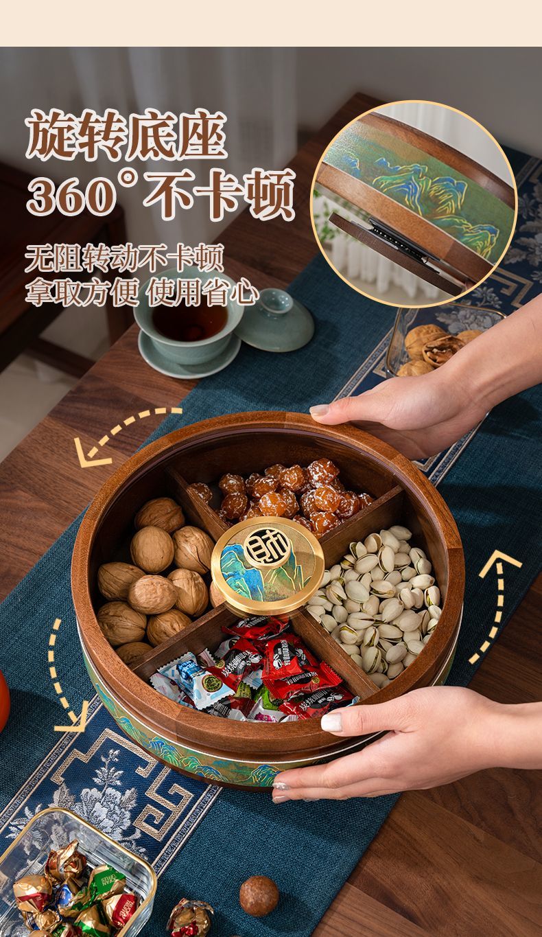 咏夏新中式实木干果盒千里江山零食收纳盒家用带盖分格客厅果盘 千里江山财柄四格
