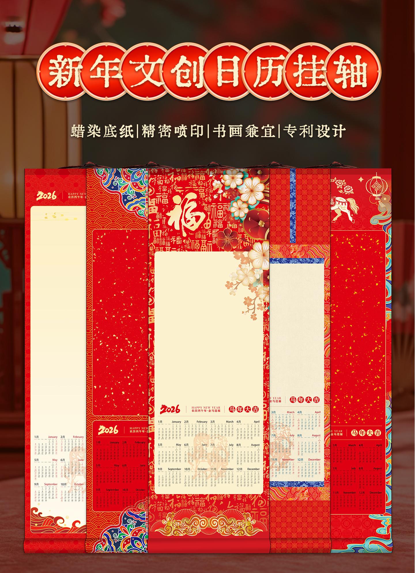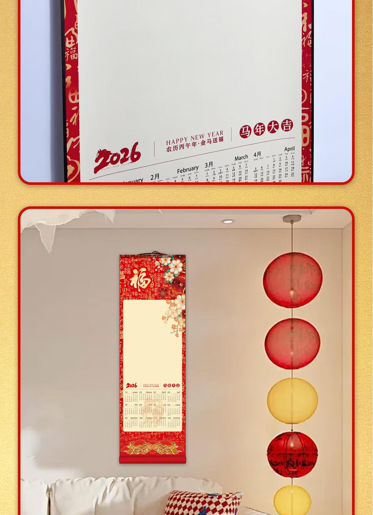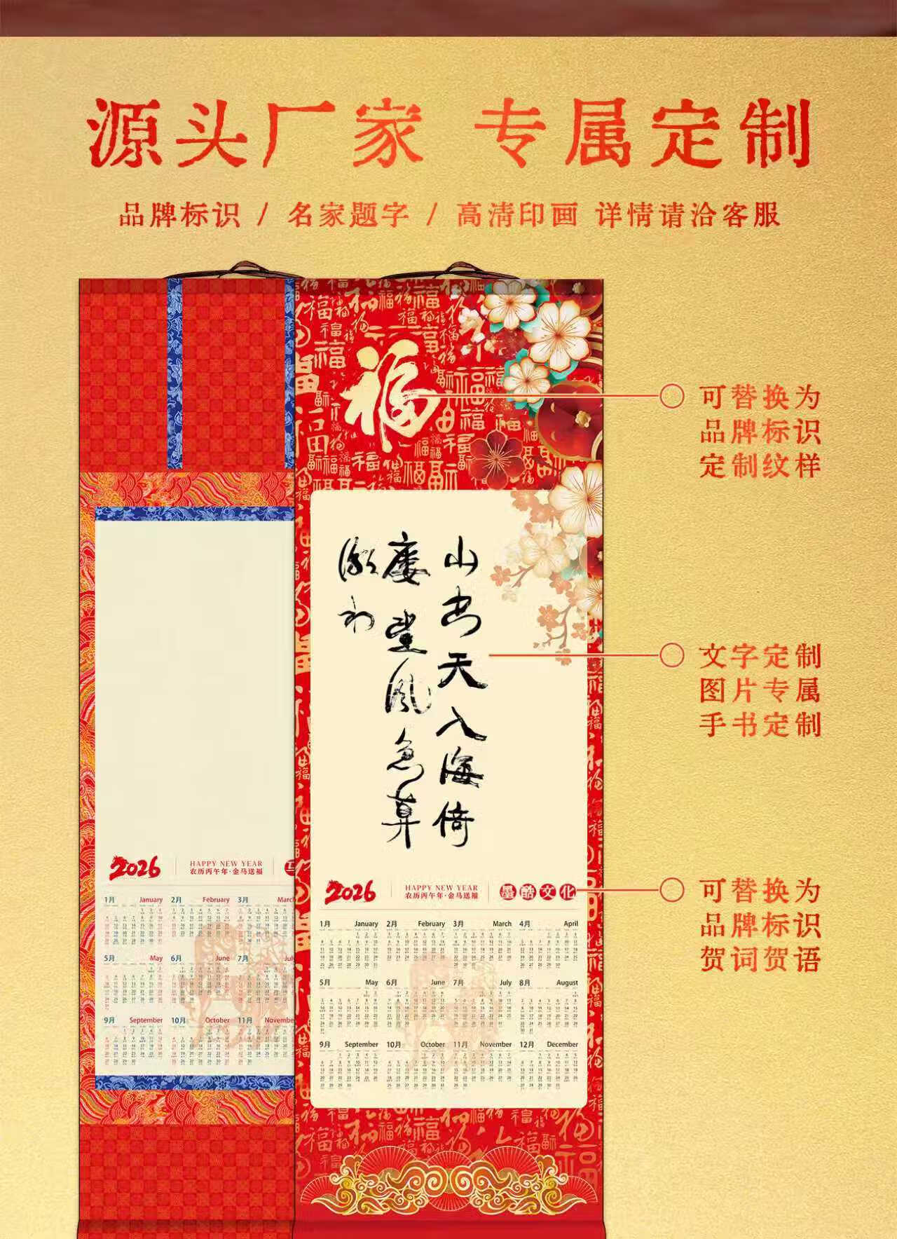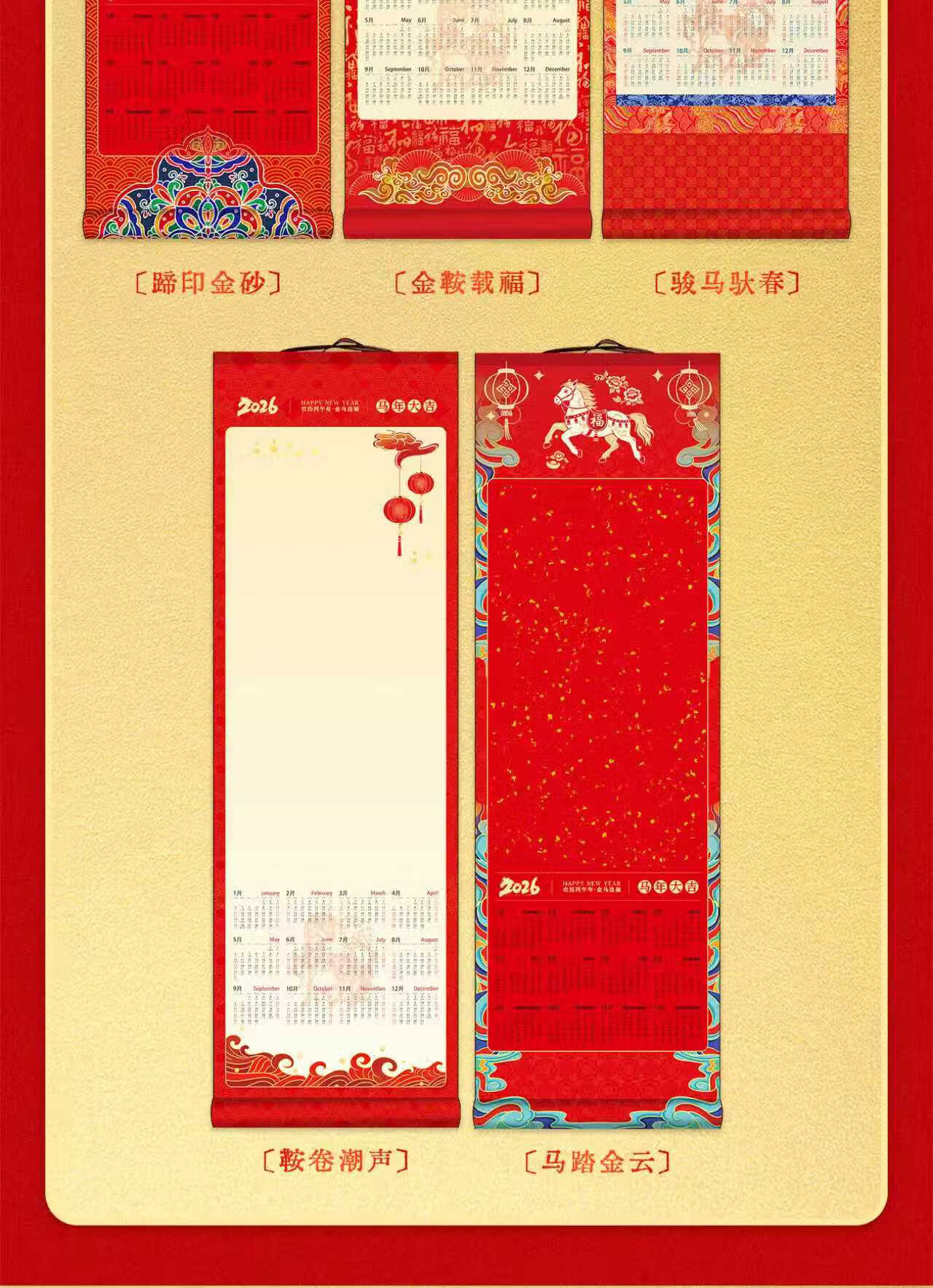 具才挂历2026年挂墙式家用办公高档卷轴日历马年龙马精神水墨风骏马画手撕月历年历竹席款13张筒装厂直