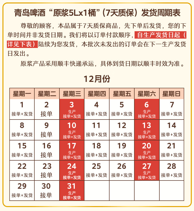 青岛啤酒原浆 7天新鲜直送原浆 原麦汁浓度13°P 5L 1桶 整箱装 【每周三/六生产】