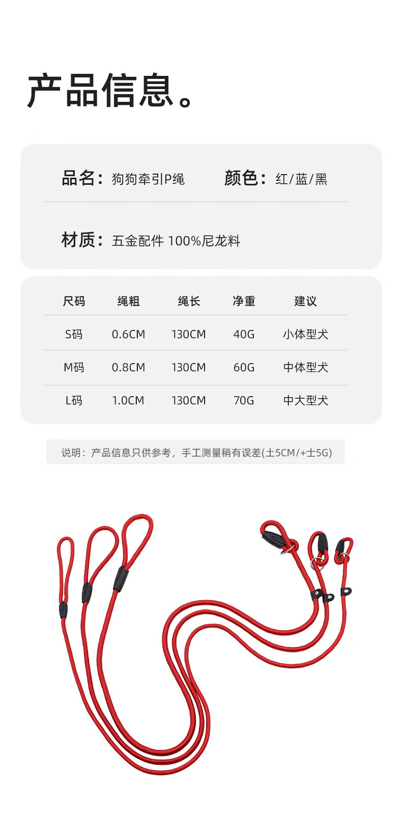 中小型宠物用品狗狗牵引带P绳宠物狗绳P链宠物用品优质尼龙 蓝色 0.6*130cm