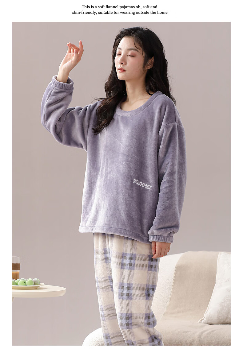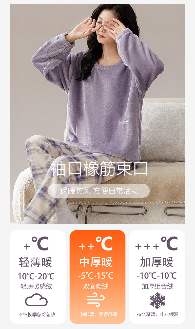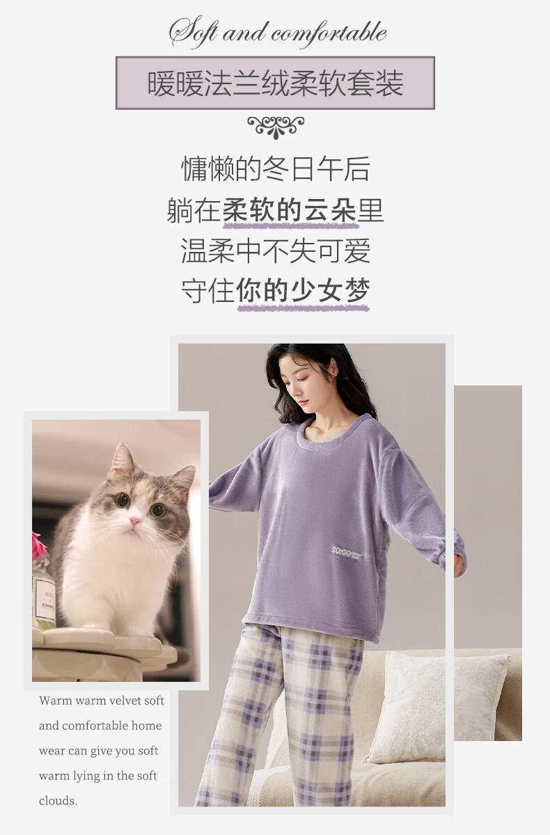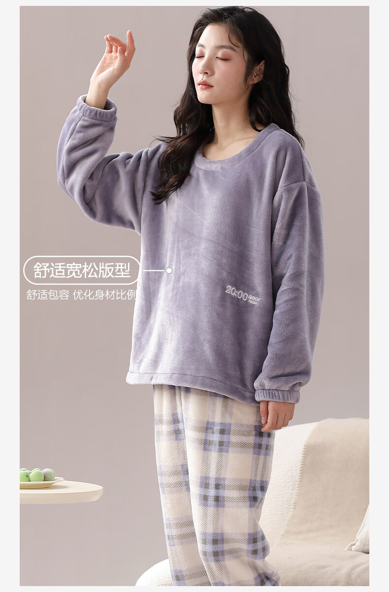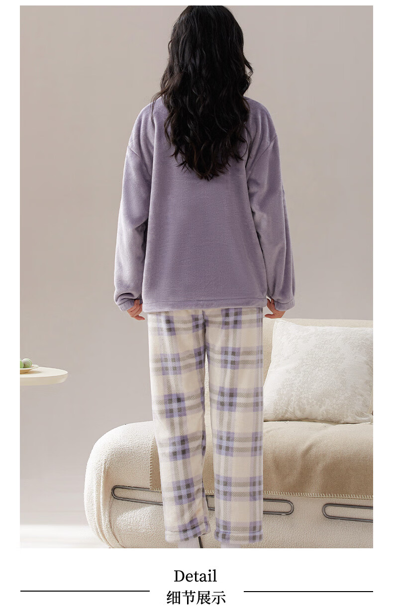 宜而爽睡衣秋冬季法兰绒加绒加厚保暖长袖长裤套装休闲可外穿家居服 格子裤女款【上衣+束脚裤子】 L