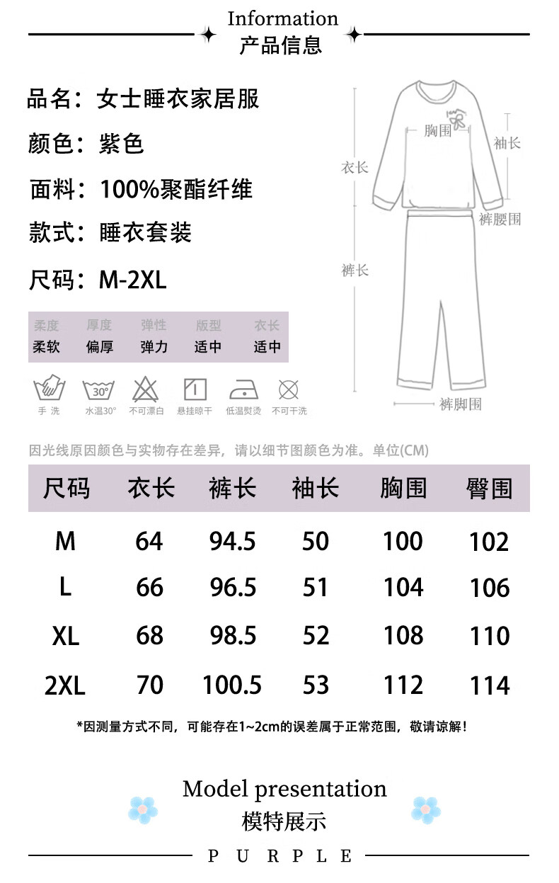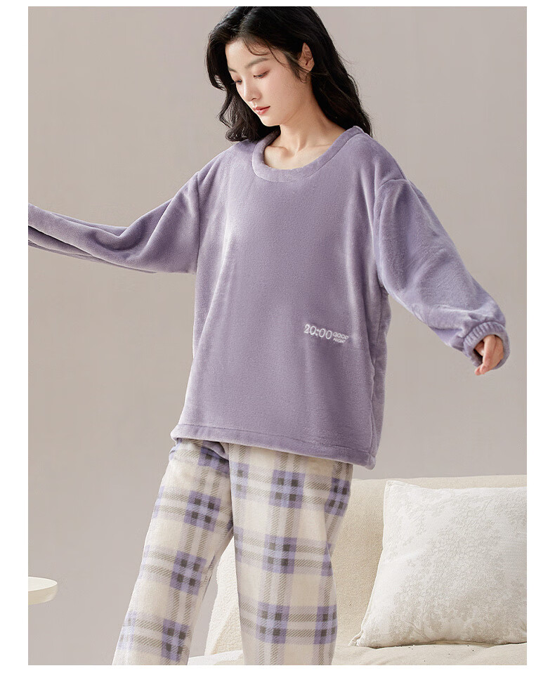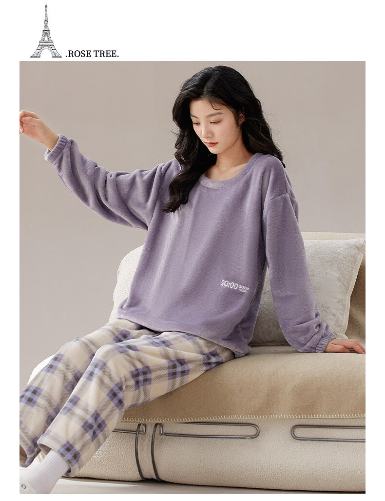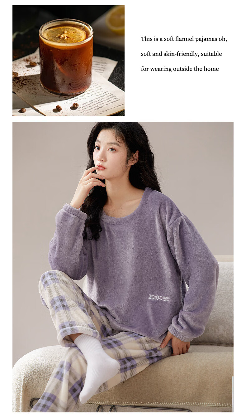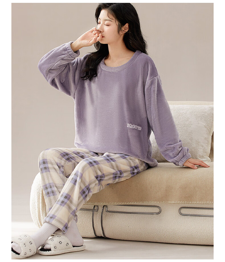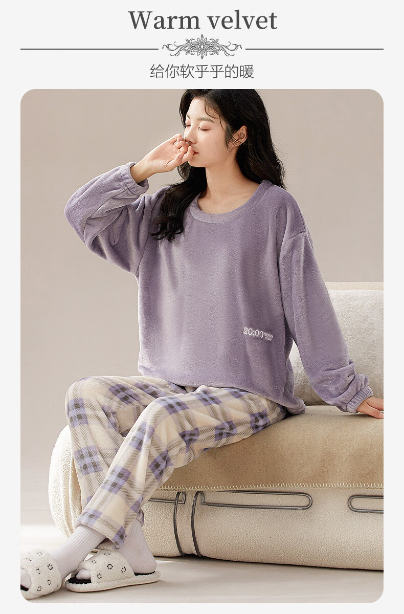 宜而爽睡衣秋冬季法兰绒加绒加厚保暖长袖长裤套装休闲可外穿家居服 格子裤女款【上衣+束脚裤子】 L