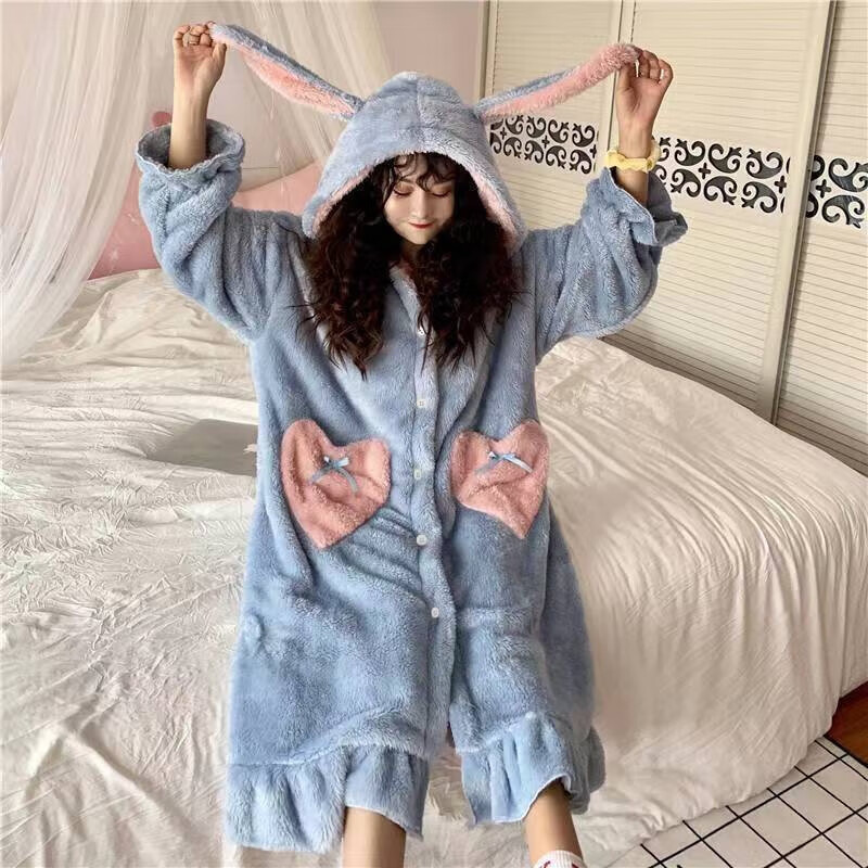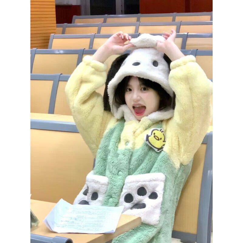 宝娜斯睡衣软绵珊瑚绒保暖睡衣女秋季加厚暖暖绒家居服上衣睡袍 绿色彩虹睡袍 均码 【适合80-155】