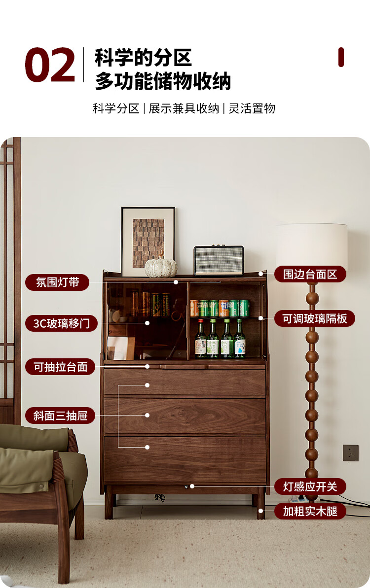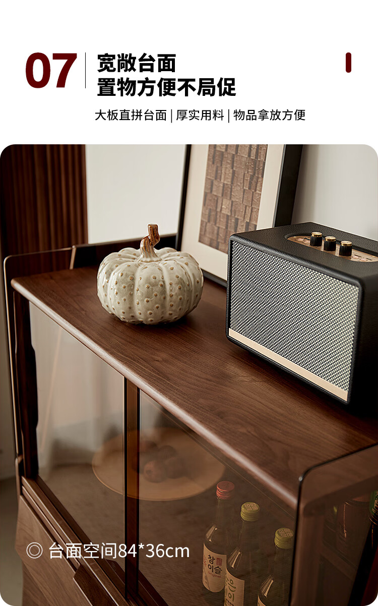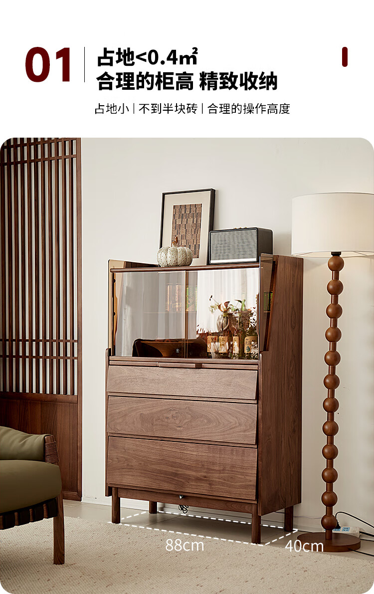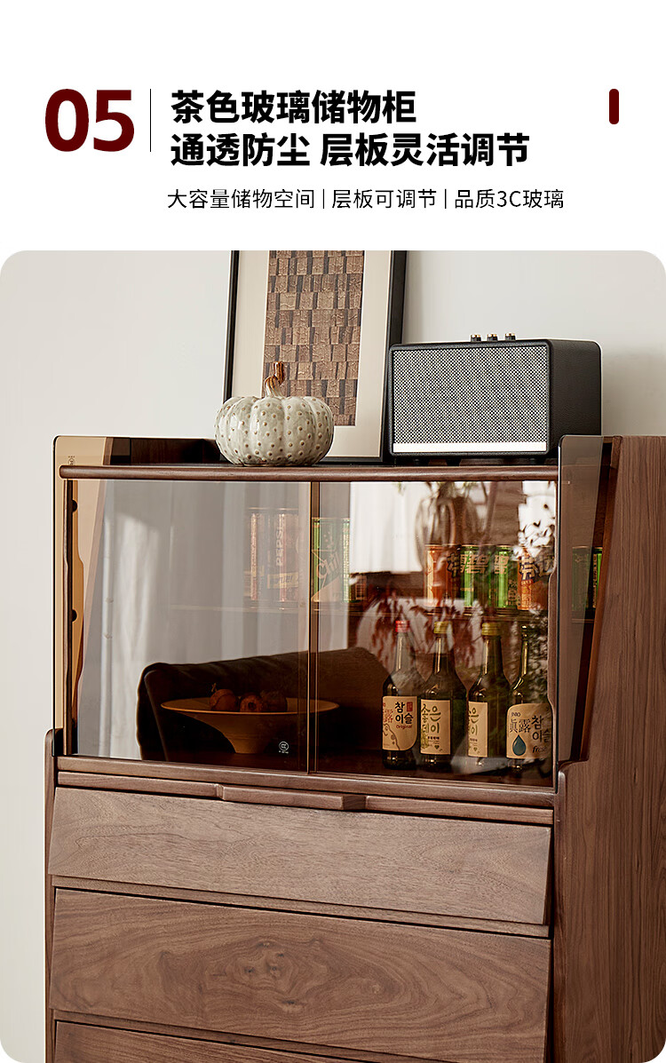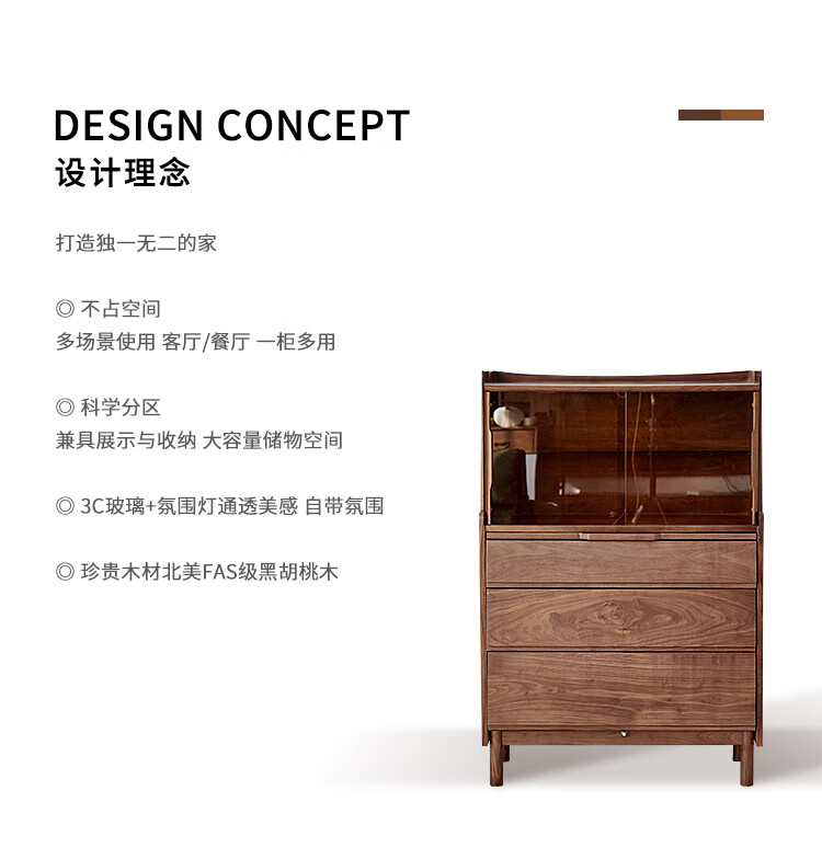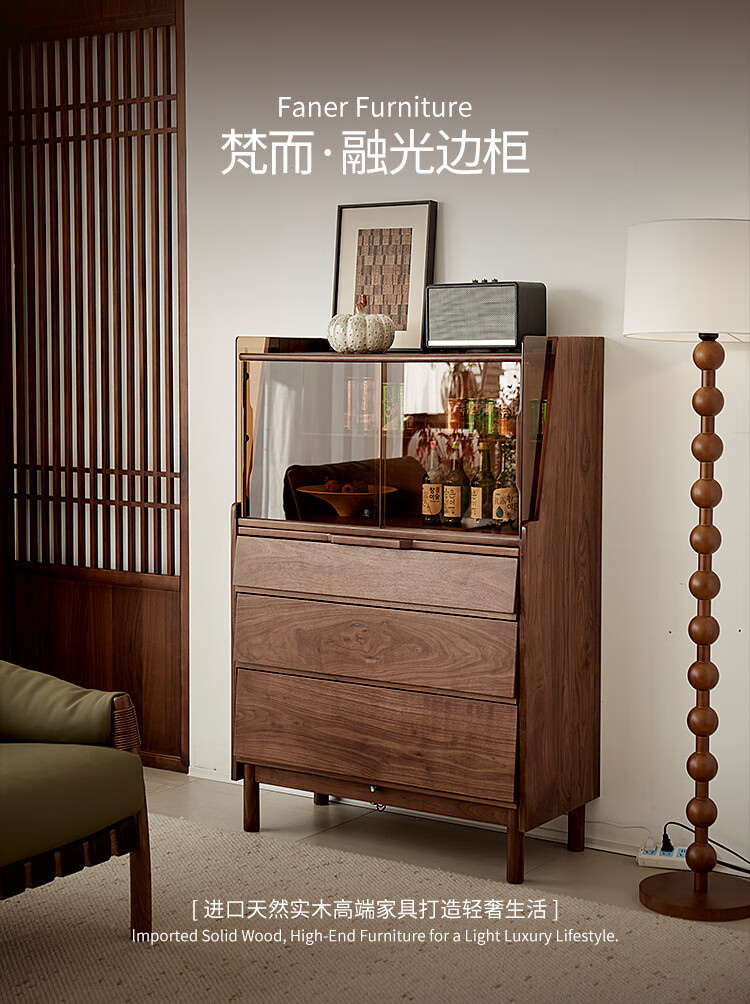 梵而餐边柜实木橱柜北美黑胡桃现代简约靠墙高脚斗柜餐厅储物收纳酒柜 融光边柜【北美黑胡桃】
