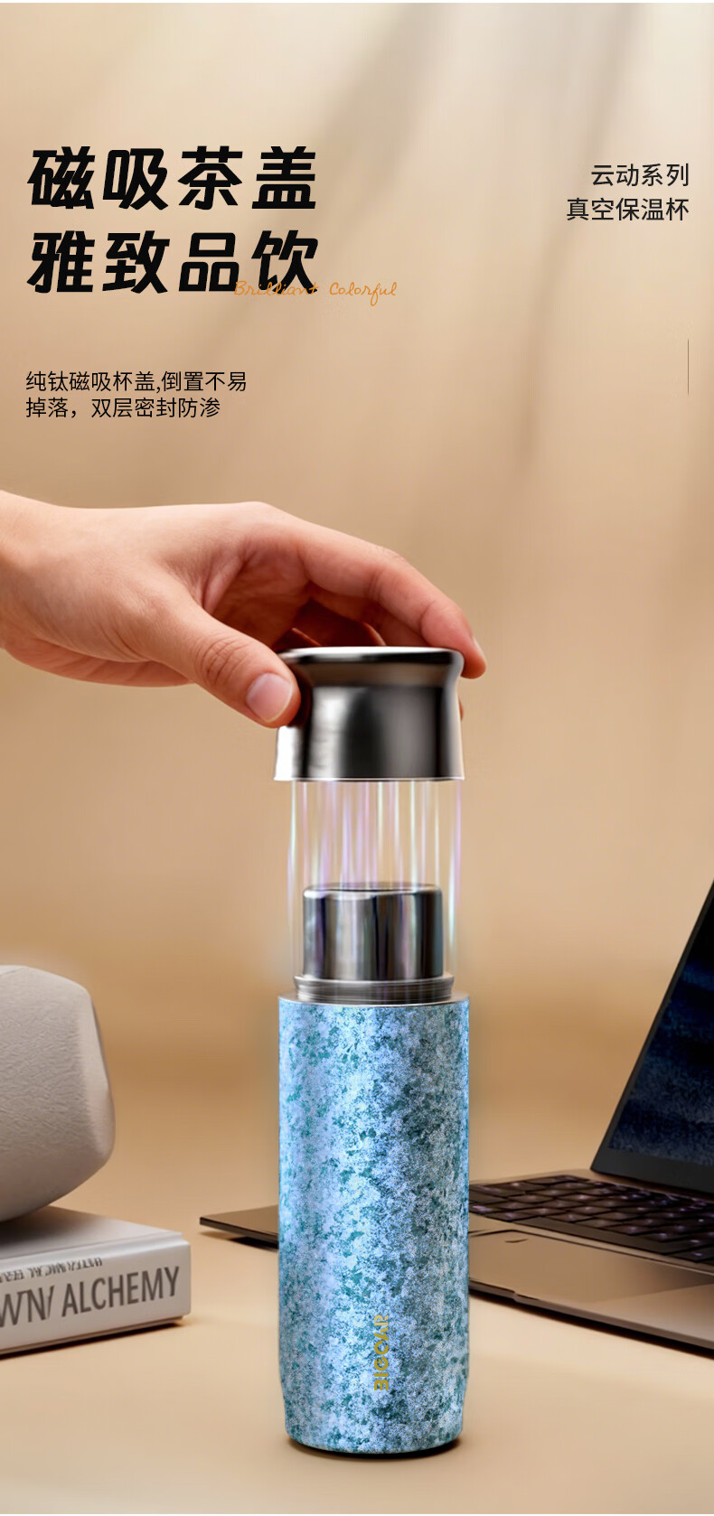 大卡纯钛保温杯高档焖茶杯茶水分离养生泡茶水杯商务办公礼品钛杯定制 青釉星碎【纯钛+礼盒】430ml