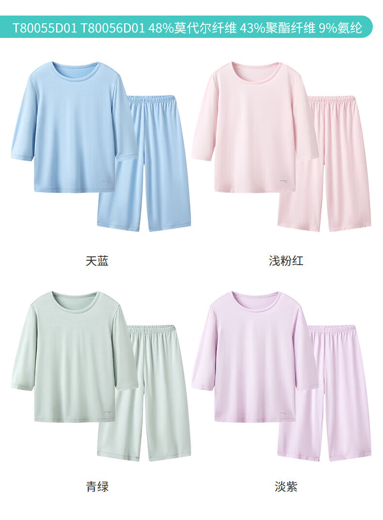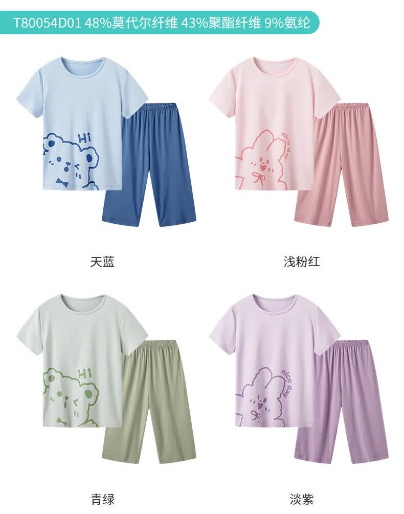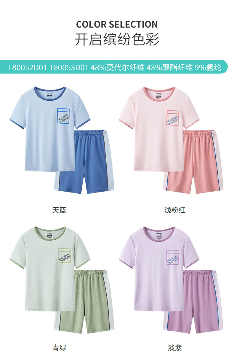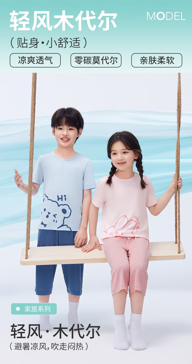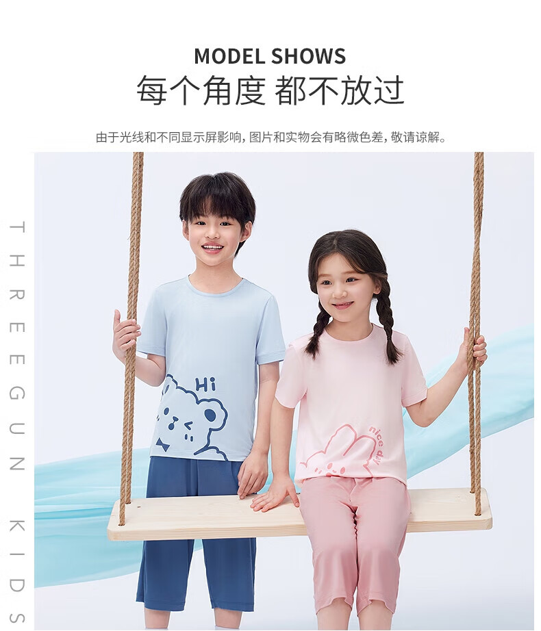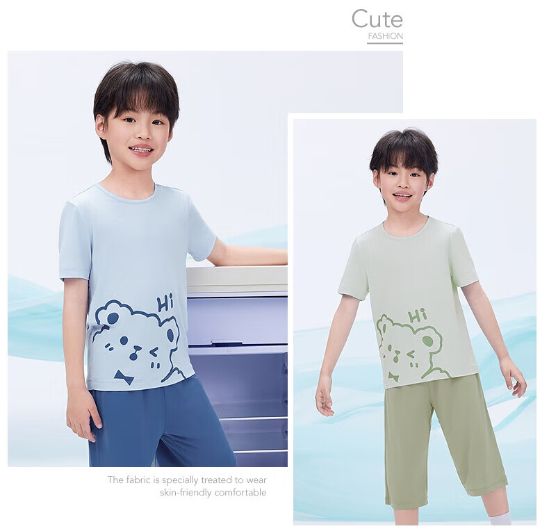 三枪童装新款凉感莫代尔防螨抑菌男童女童吸湿排汗中袖中裤圆领家居服 中袖中裤青绿 150