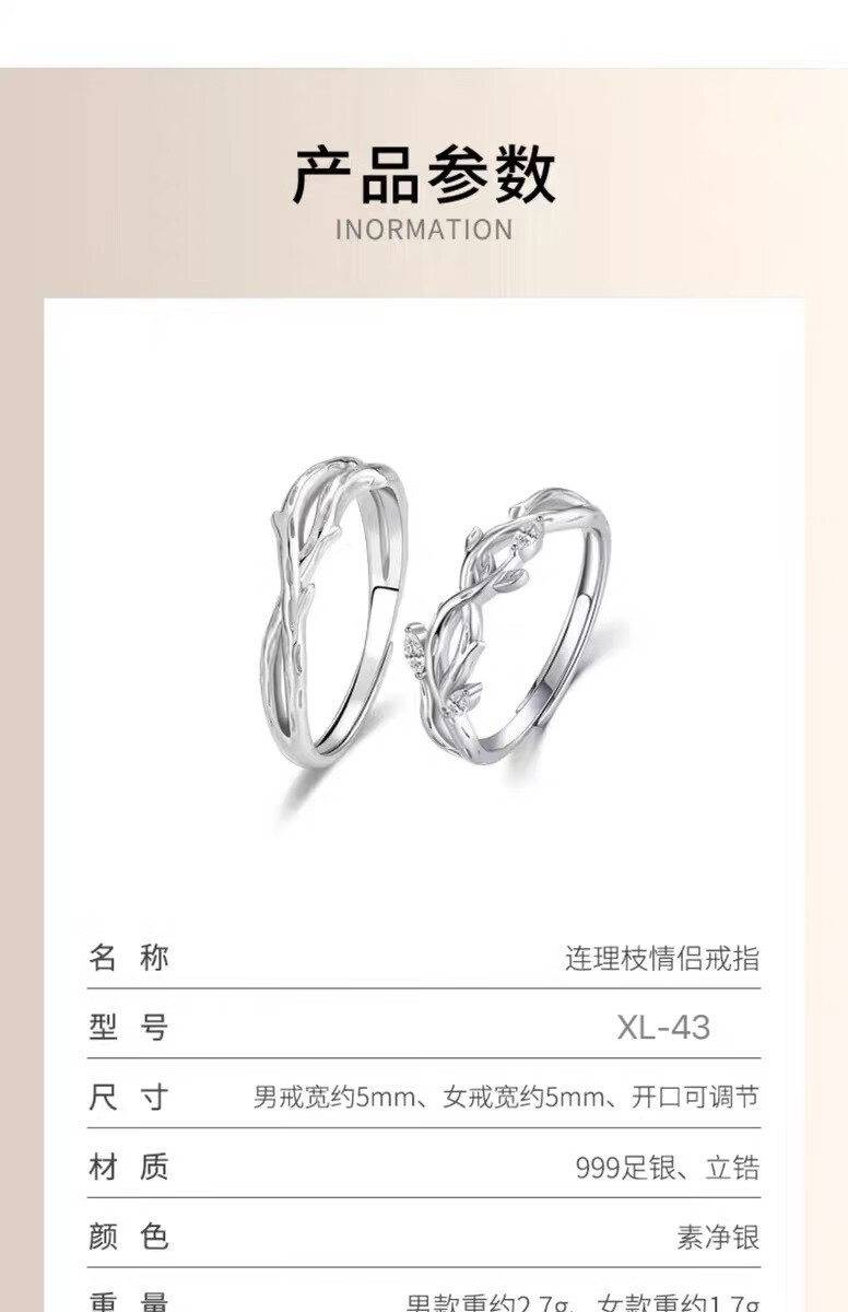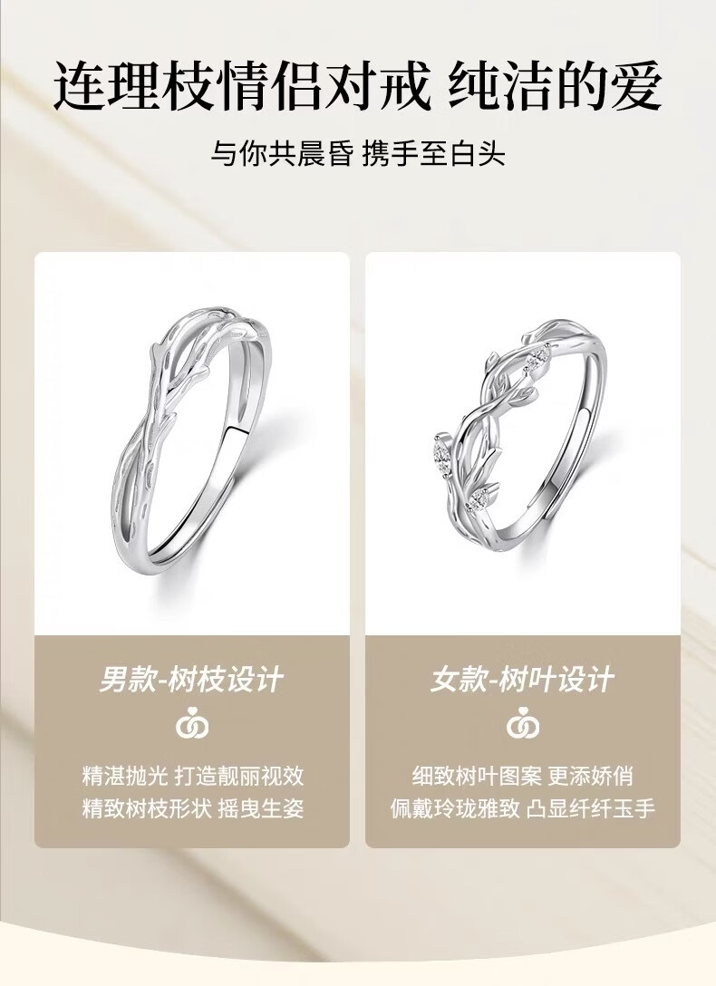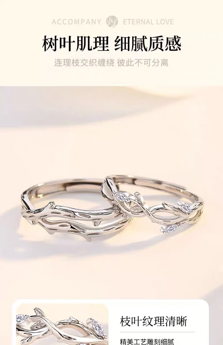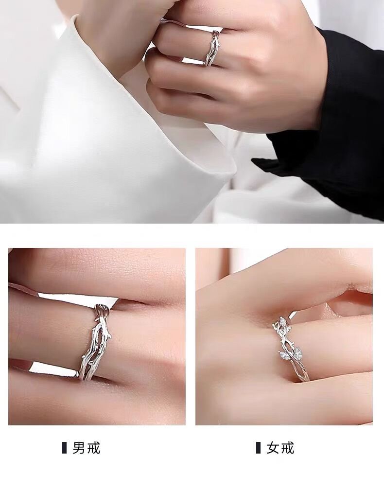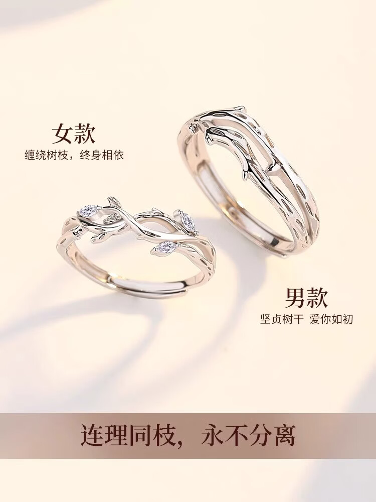 S999纯银连理枝情侣对戒轻奢感戒指情人节生日送女友男友 S999足银 -男 开口可调节