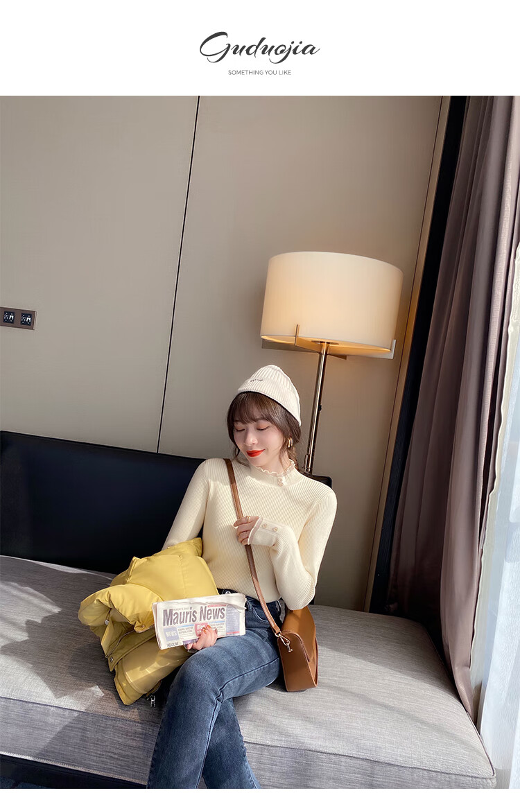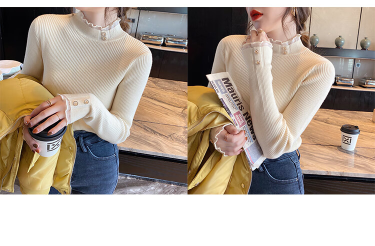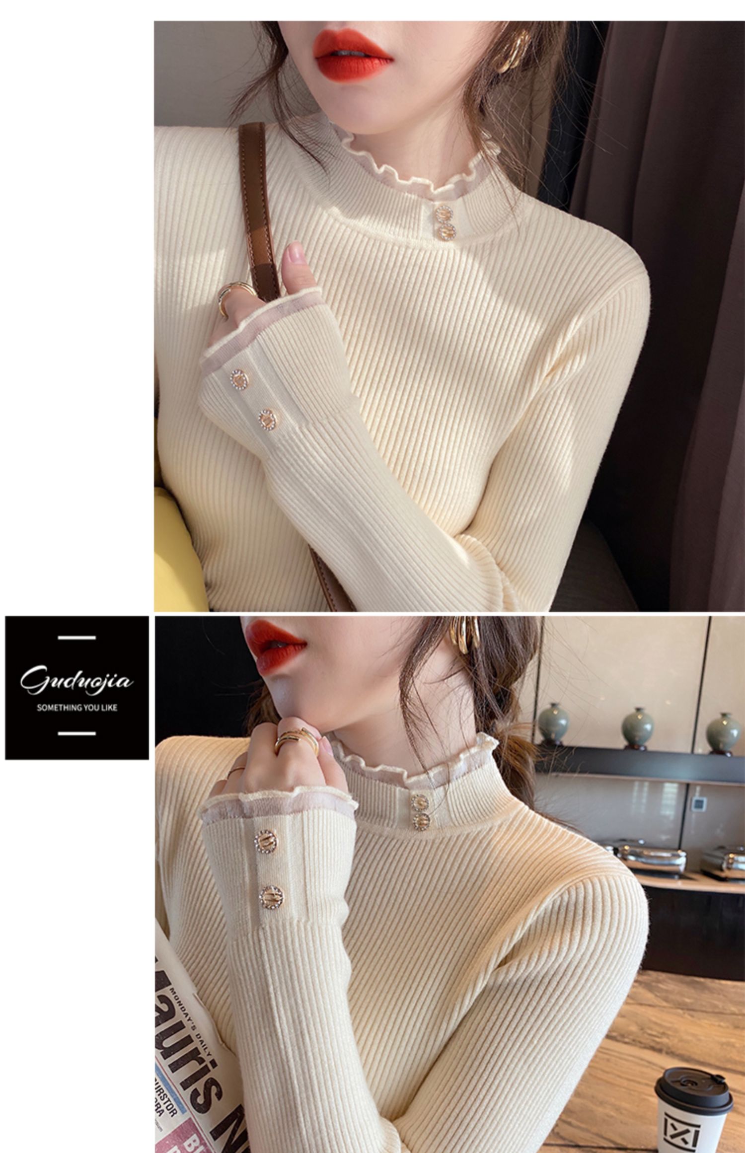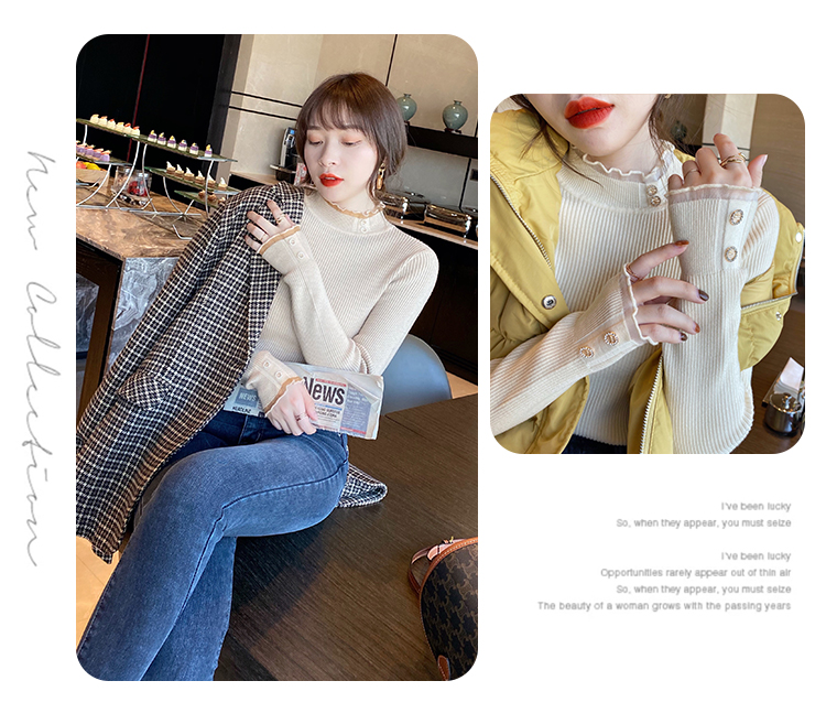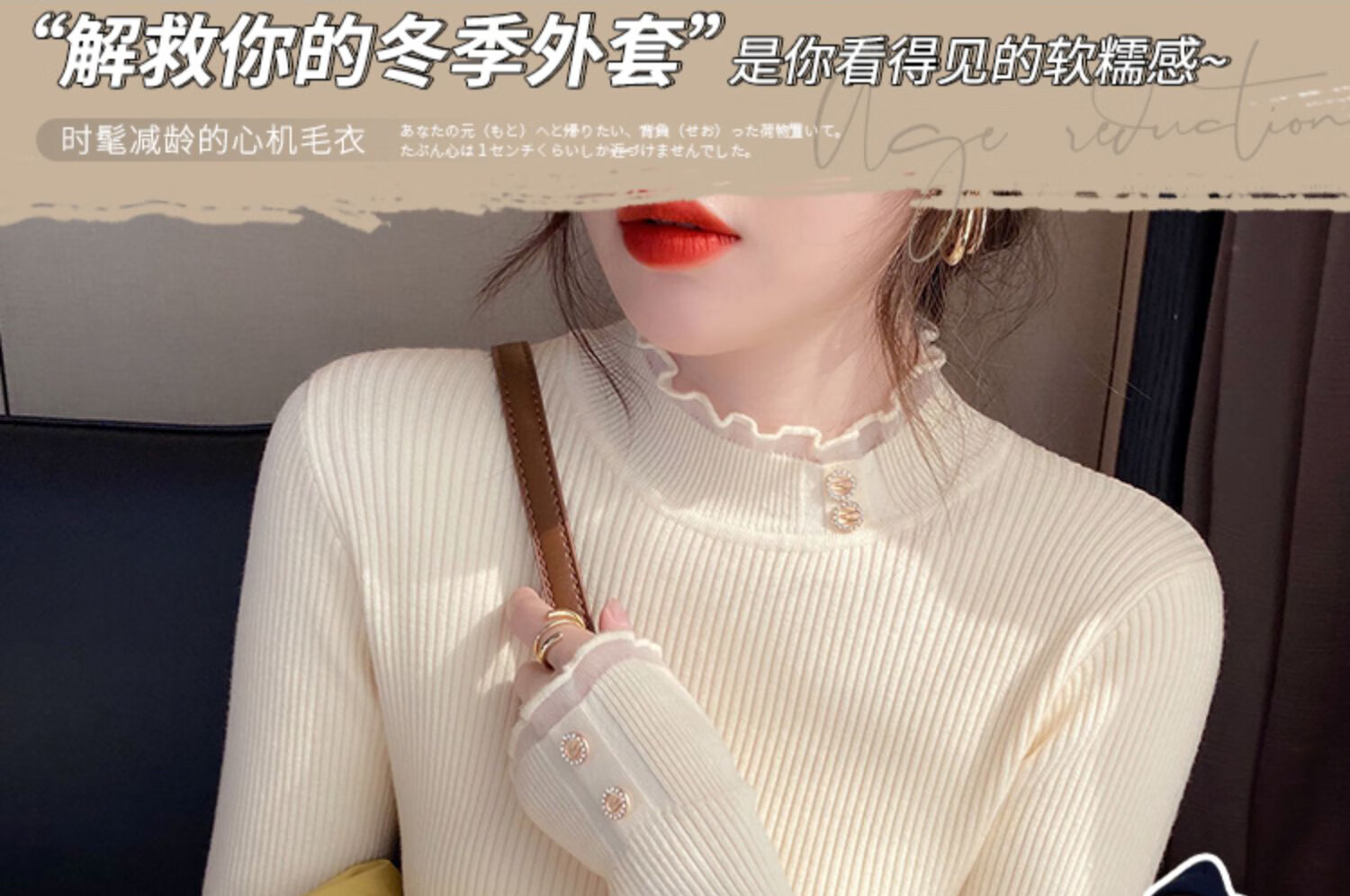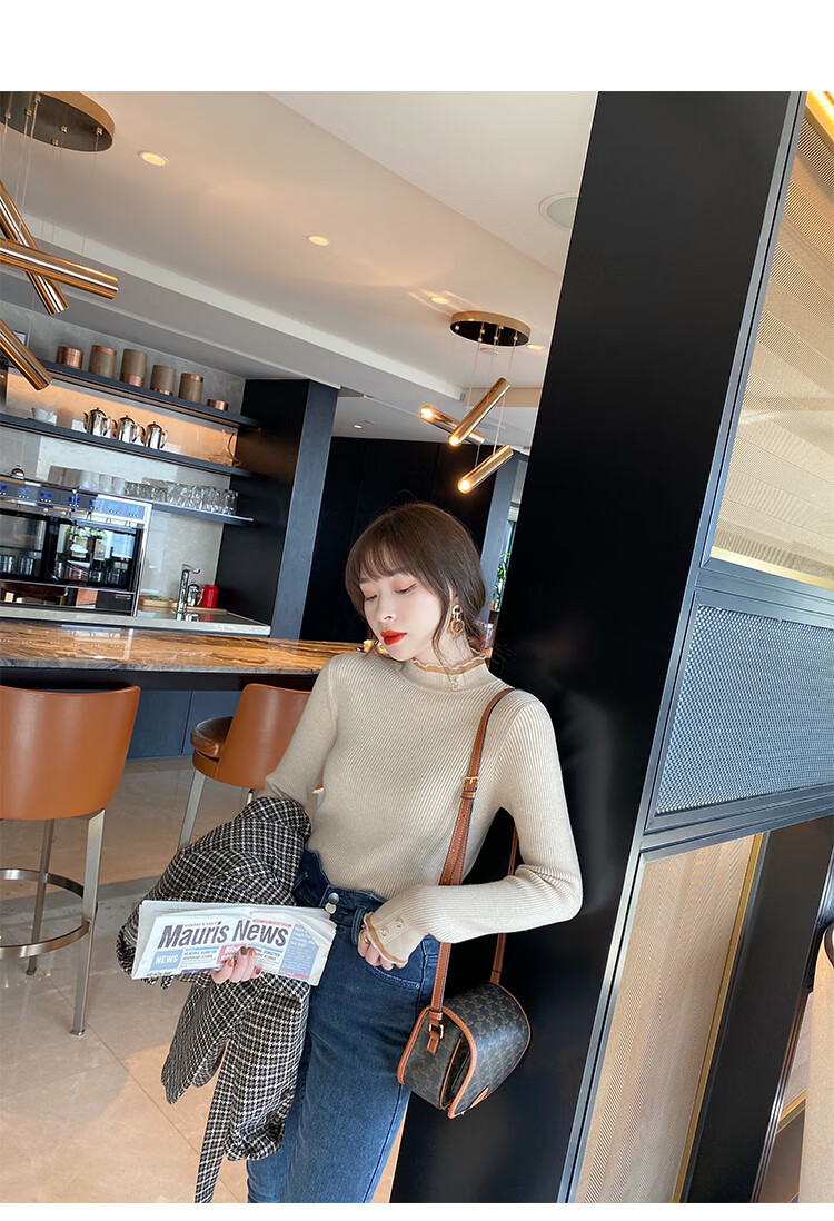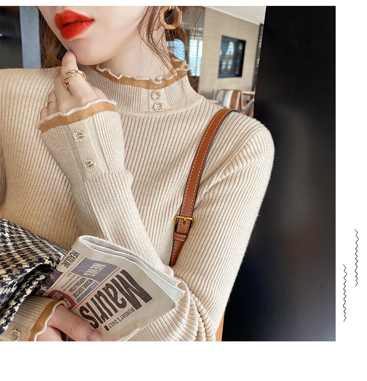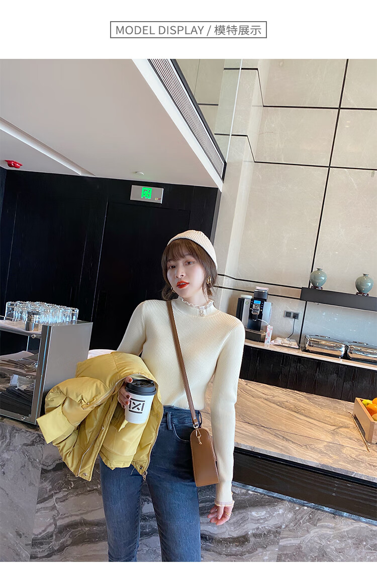 翊尚美毛衣女冬新款春秋季半高领针织衫女士打底衫修身显瘦蕾丝内搭上衣 杏色【春季薄款】 L 【115-140斤】
