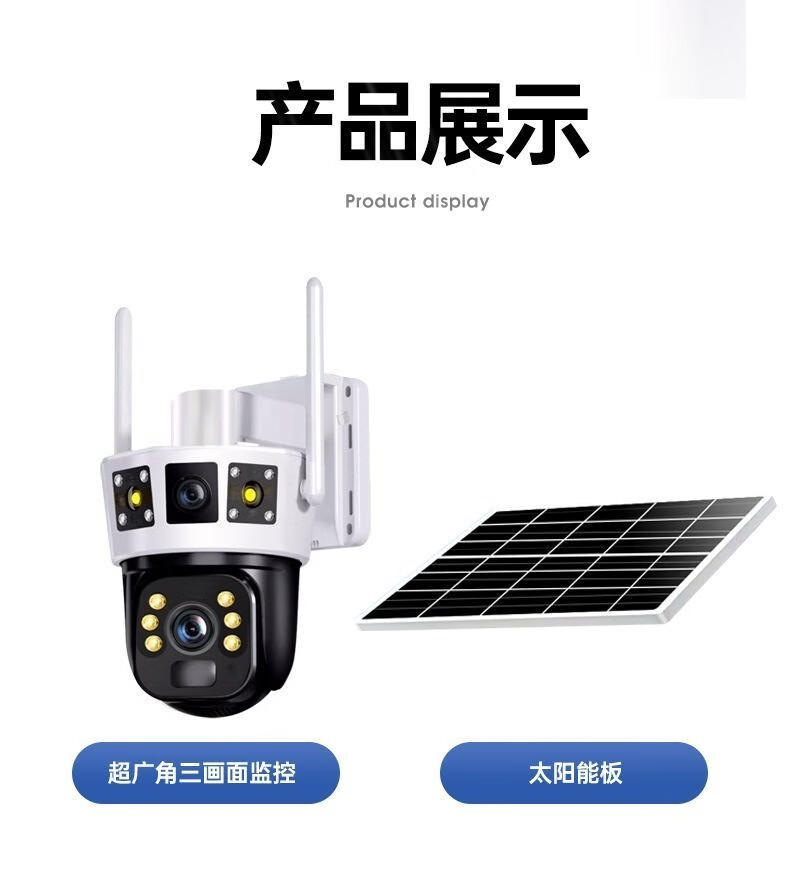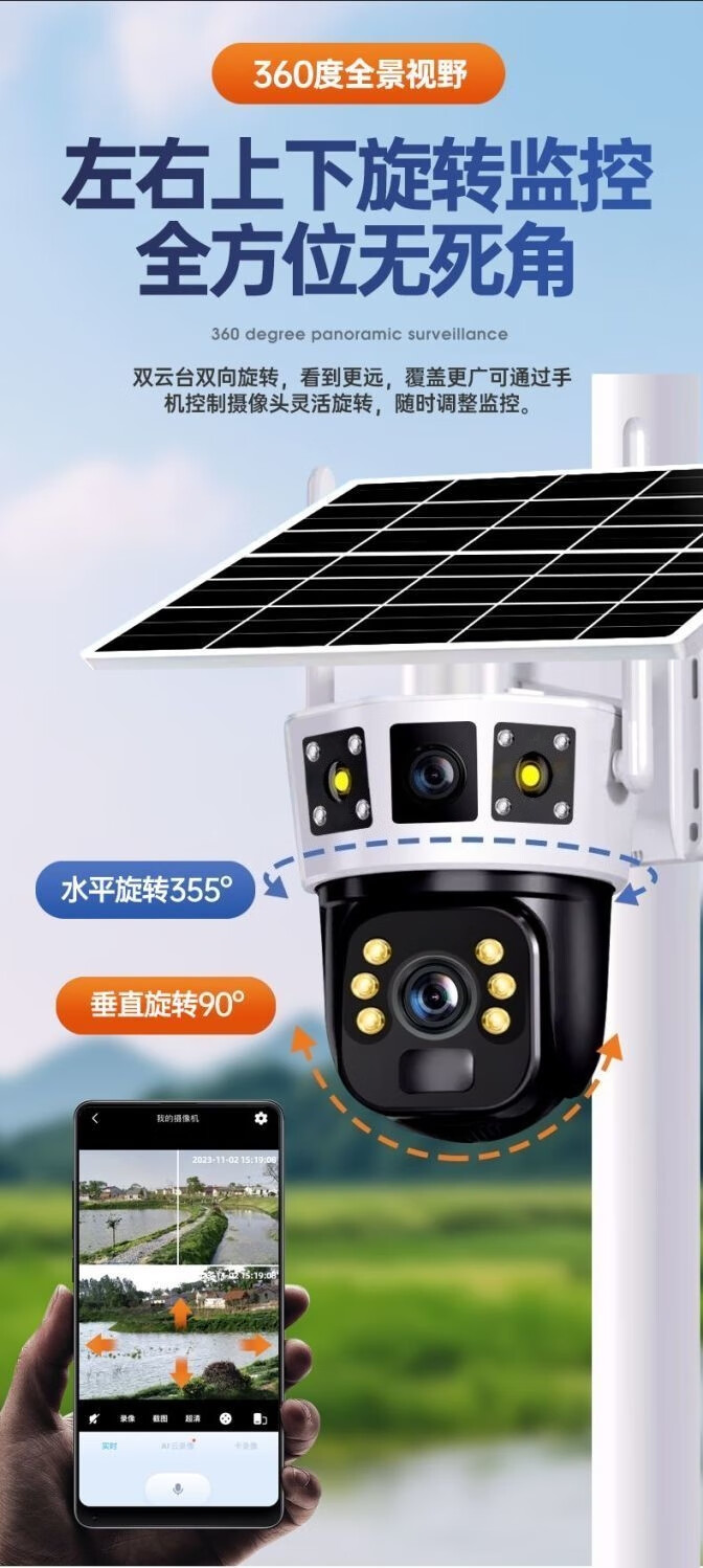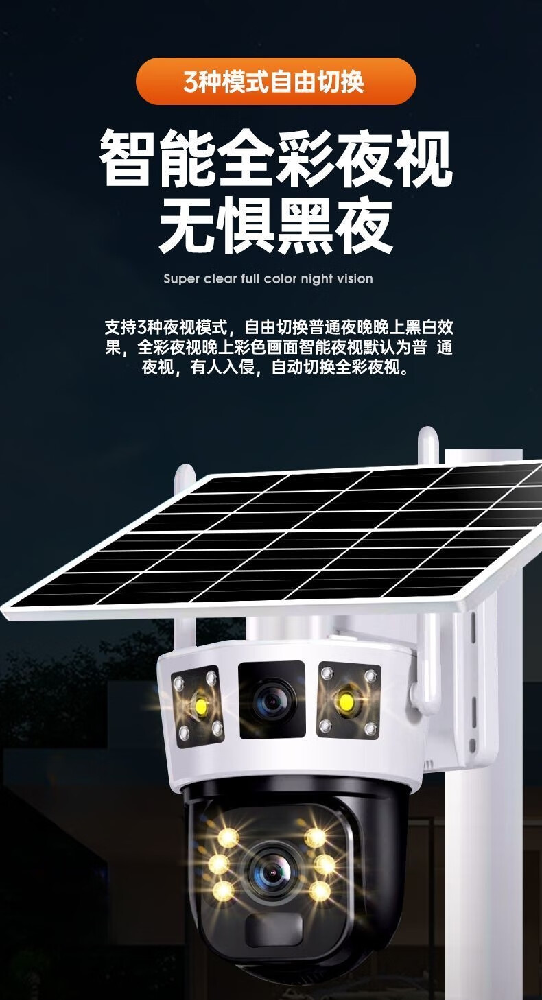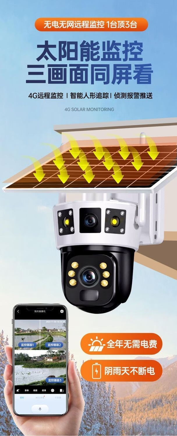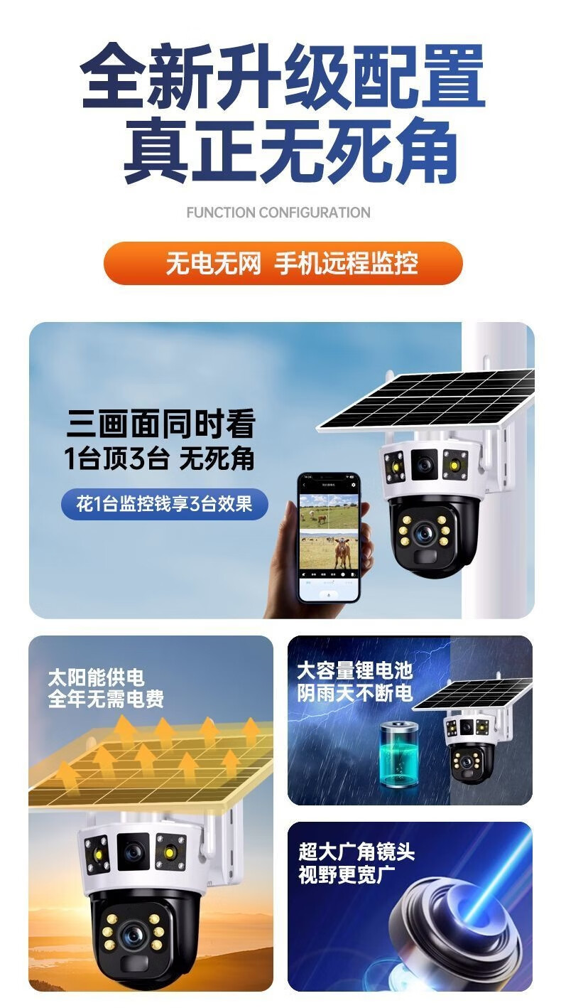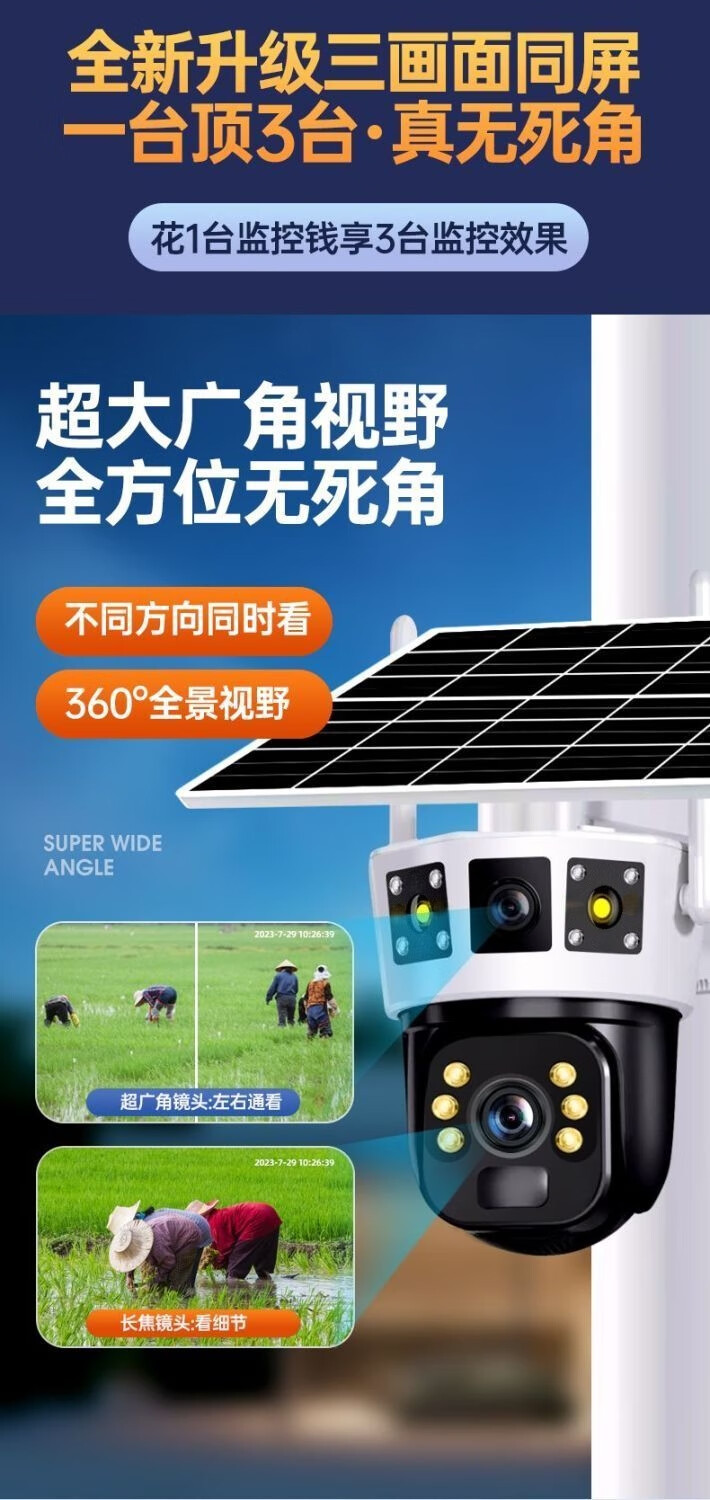 洛小嘉太阳能监控无电无网终身免费流量高清室外监控器360度全景无死角全彩带夜视追踪监控户外4G摄像头 太阳能三画面+流量免充值+30天循环录