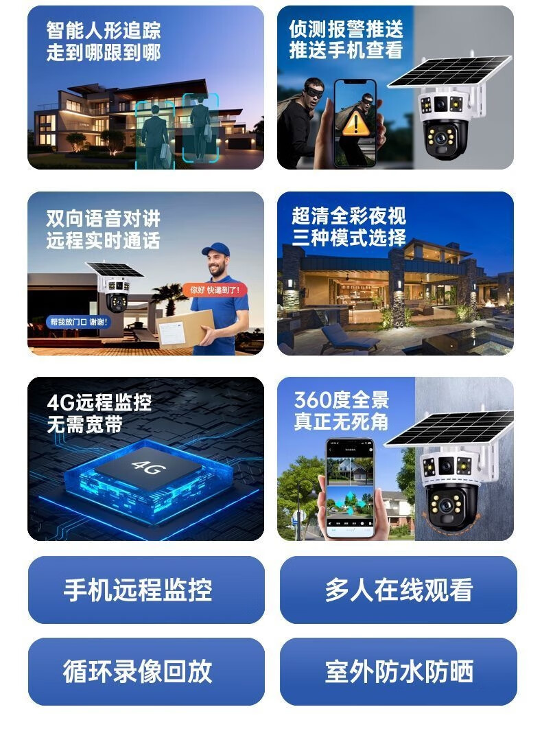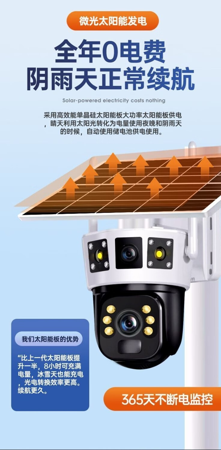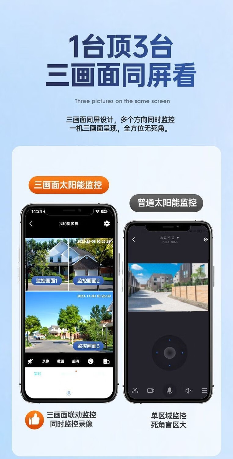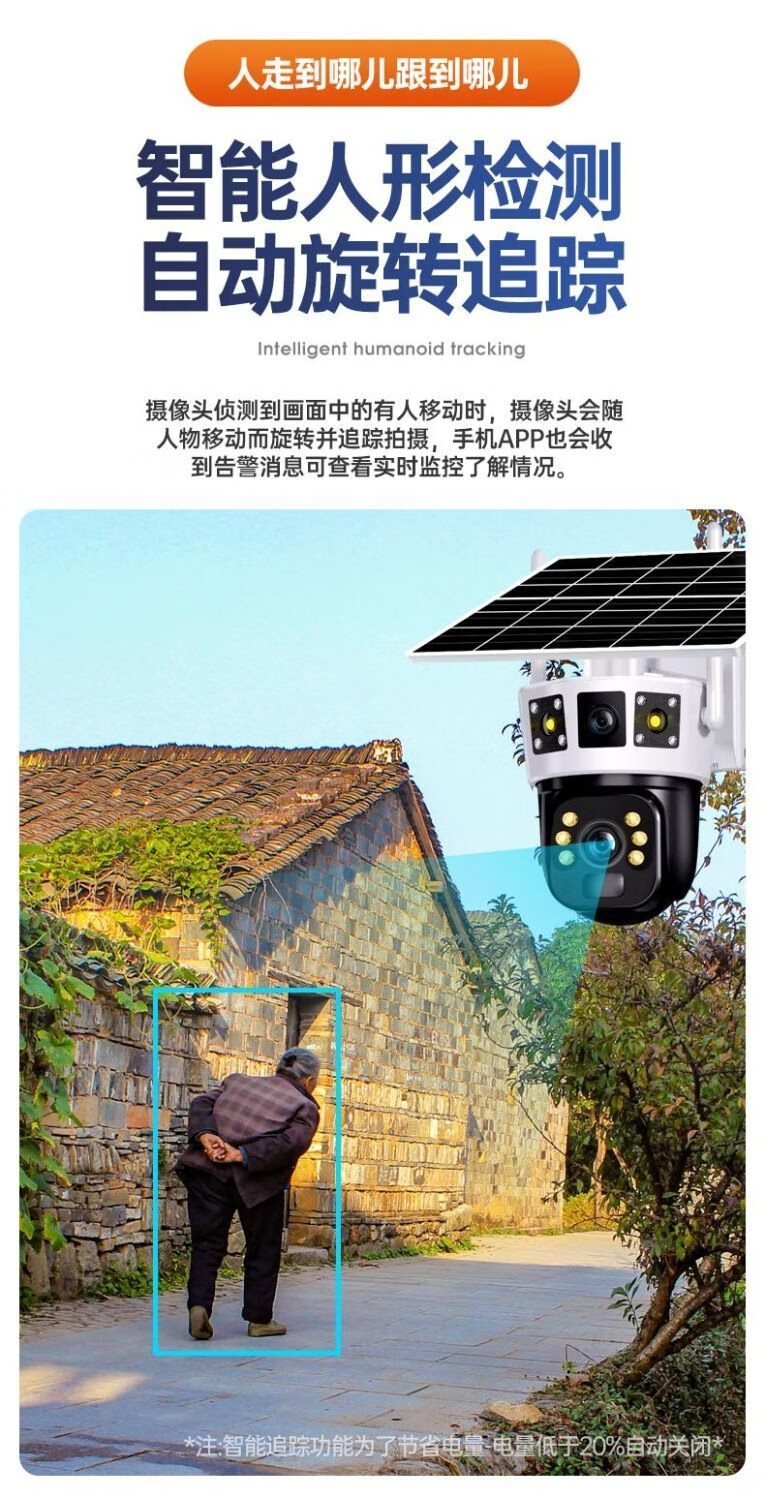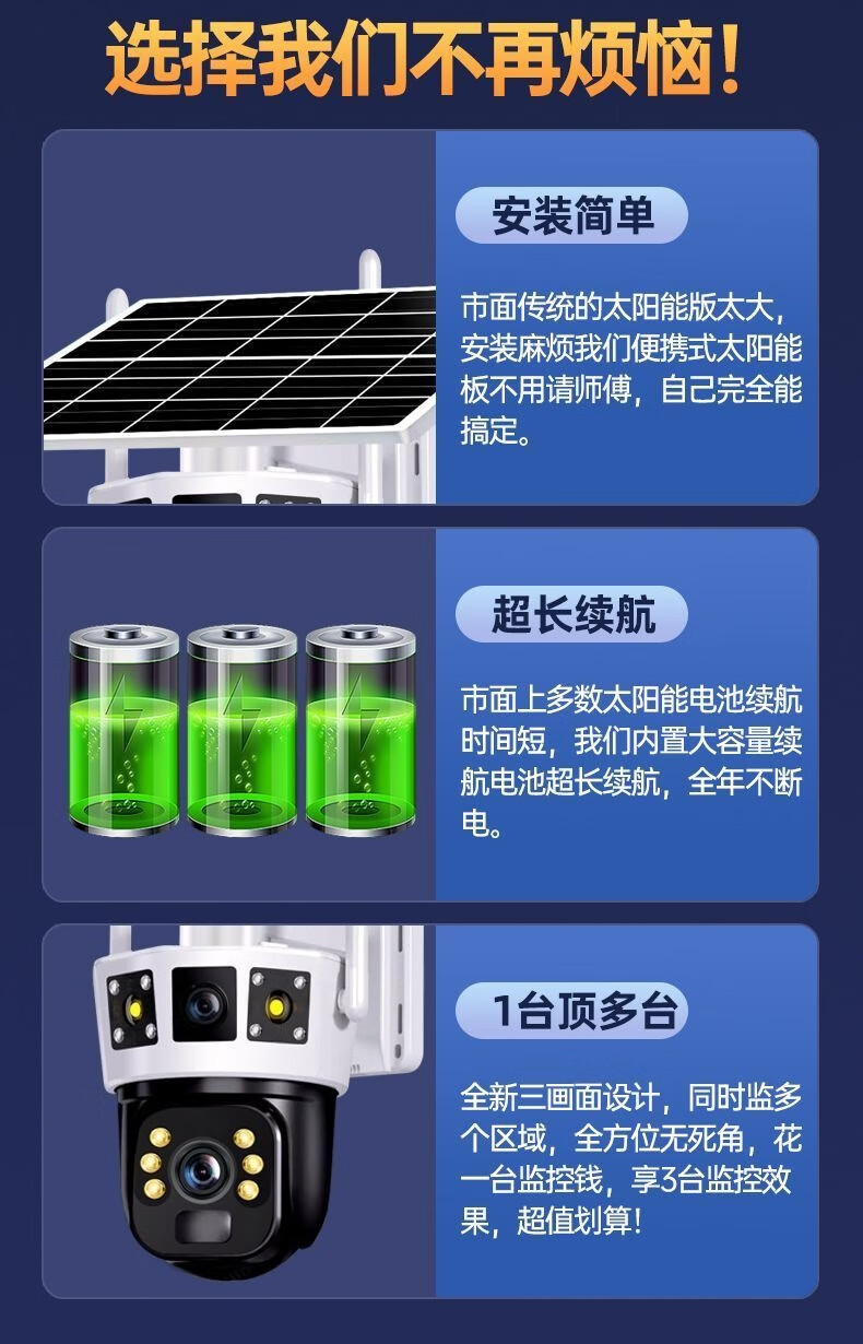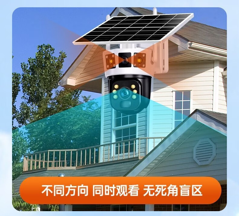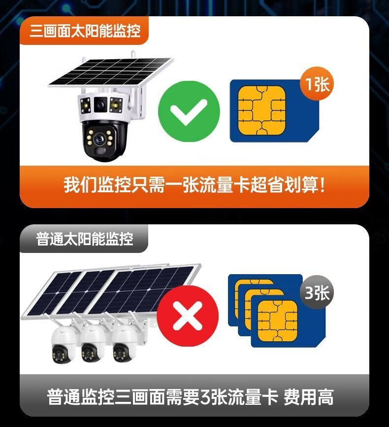 洛小嘉太阳能监控无电无网终身免费流量高清室外监控器360度全景无死角全彩带夜视追踪监控户外4G摄像头 太阳能三画面+流量免充值+30天循环录