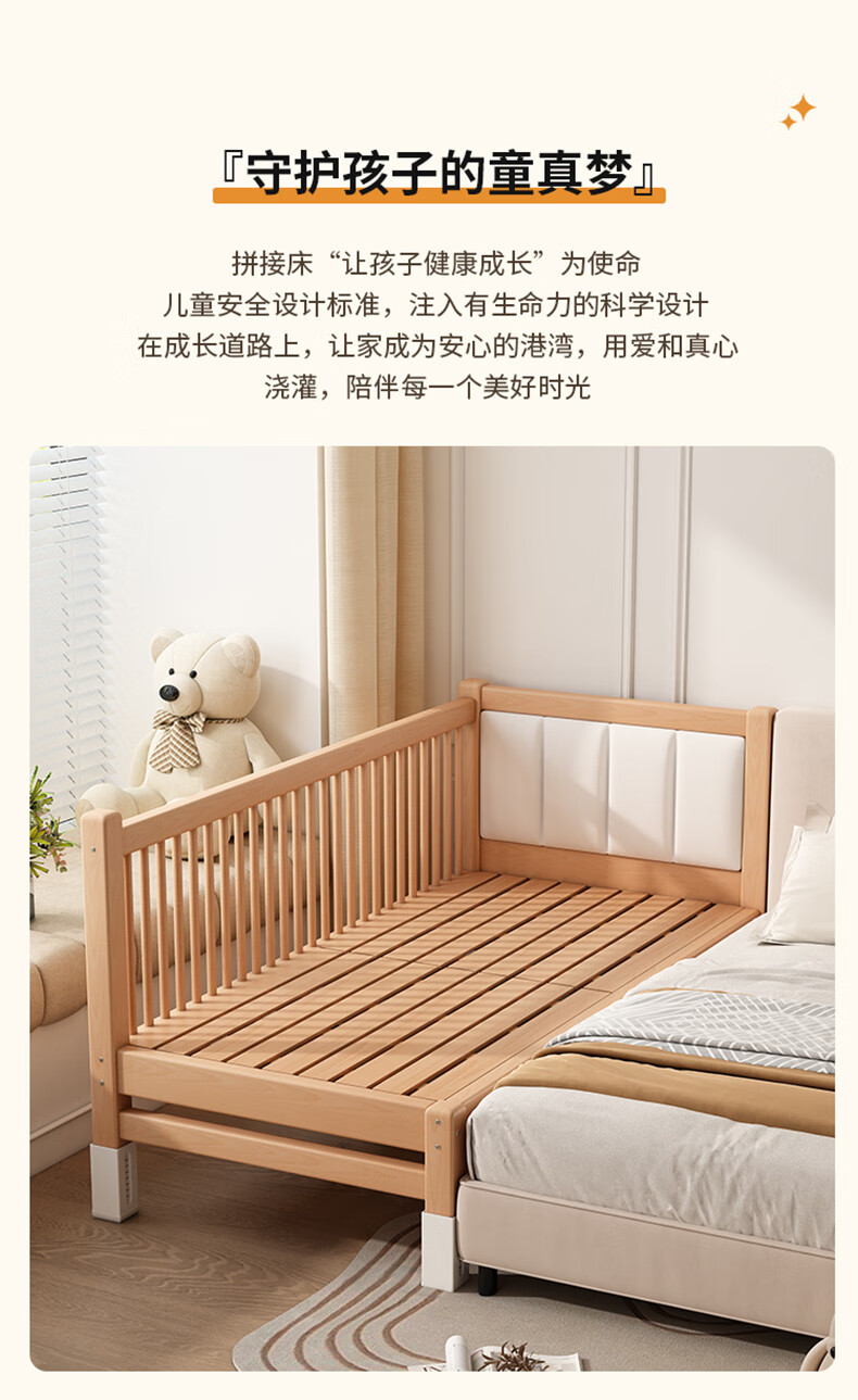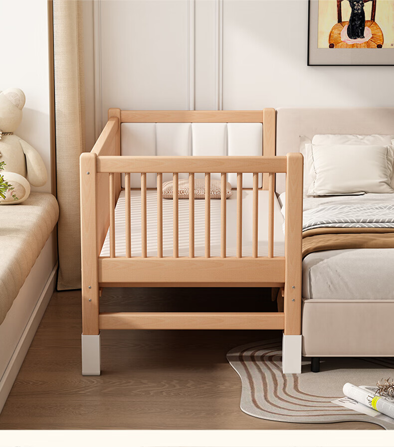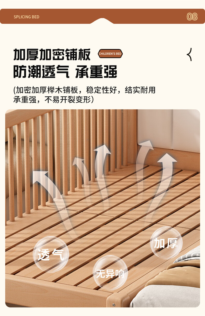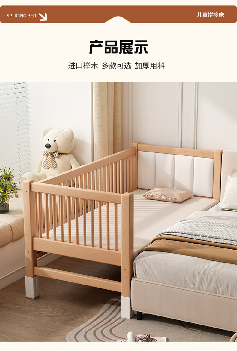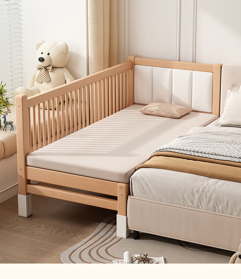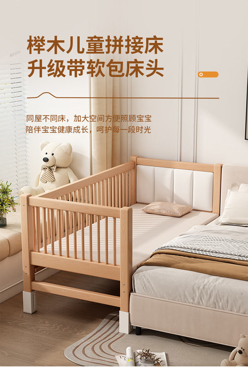 忆特佳榉木拼接床加宽床边小床带护栏宝宝婴儿床可调节带护栏实木单人床 三面护栏+8厘米空气纤维垫 200x100cm
