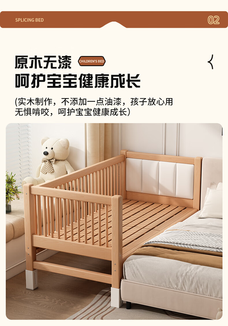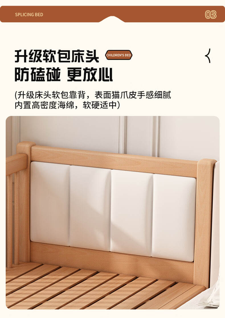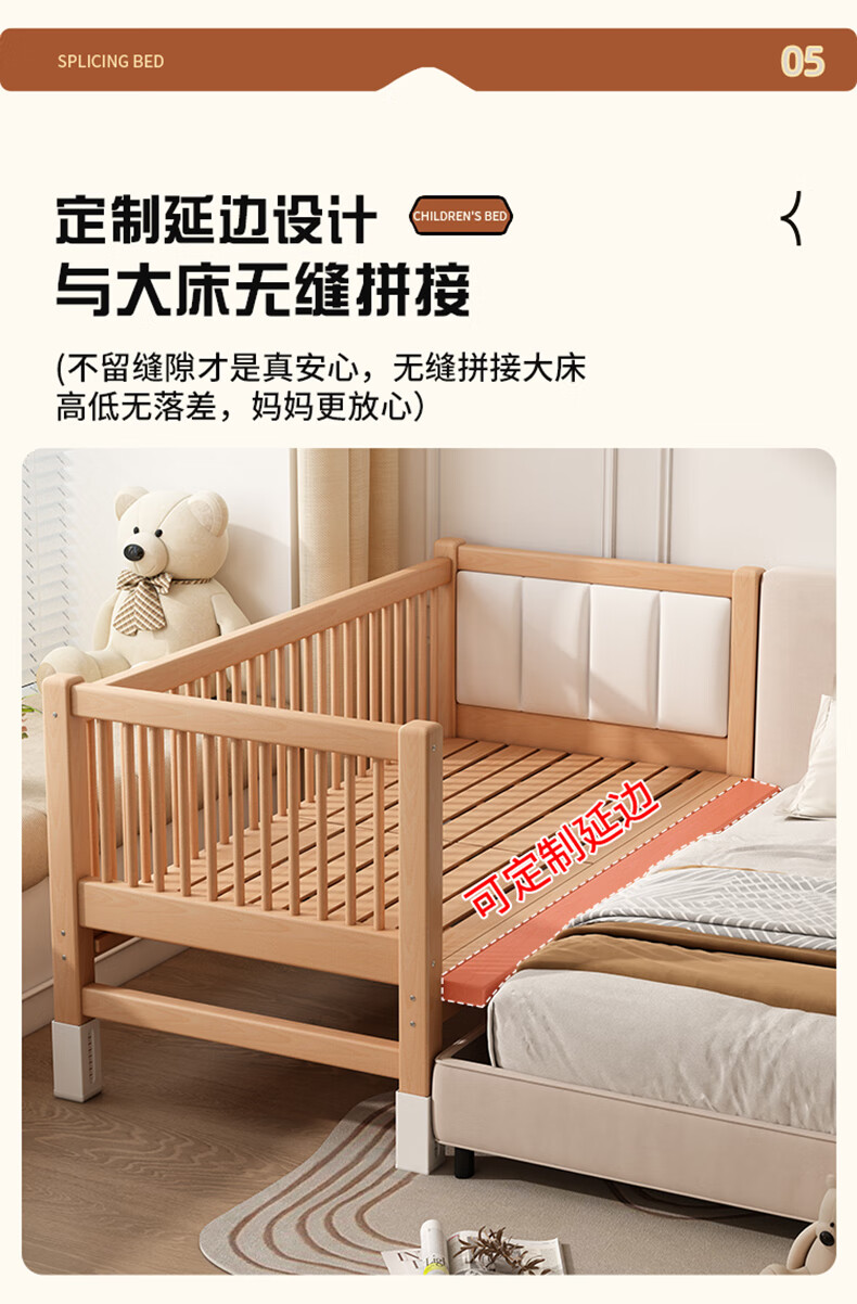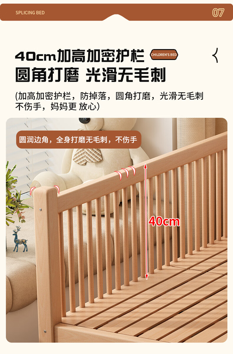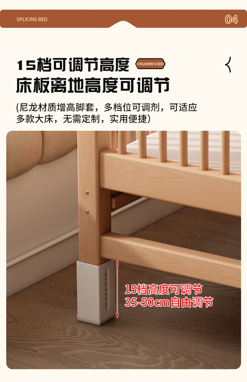 忆特佳榉木拼接床加宽床边小床带护栏宝宝婴儿床可调节带护栏实木单人床 三面护栏+8厘米空气纤维垫 200x100cm