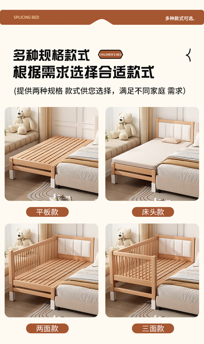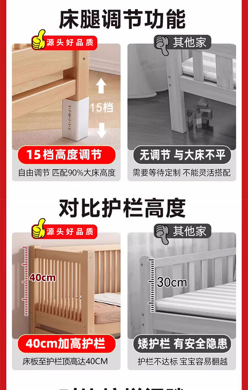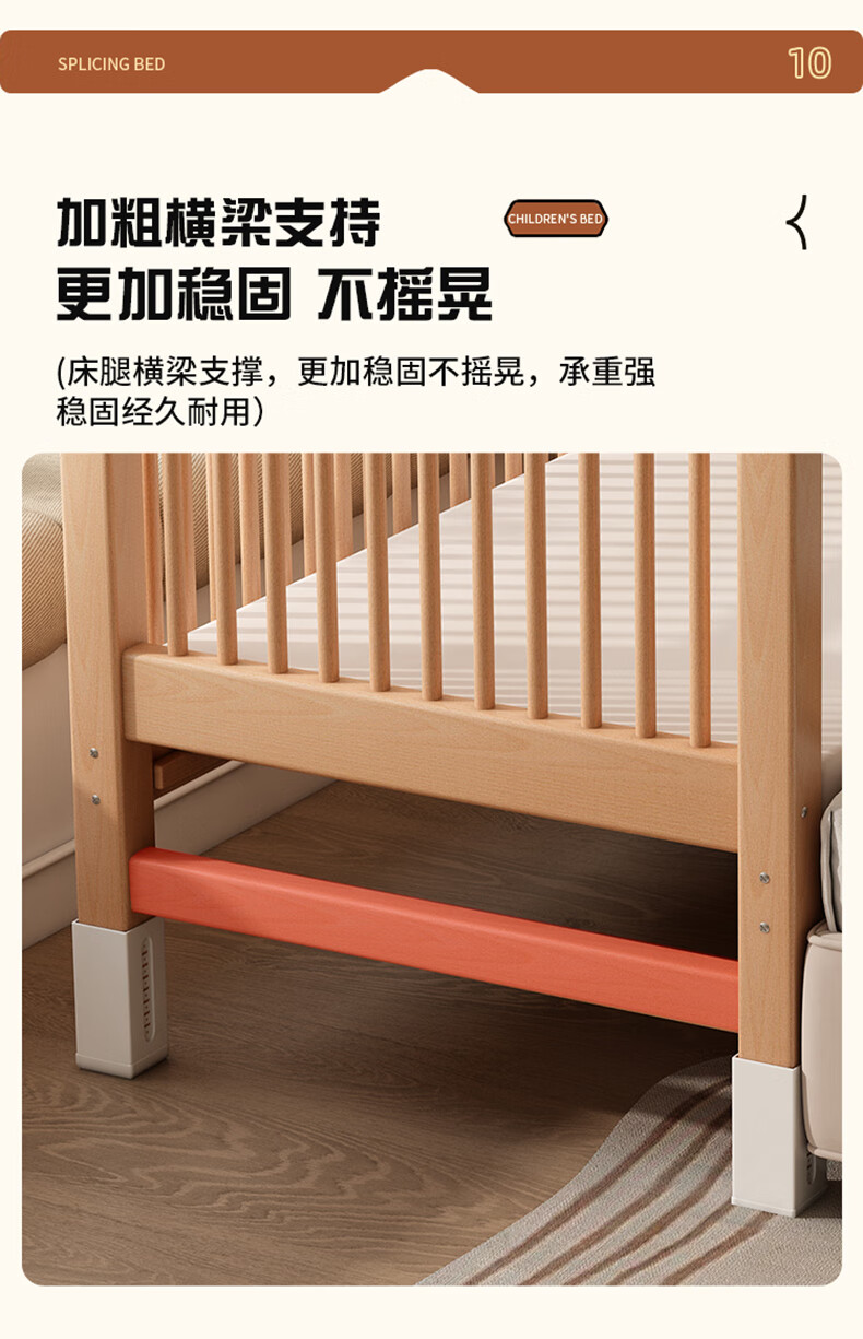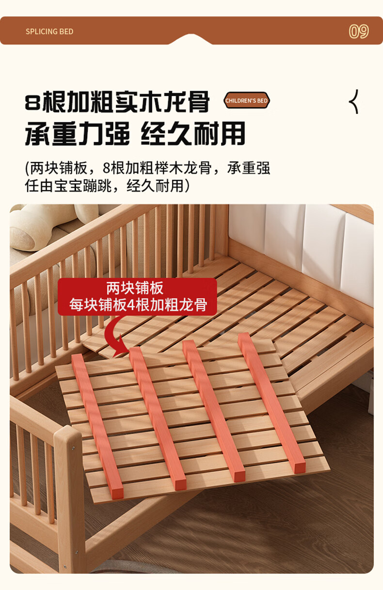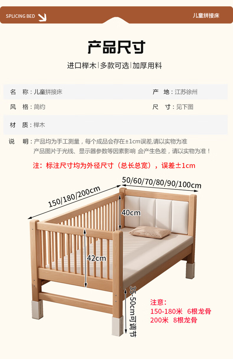 忆特佳榉木拼接床加宽床边小床带护栏宝宝婴儿床可调节带护栏实木单人床 三面护栏+8厘米空气纤维垫 200x100cm