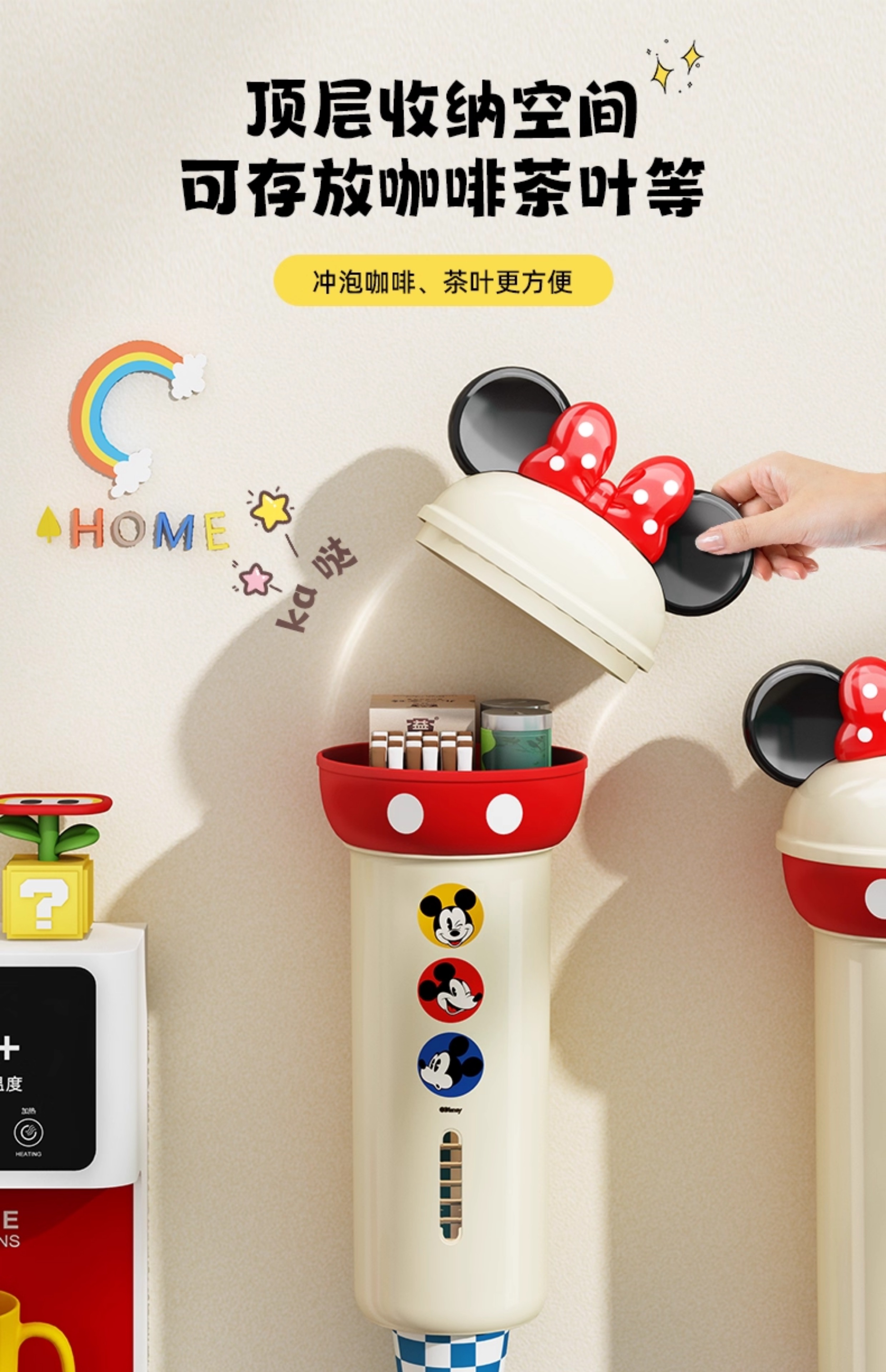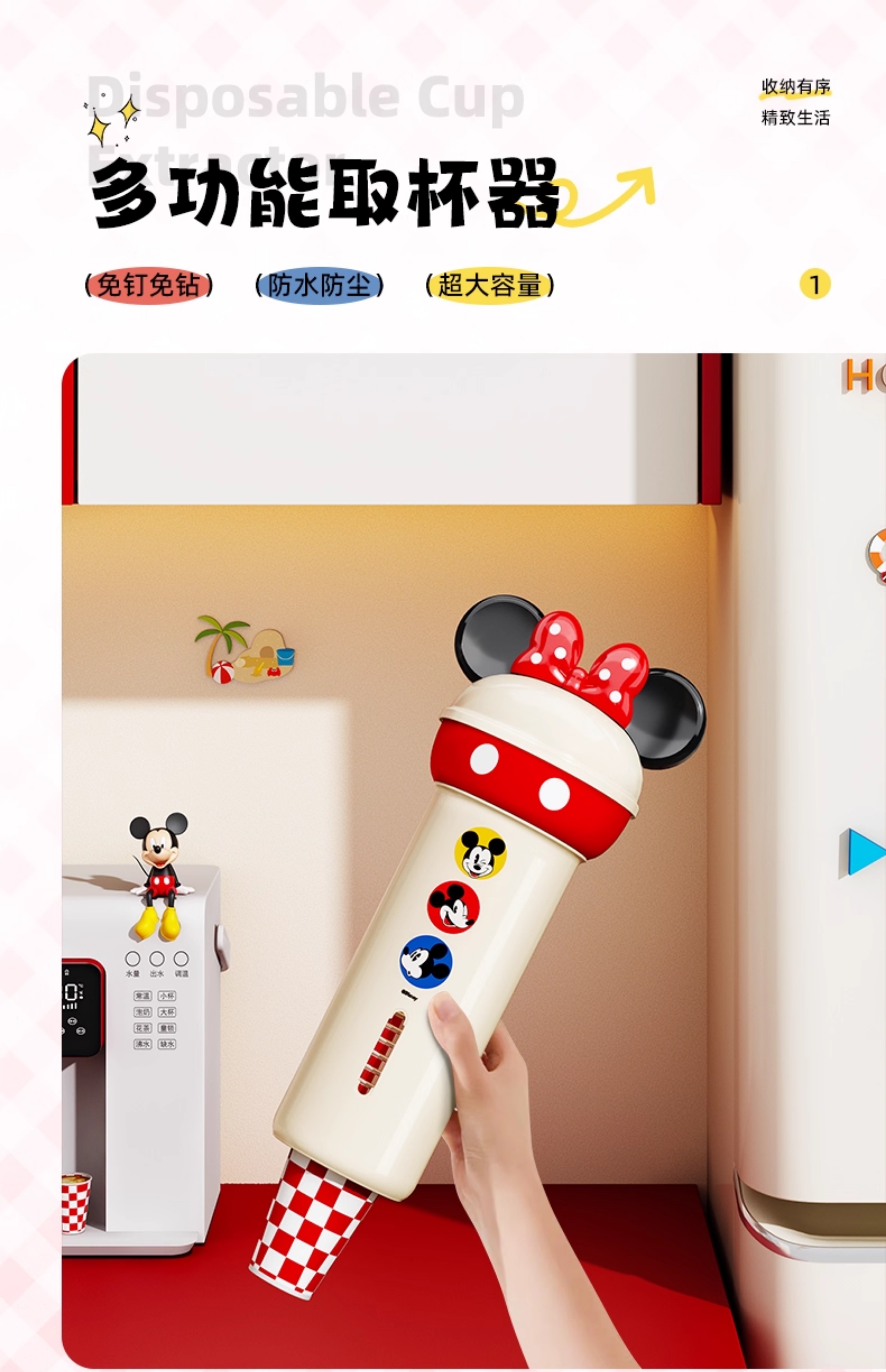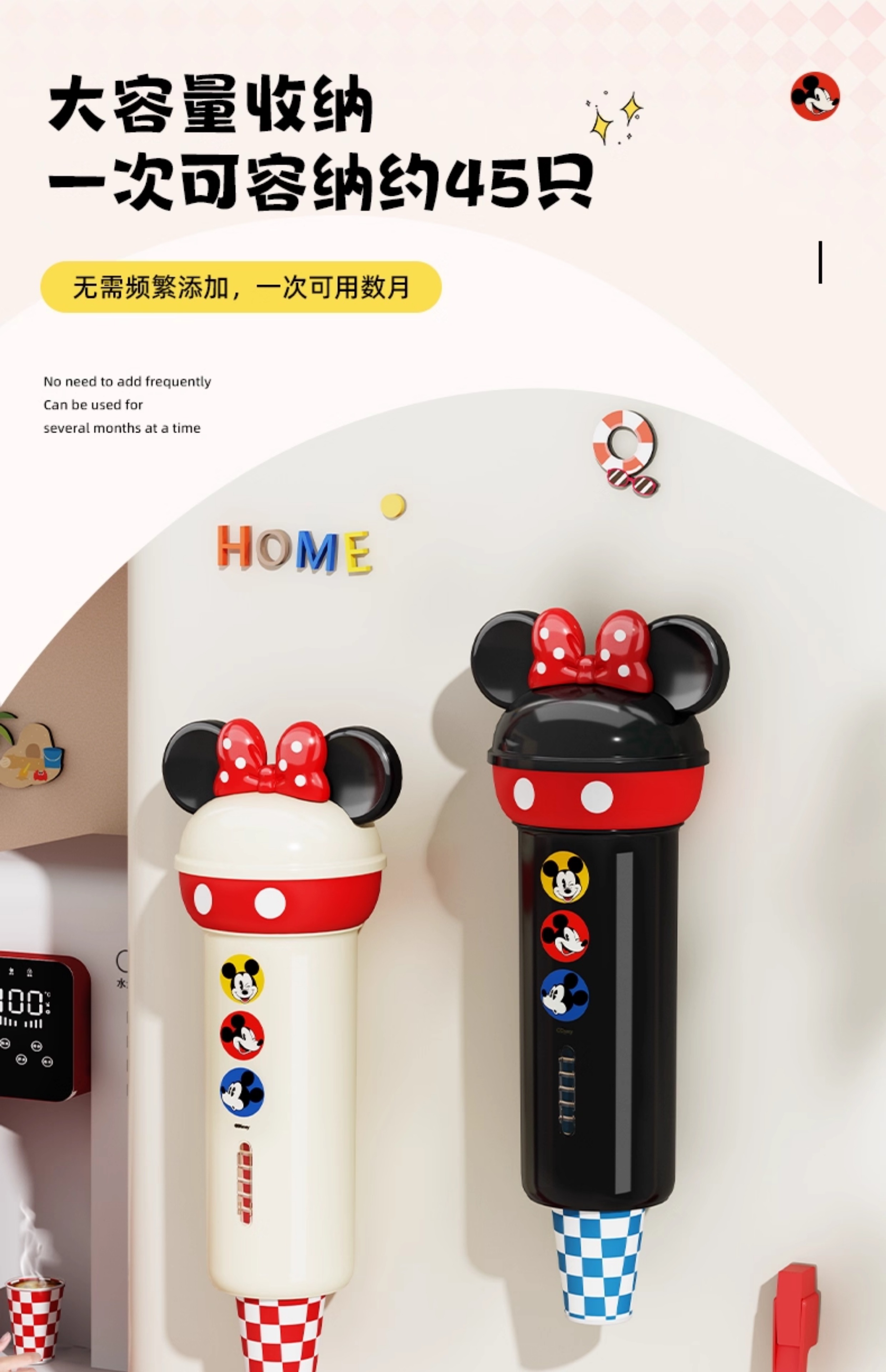 吱凡迪士尼正版日本杯子收纳盒置物架一次性杯子架取杯器壁挂式水杯架 【约放50个杯子】奶油色 【正版授权 顶部可收纳】