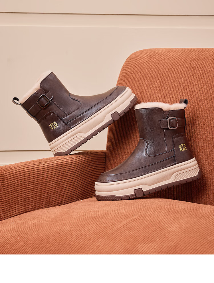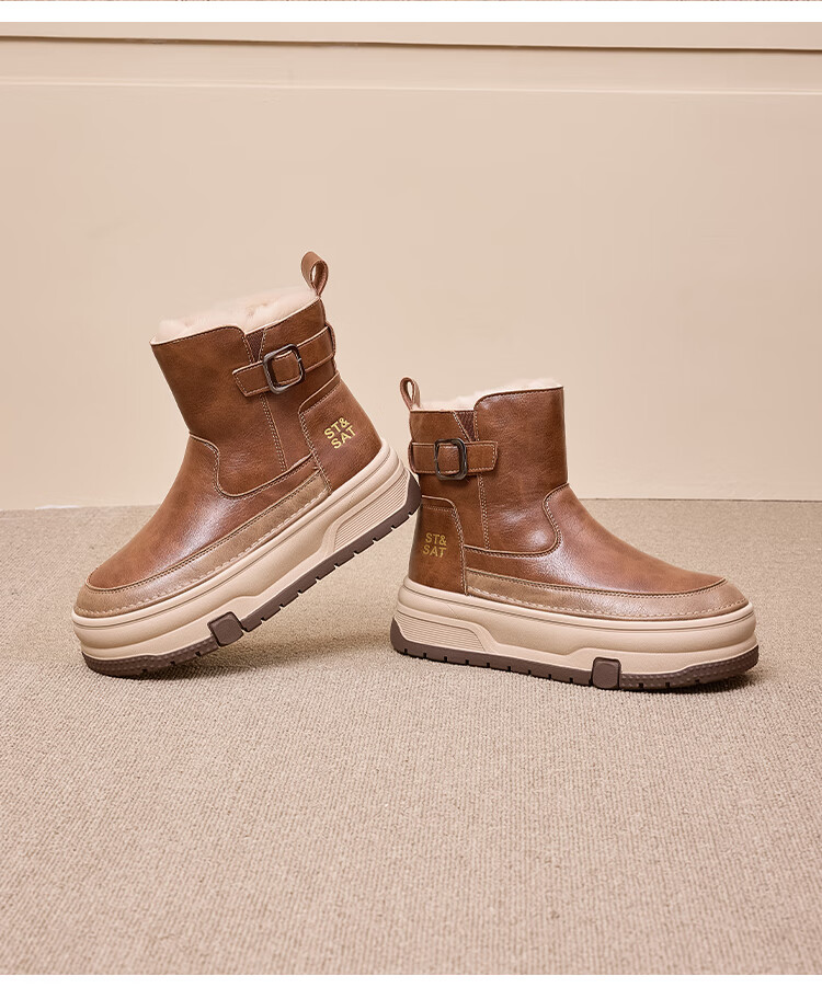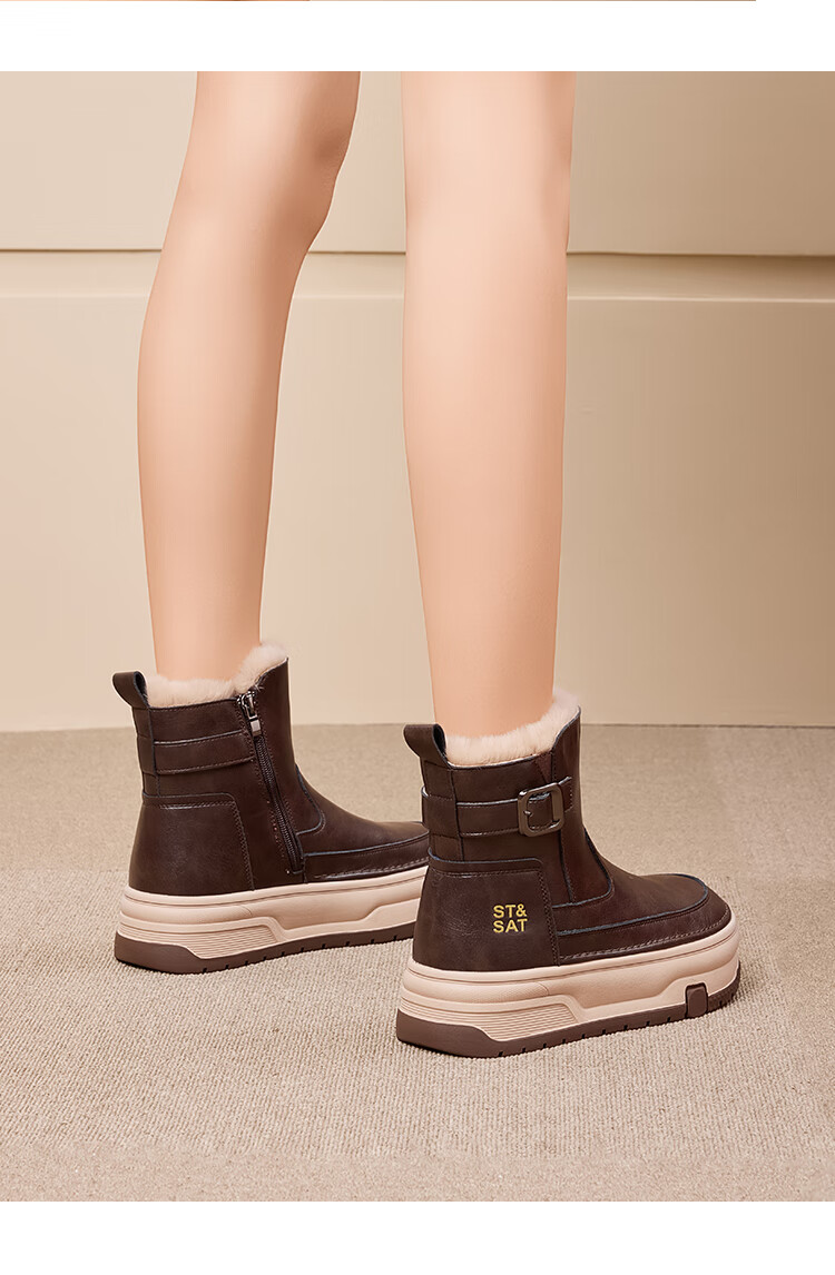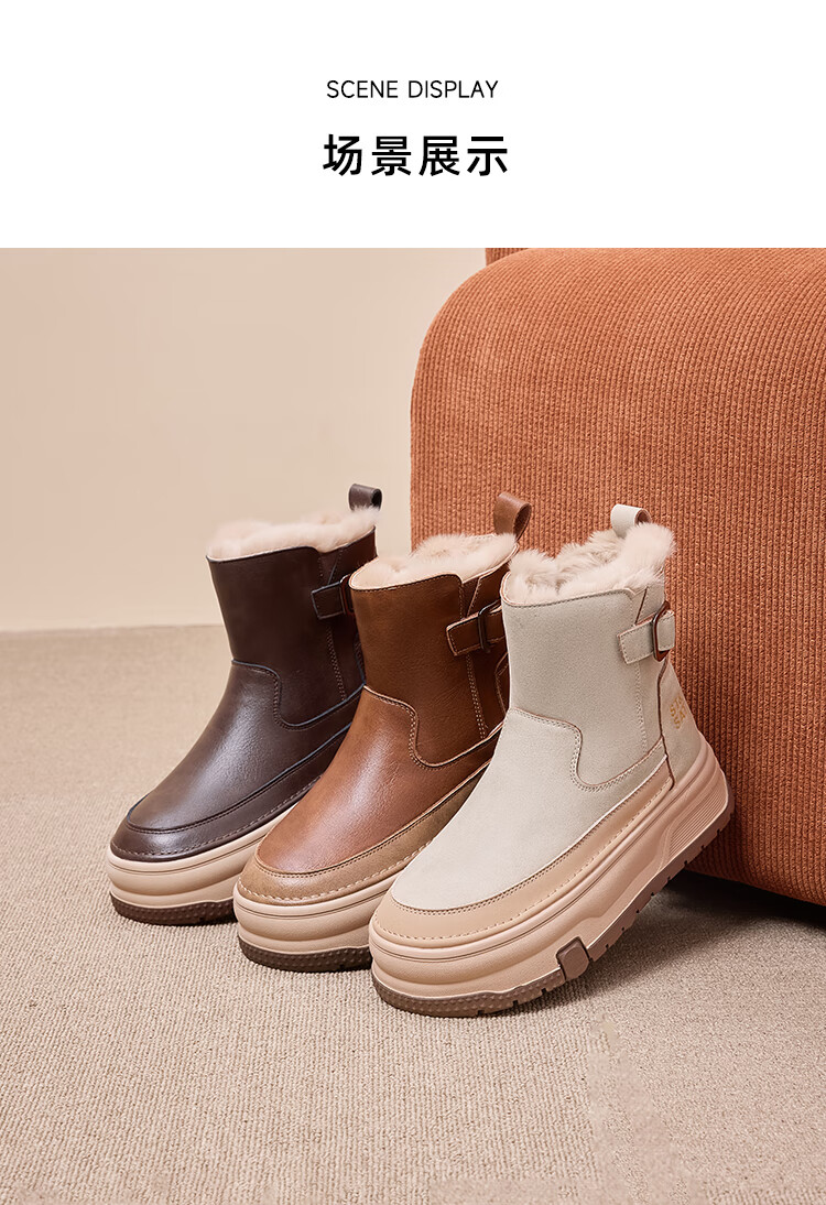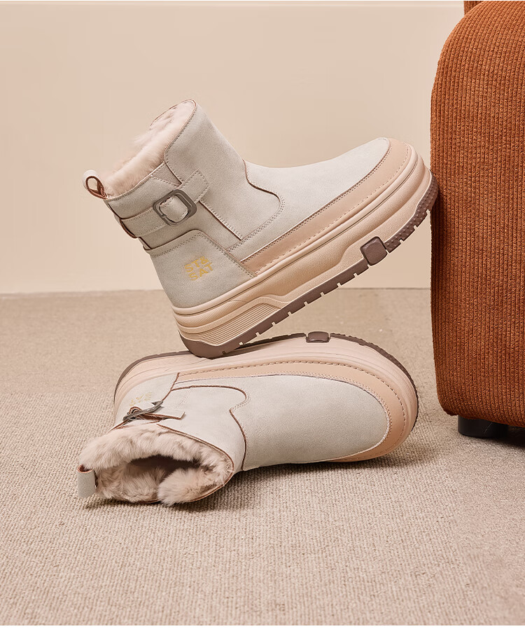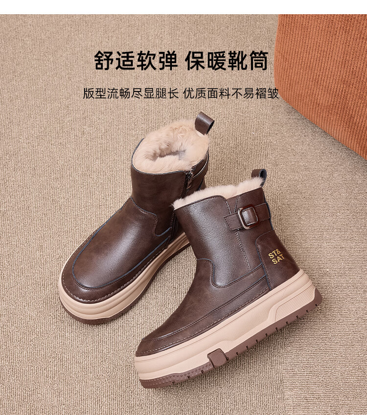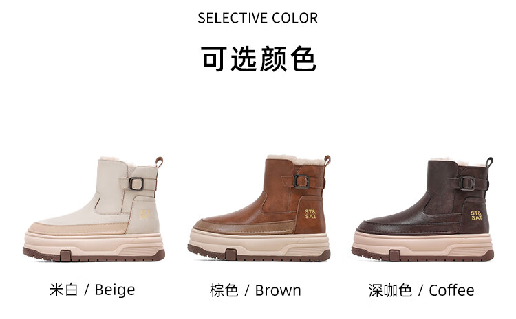 星期六厚底雪地靴女款2025新款秋冬保暖绒里小皮鞋增高户外保暖棉鞋短靴 米白 37